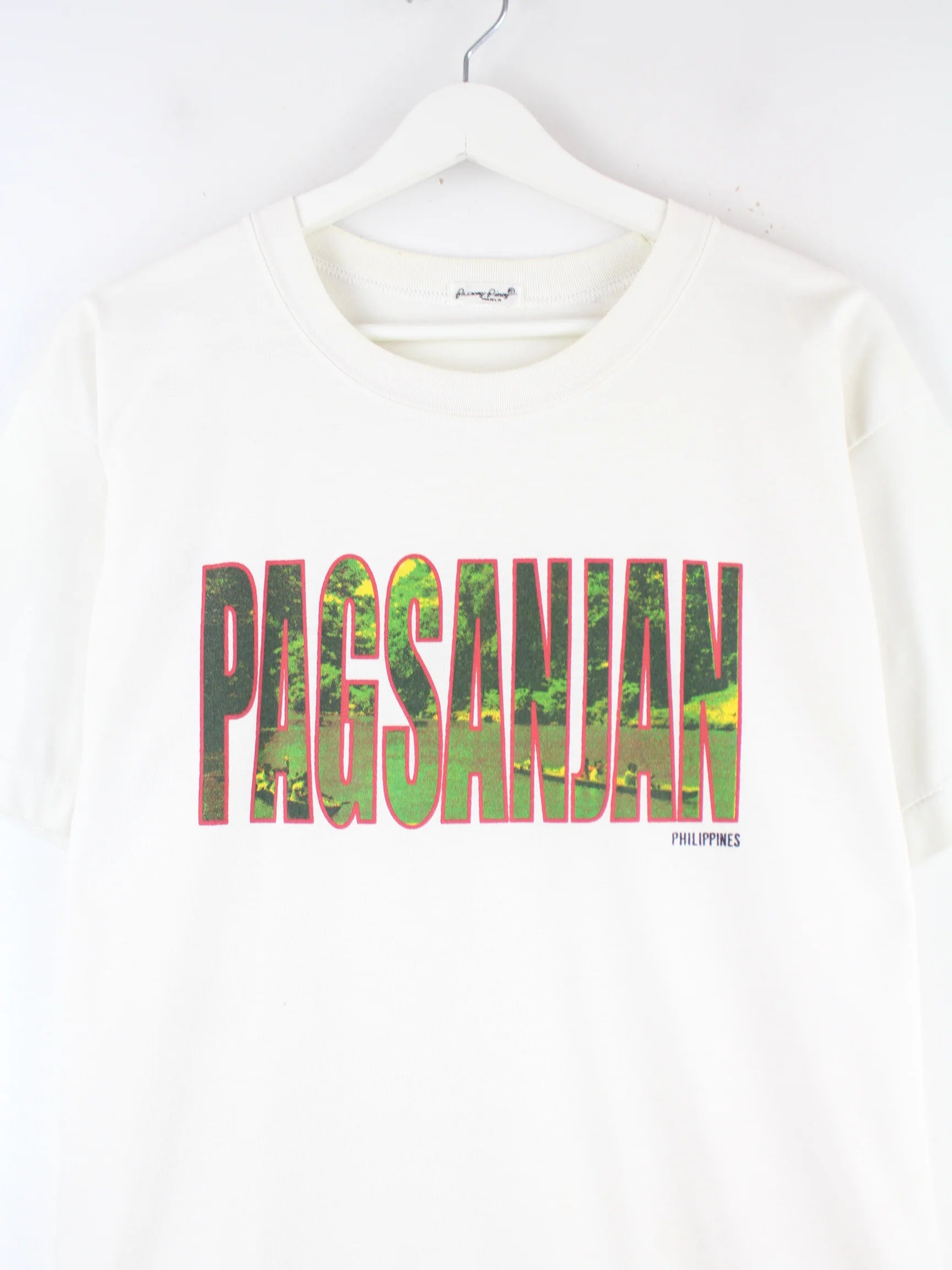 Vintage T-Shirt in Größe L aus den 90'ern. Es ist aus Baumwolle gemacht und in Weiß bei uns vorrätig. Mit tollem Philippines Print.