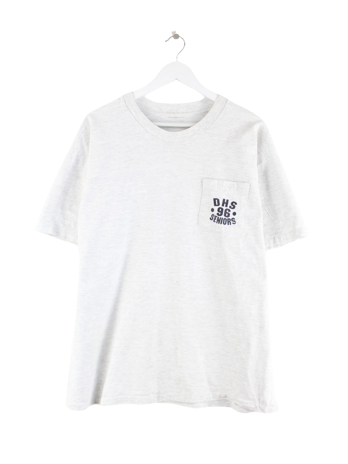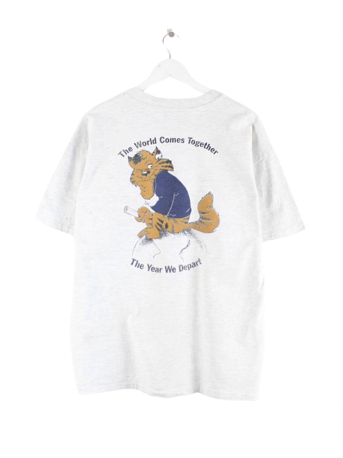 Vintage T-Shirt in Größe XL aus den 90'ern. Es ist aus Baumwolle produziert und in Grau im Bestand. Mit schönem 90s Print.