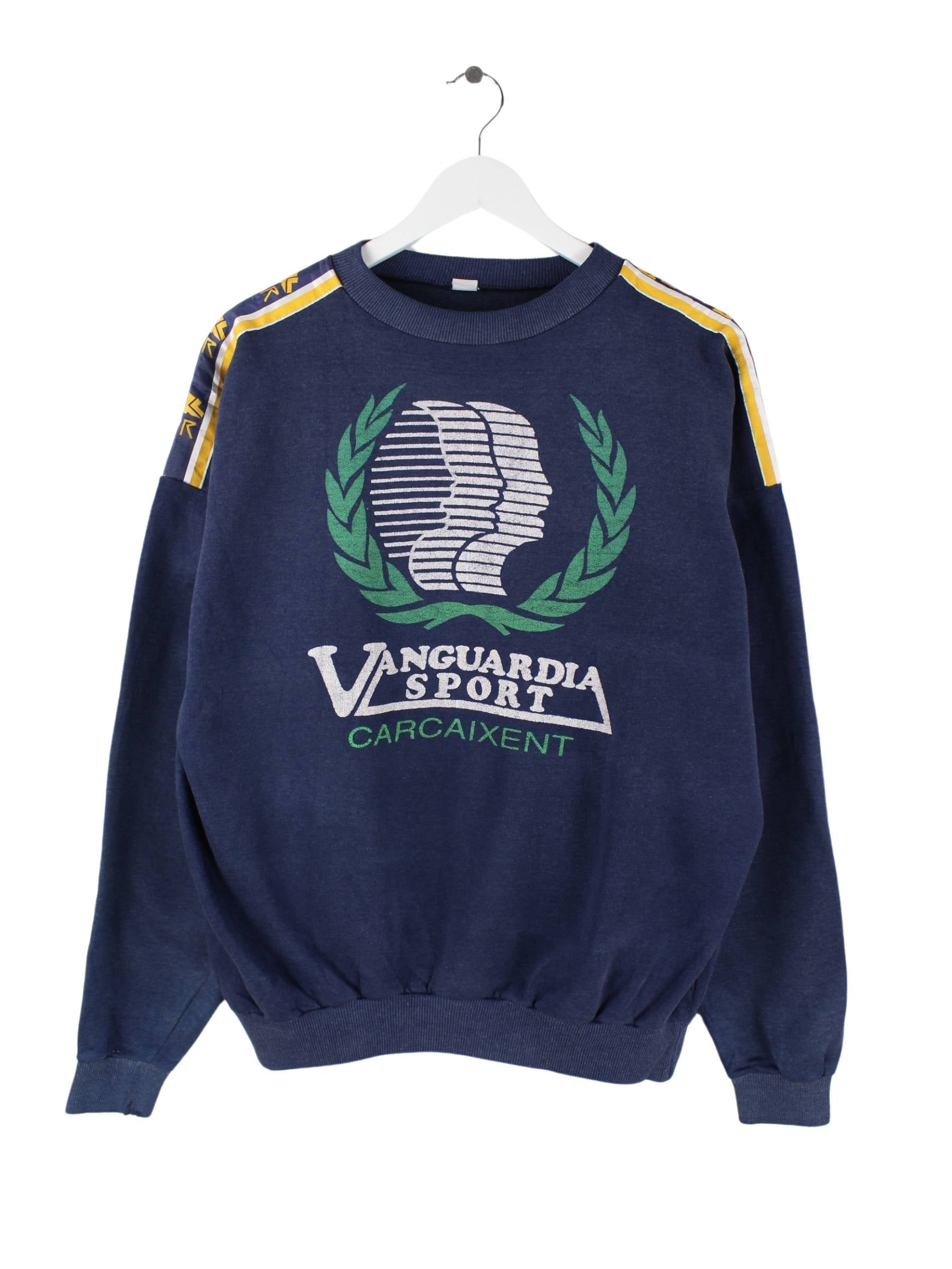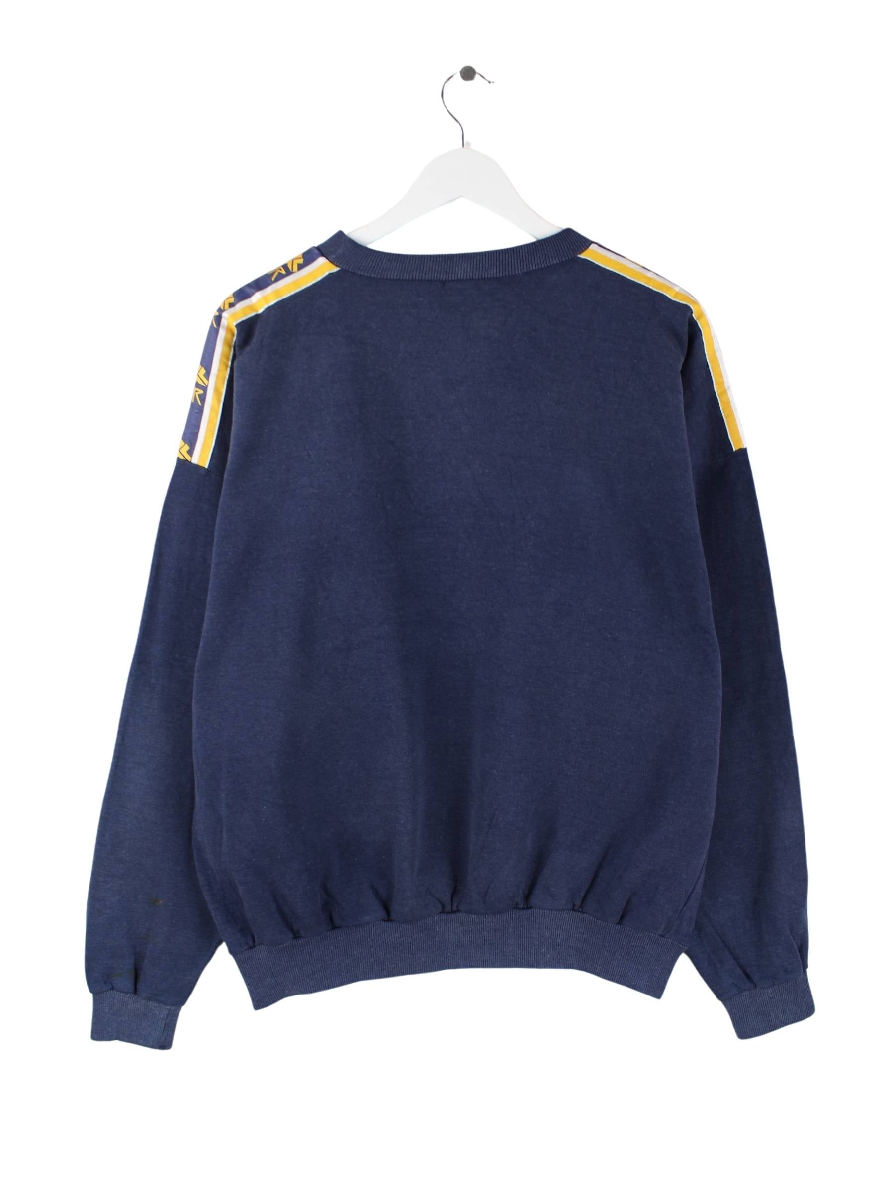Blauer Vintage Sweater aus den 90'ern in Größe L. Er ist aus einer Baumwollmischung und in gutem Zustand bei uns vorrätig. Mit seltenem 90s Print.