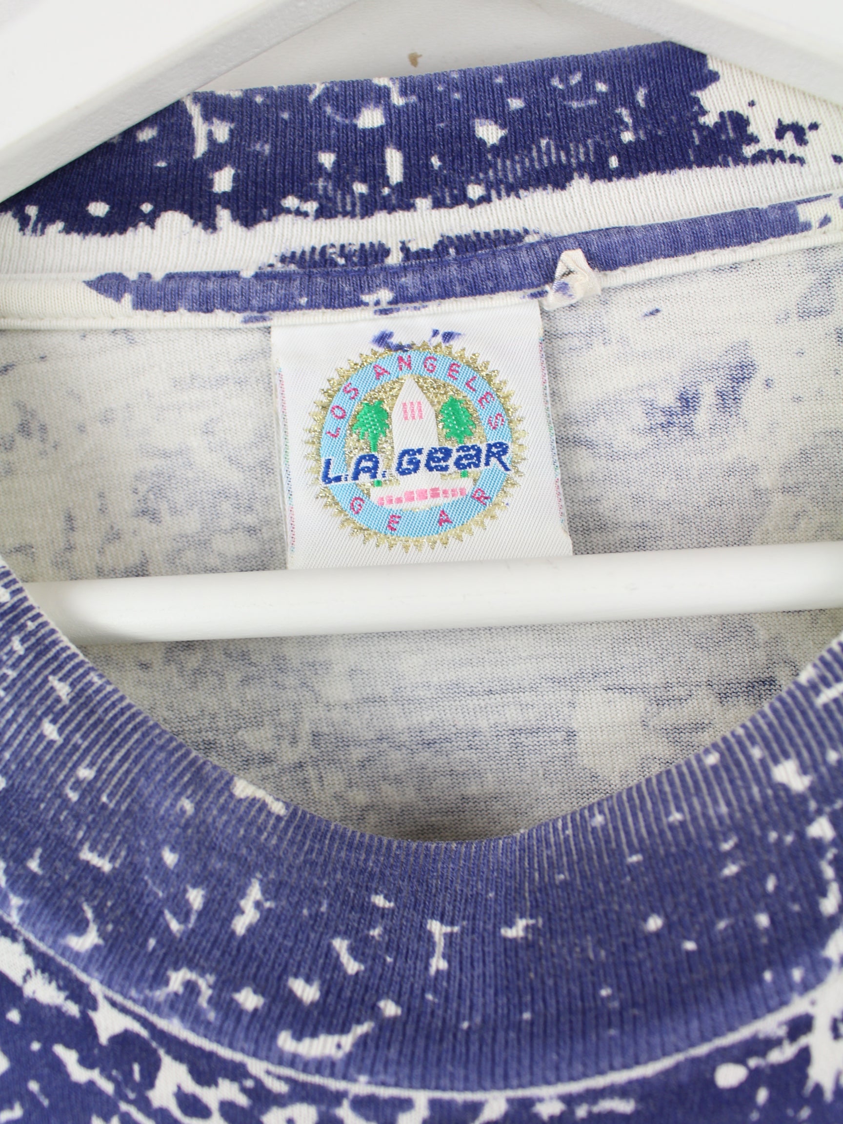 Blaues Vintage T-Shirt aus den 90'ern in Größe L. Es ist aus Baumwolle angefertigt und in sehr gutem Zustand vorrätig. Mit seltenem Splash Print.