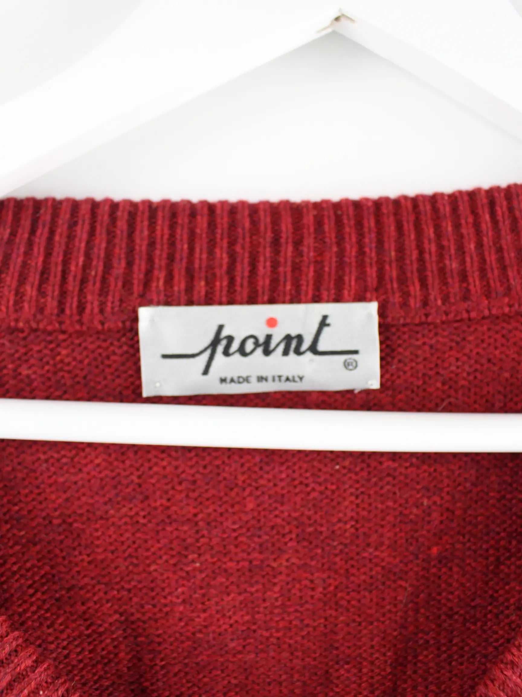 Roter Vintage Pullover aus den 90'ern in Größe L. Er ist aus einer Wollmischung hergestellt und in sehr gutem Zustand im Bestand.