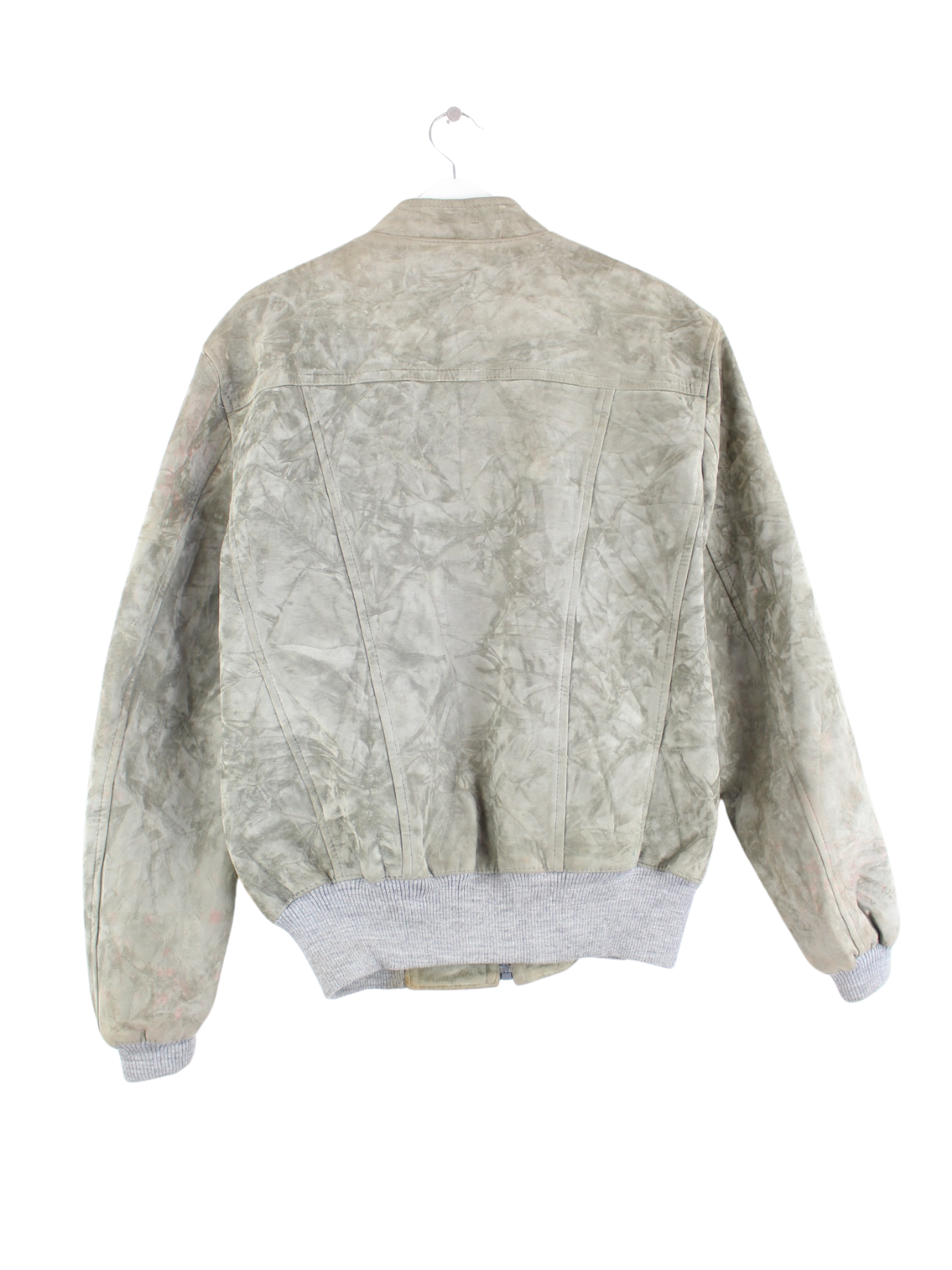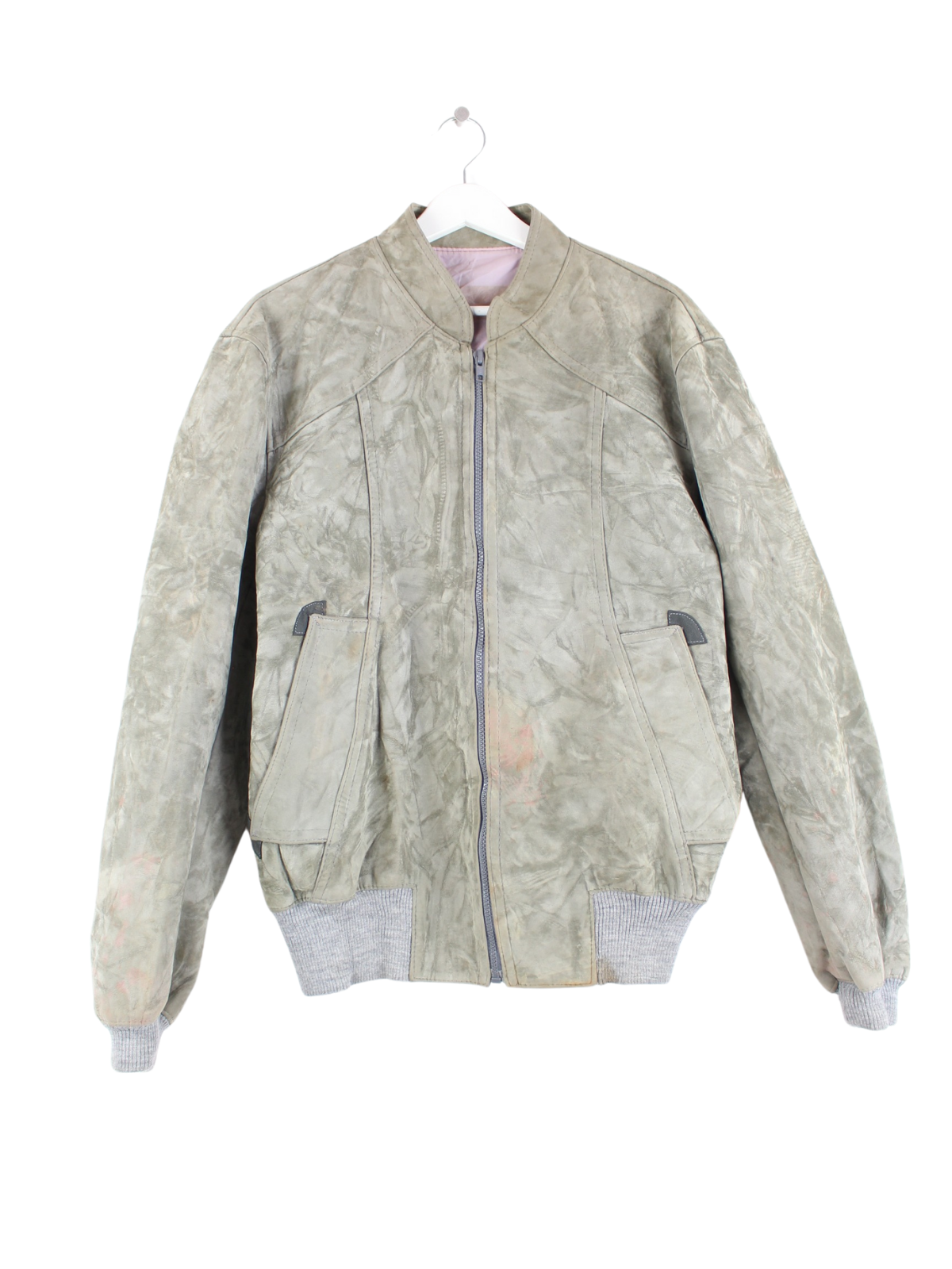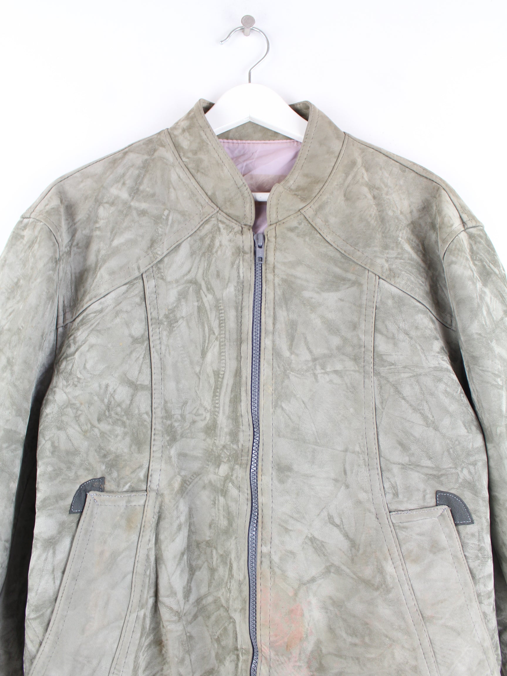 Grey vintage jacket with long zipper from the 90's in size S. It is made of leather and is available from us in good condition.