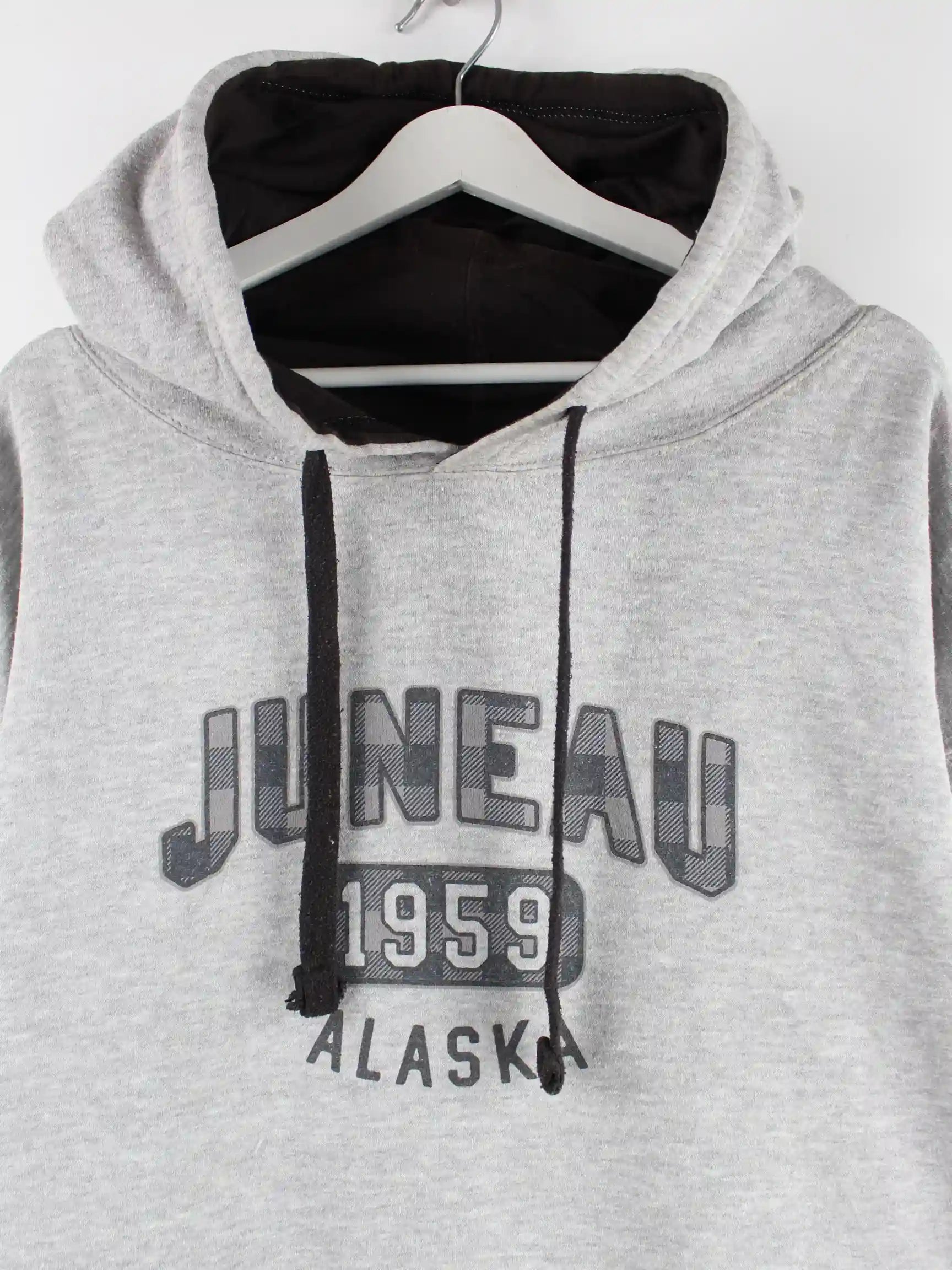 Vintage Hoodie in Größe XXL. Er ist aus einer Baumwollmischung gefertigt und in Grau im Angebot. Mit schickem Alaska Print.