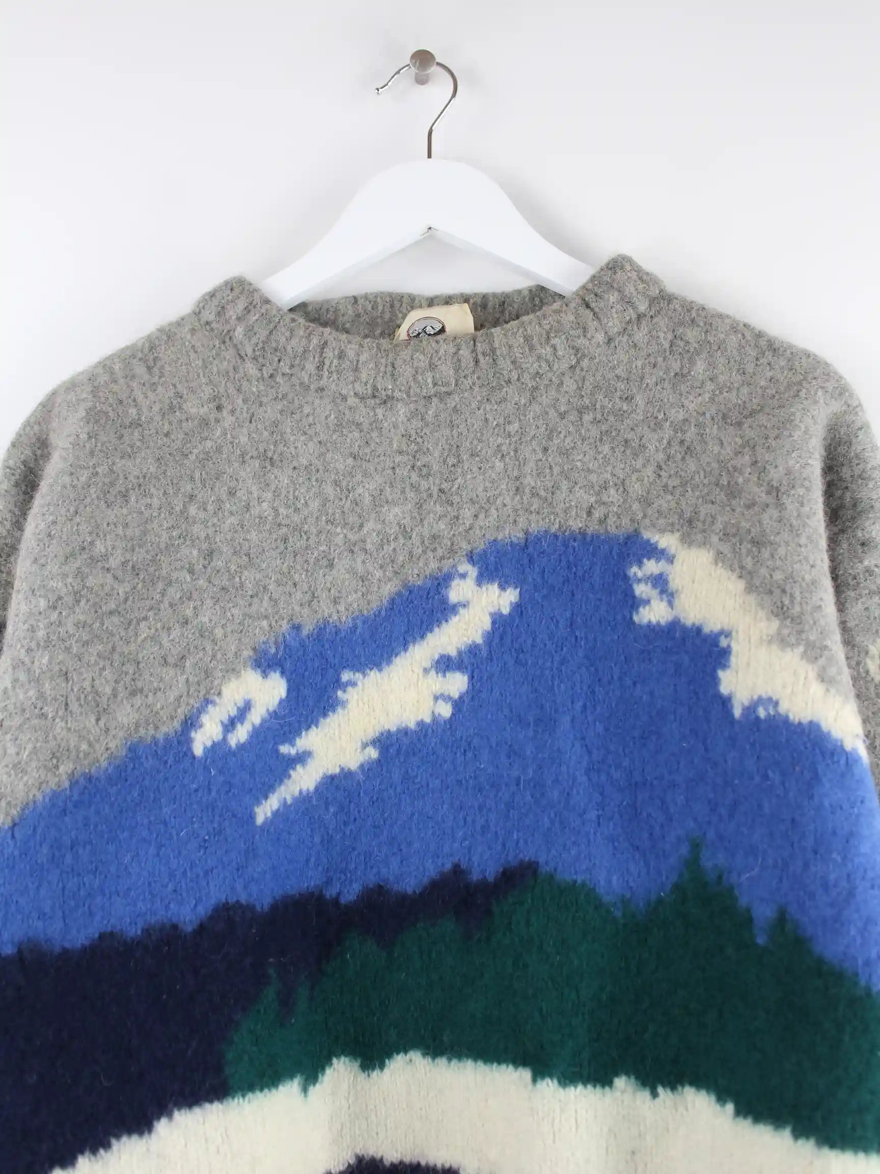 Grauer Vintage Pullover aus den 80'ern in Größe XS. Er ist aus Wolle produziert und in sehr gutem Zustand im Bestand.