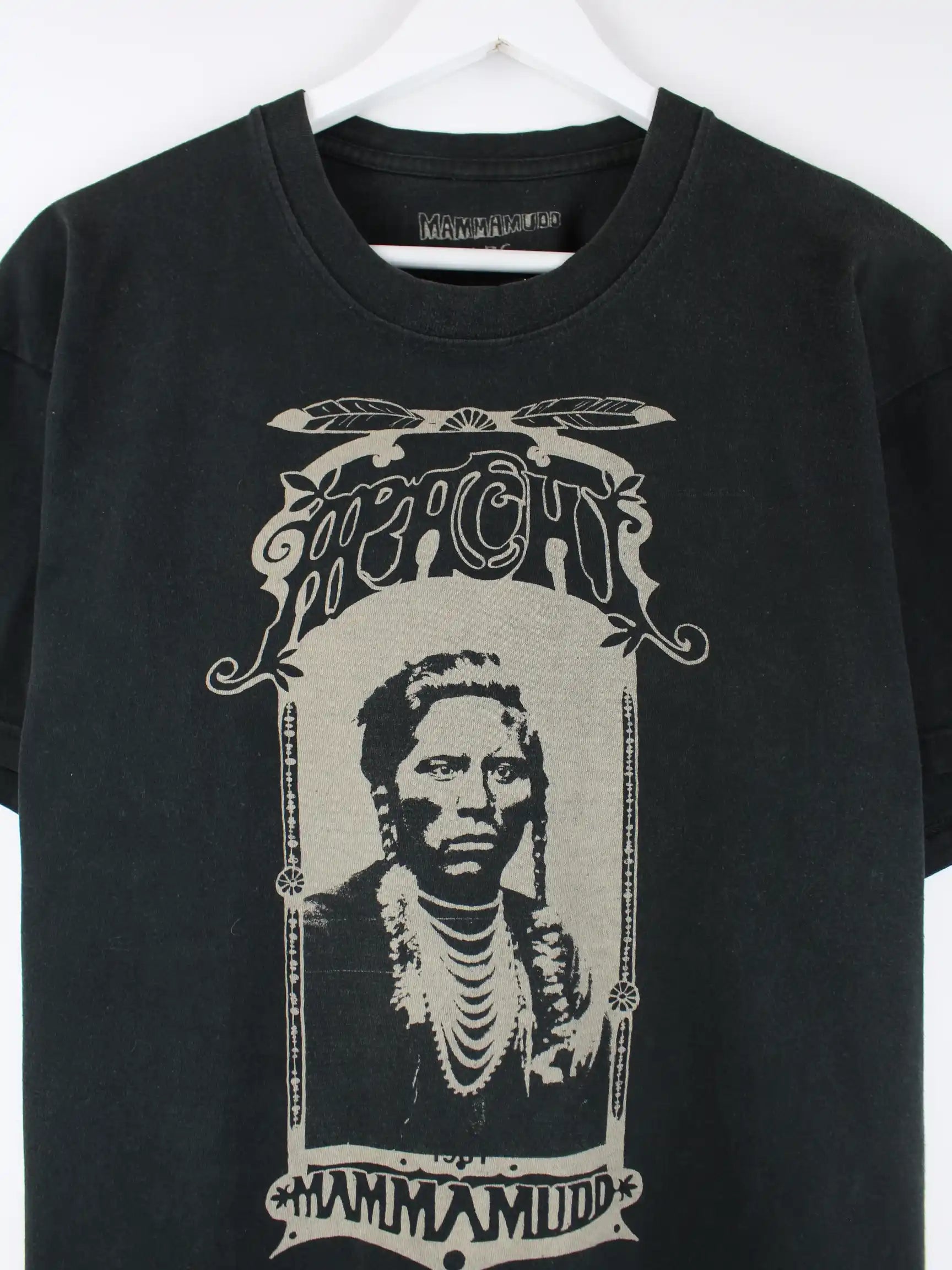 Vintage T-Shirt in Größe L. Es ist aus Baumwolle produziert und in Schwarz in Stock. Mit schickem Indigenous Print.