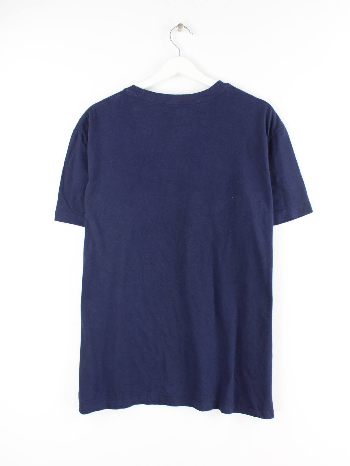 Vintage T-Shirt in Größe L. Es ist aus Baumwolle angefertigt und in Blau vorrätig. Mit schickem Warriors Print.