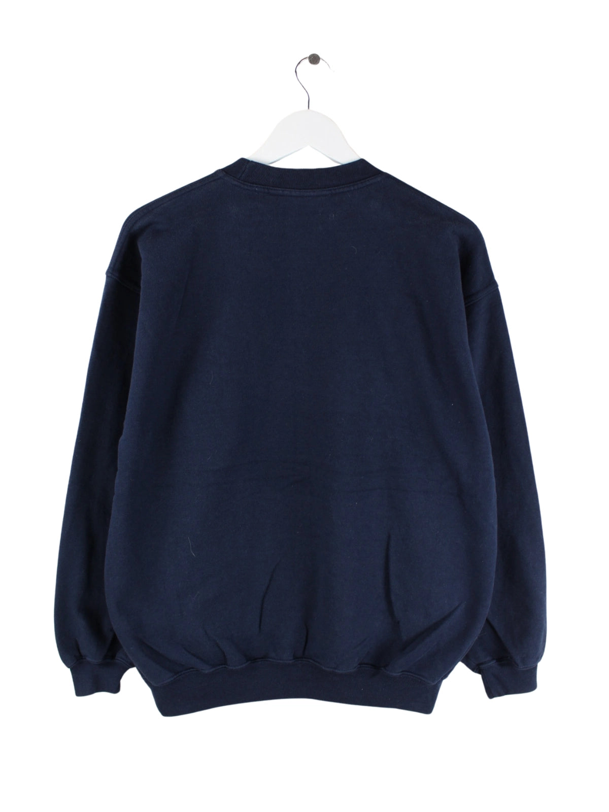 Blauer Vintage Sweater mit Stickereien in Größe L. Er ist aus einer Baumwollmischung angefertigt und in gutem Zustand bei uns vorrätig.