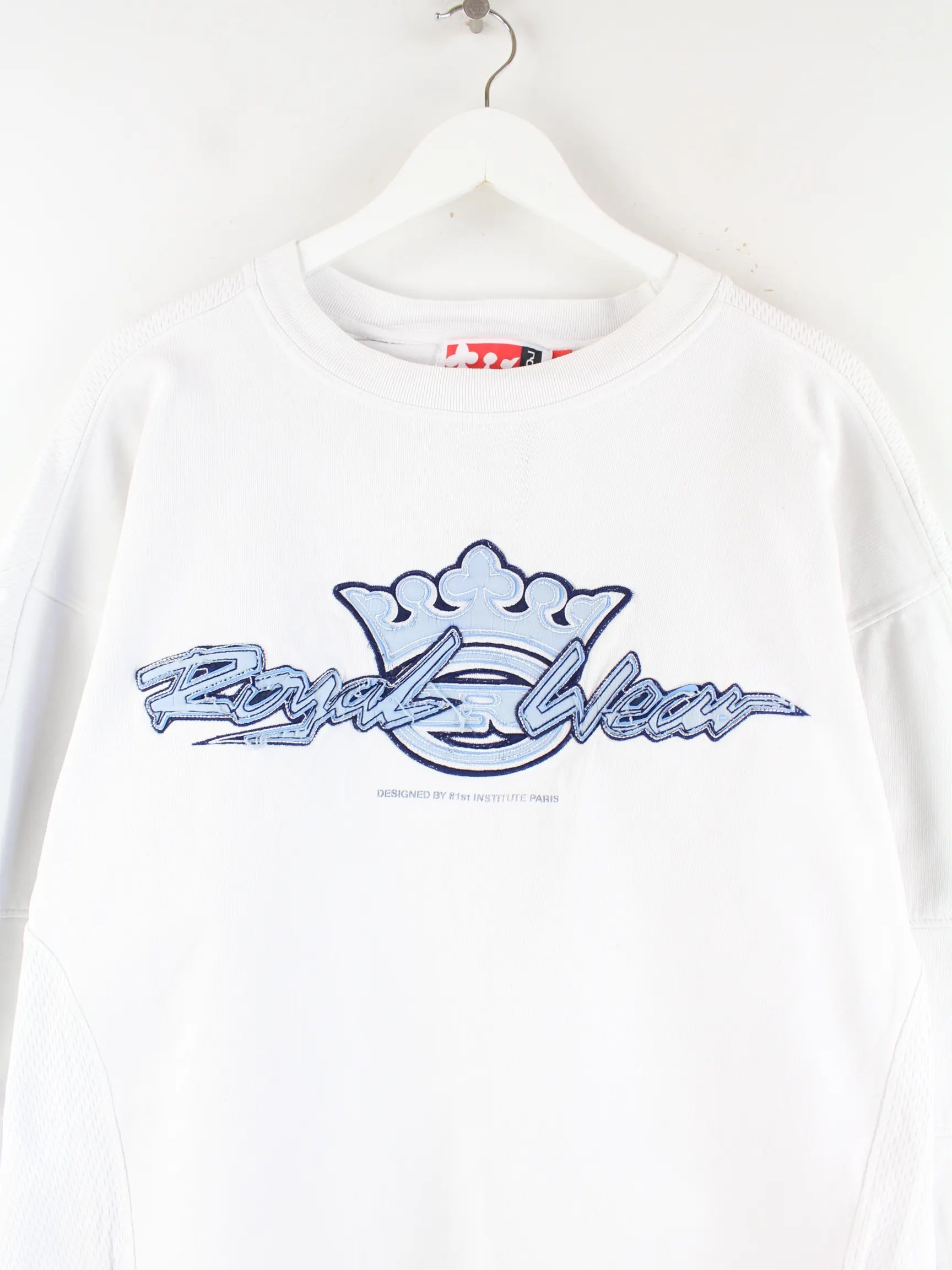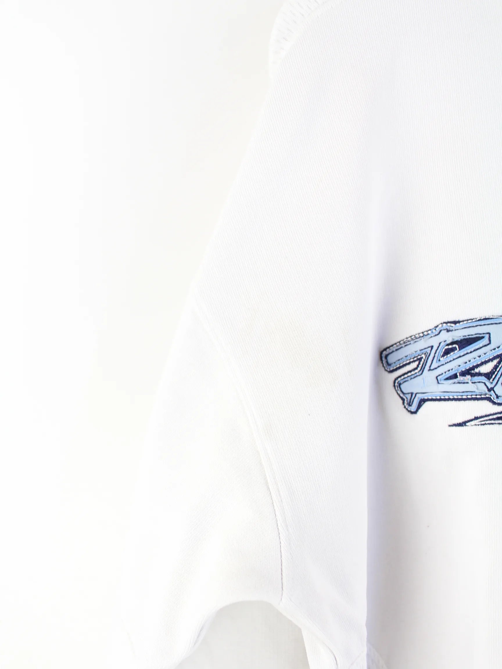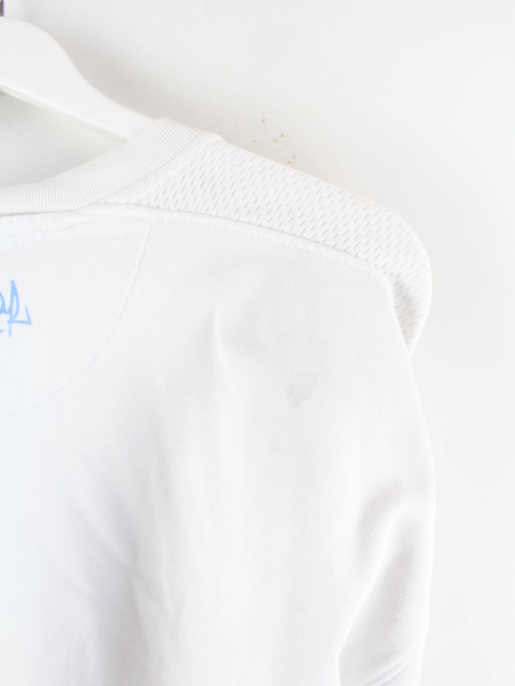 Weißer Vintage Sweater aus Anfang der 2000'er in Größe L. Er ist aus einer Baumwollmischung gefertigt. Den Zustand würden wir als 'In Ordnung' bezeichnen (vergl. Bilder).