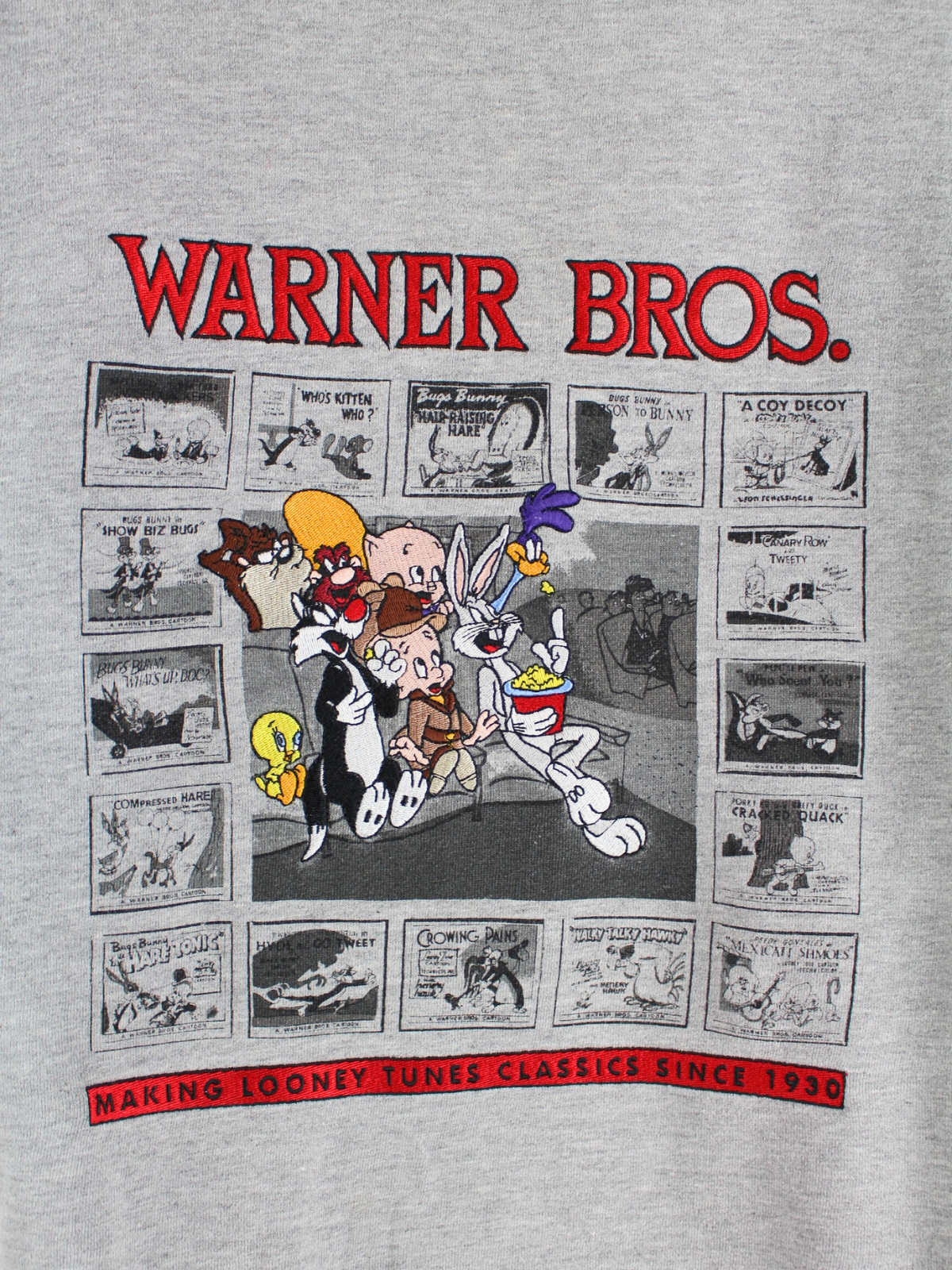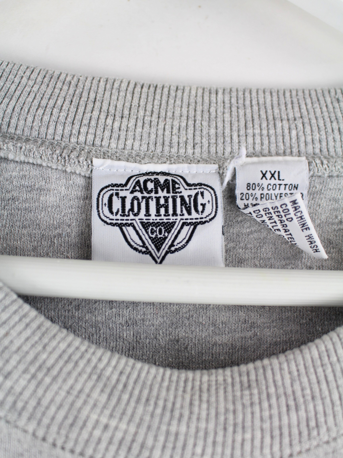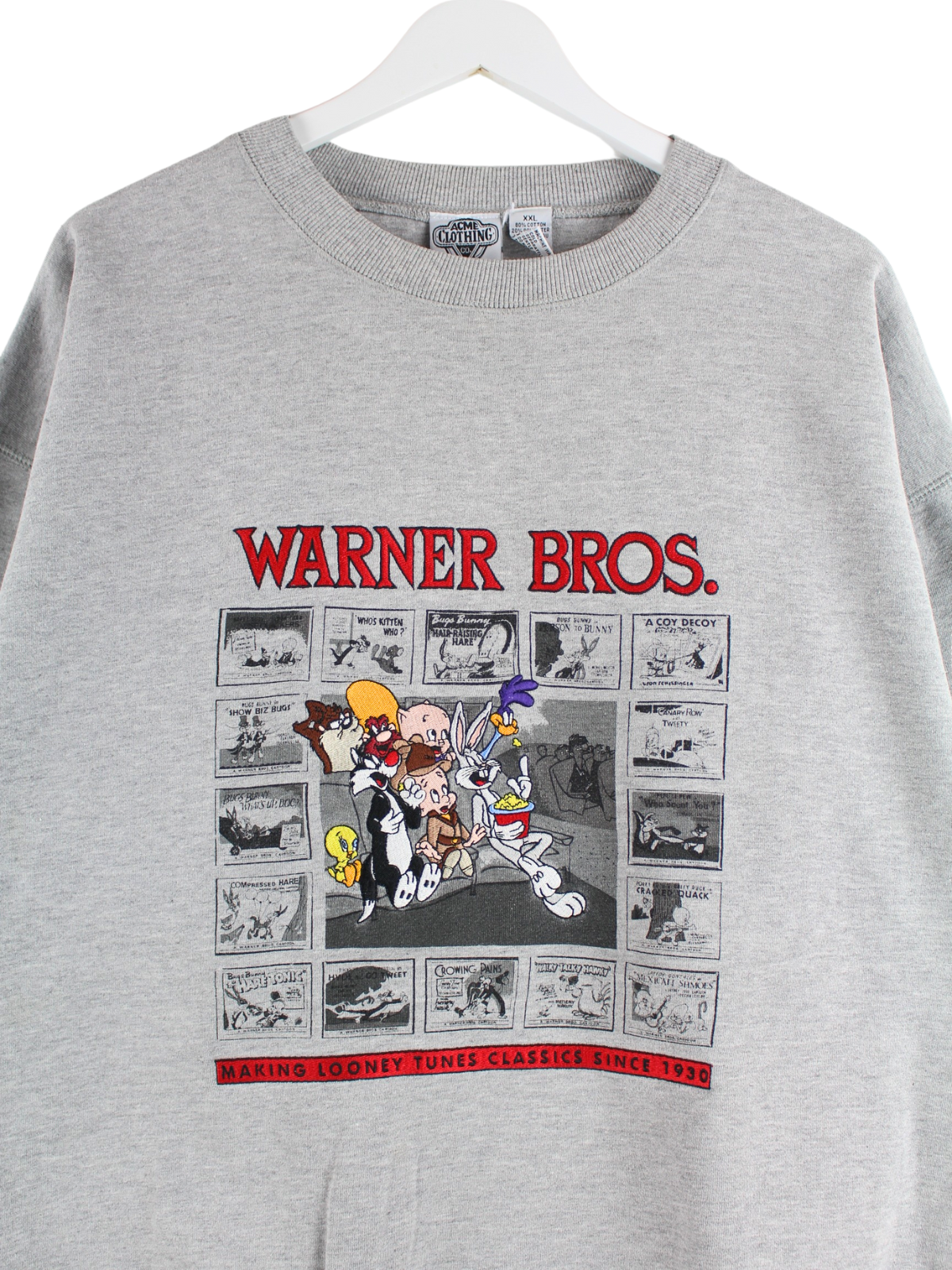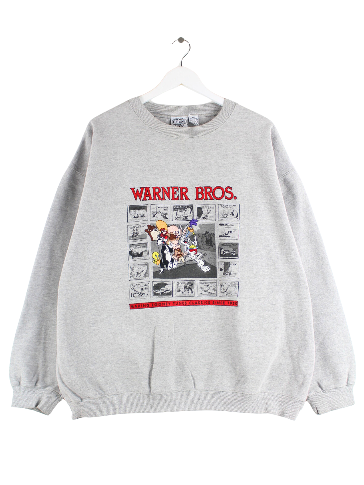 Sweater der Brand Warner Bros mit gesticktem Logo in Größe XXL aus den 90'ern. Er ist aus einer Baumwollmischung produziert und in Grau im Bestand.