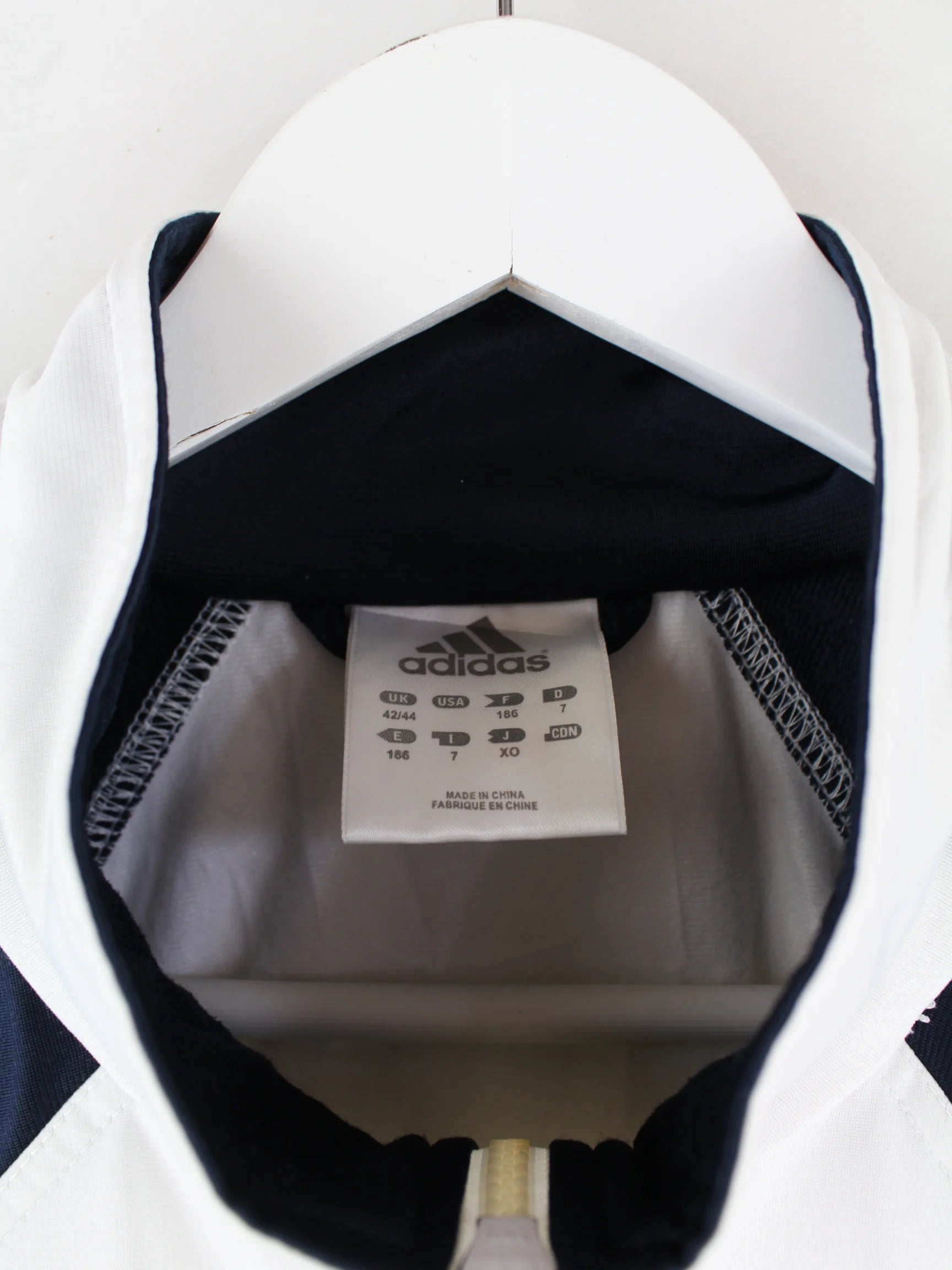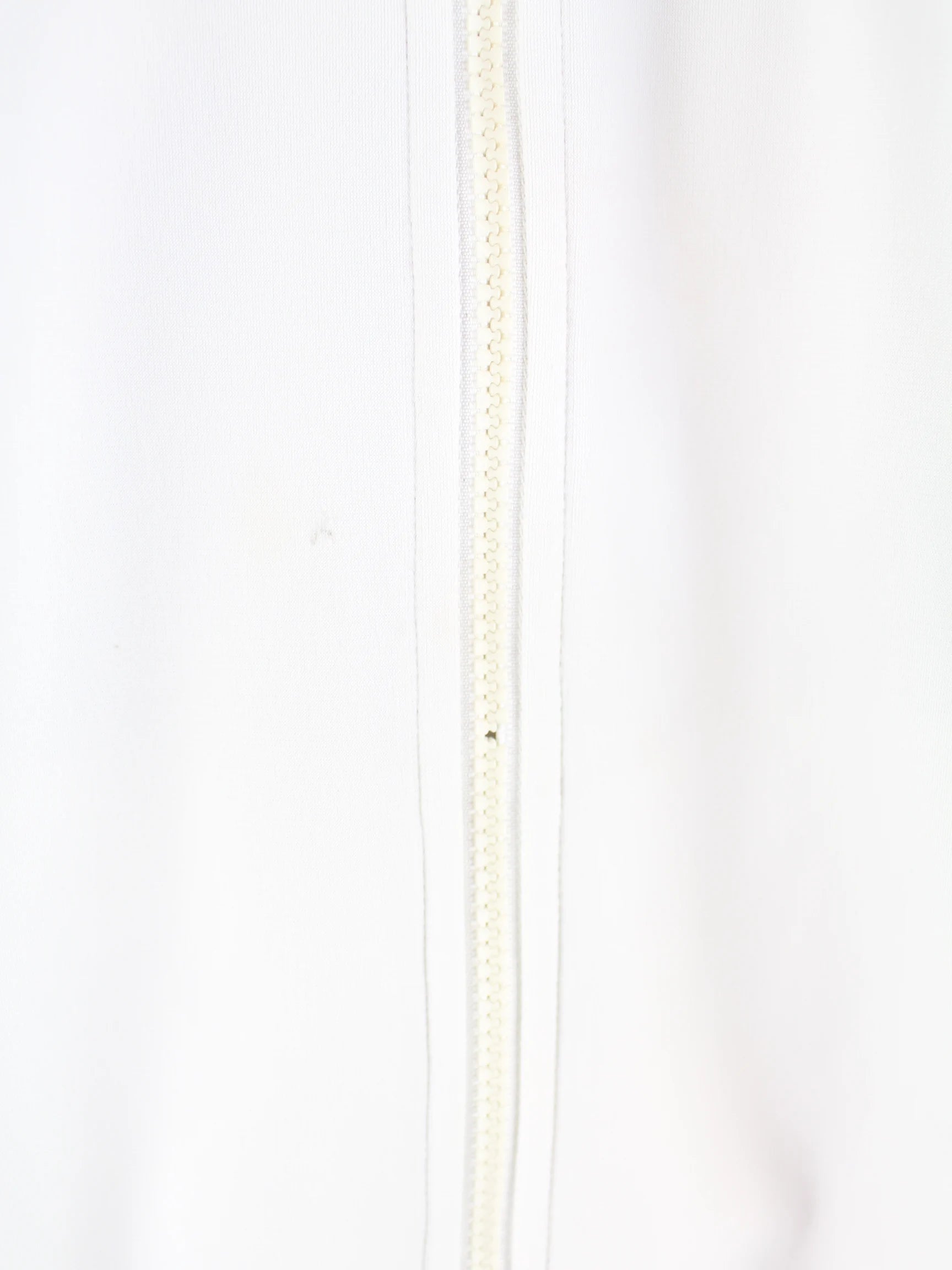 Weiße Trainingsjacke mit gestickten Motiven vom Brand Adidas in Größe XXL. Sie ist aus Synthetik gemacht. Den Zustand würden wir als 'In Ordnung' bezeichnen (vergl. Bilder).