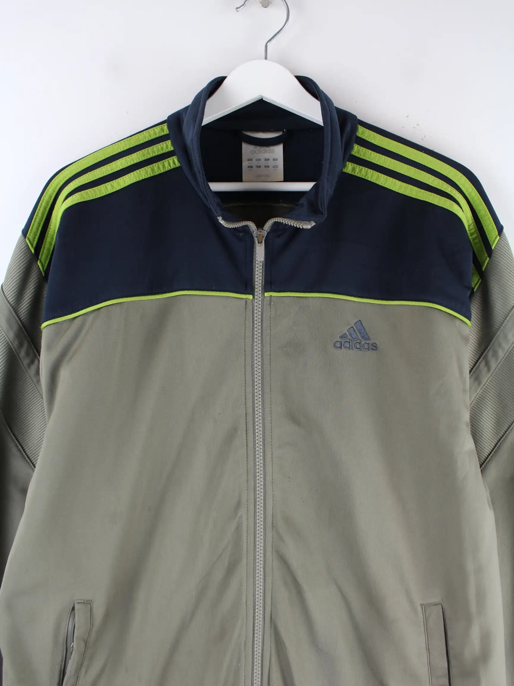 Grüne Trainingsjacke vom Brand Adidas in Größe XL. Sie ist aus Synthetik produziert. Den Zustand würden wir als 'In Ordnung' bezeichnen (vergl. Bilder).