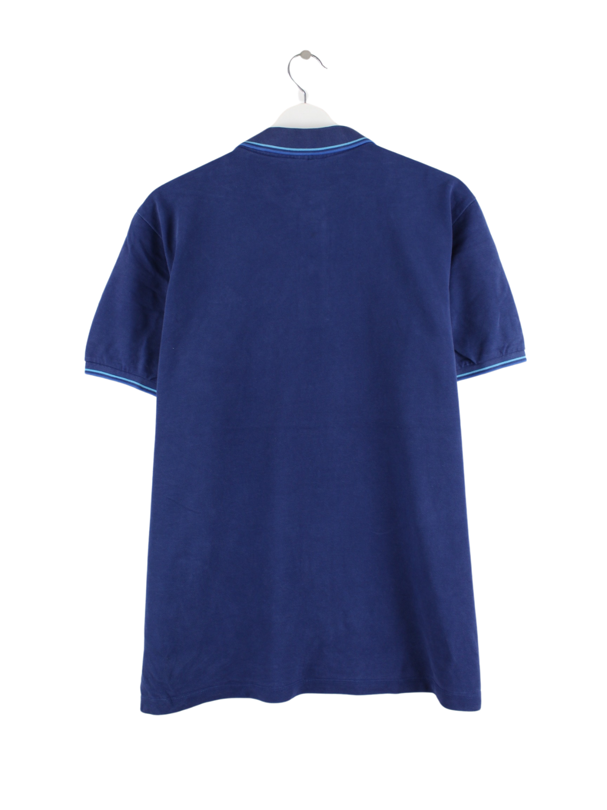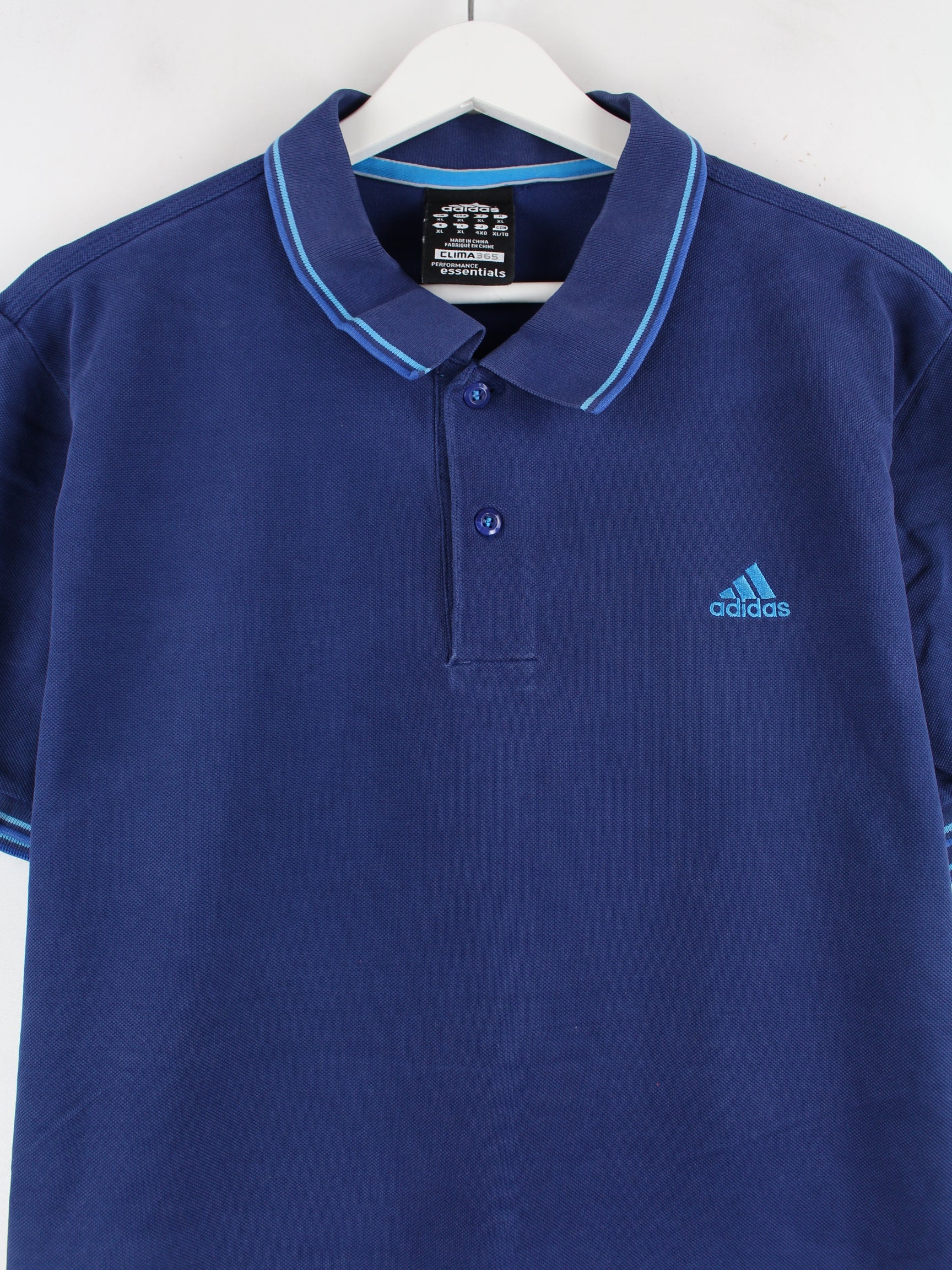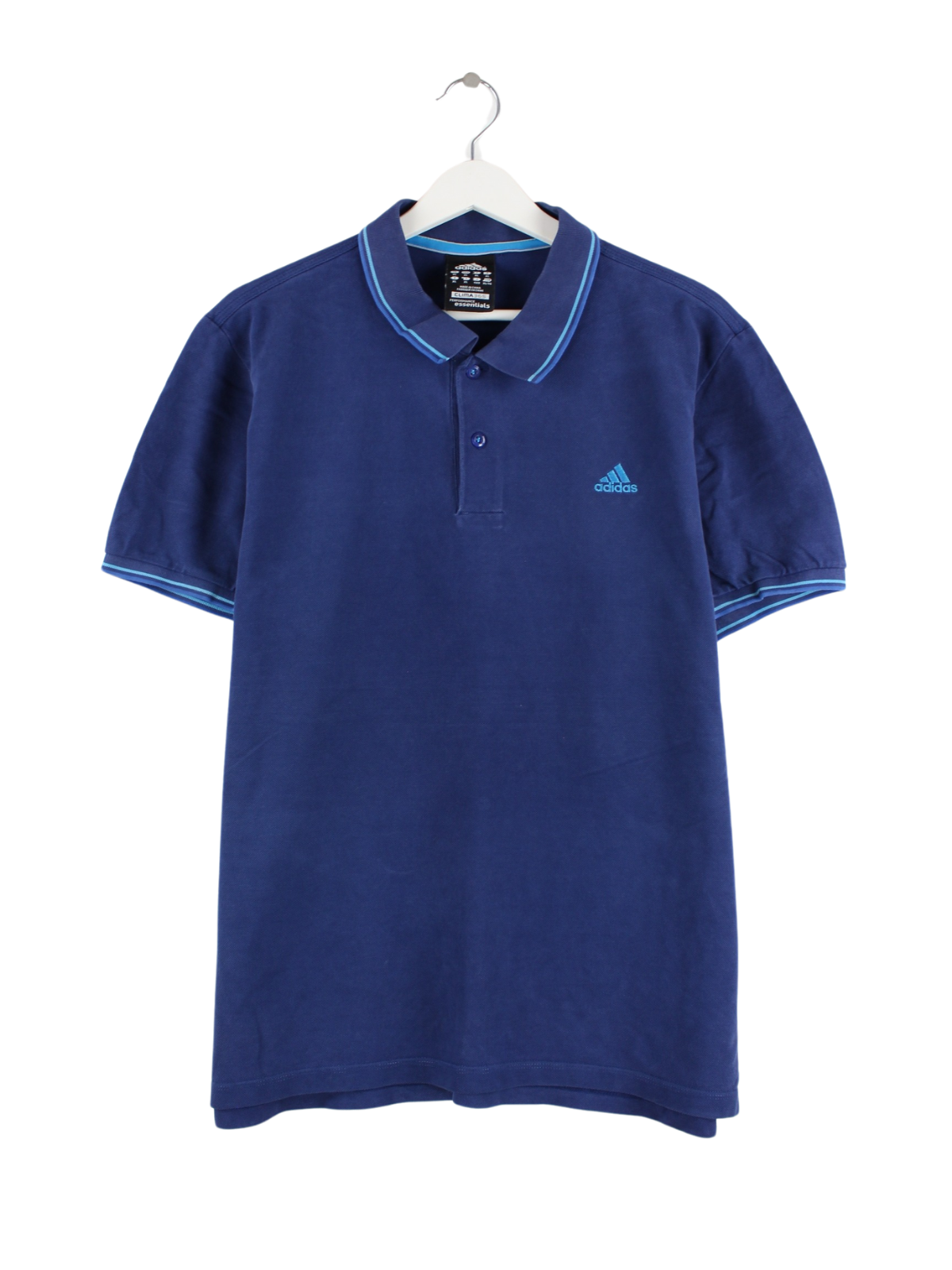 Blaues Poloshirt der Brand Adidas in Größe L. Es ist aus Baumwolle gemacht und in gutem Zustand bei uns vorrätig.