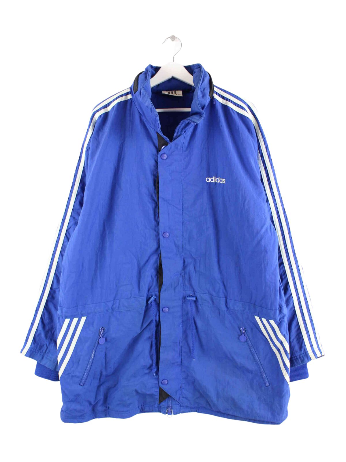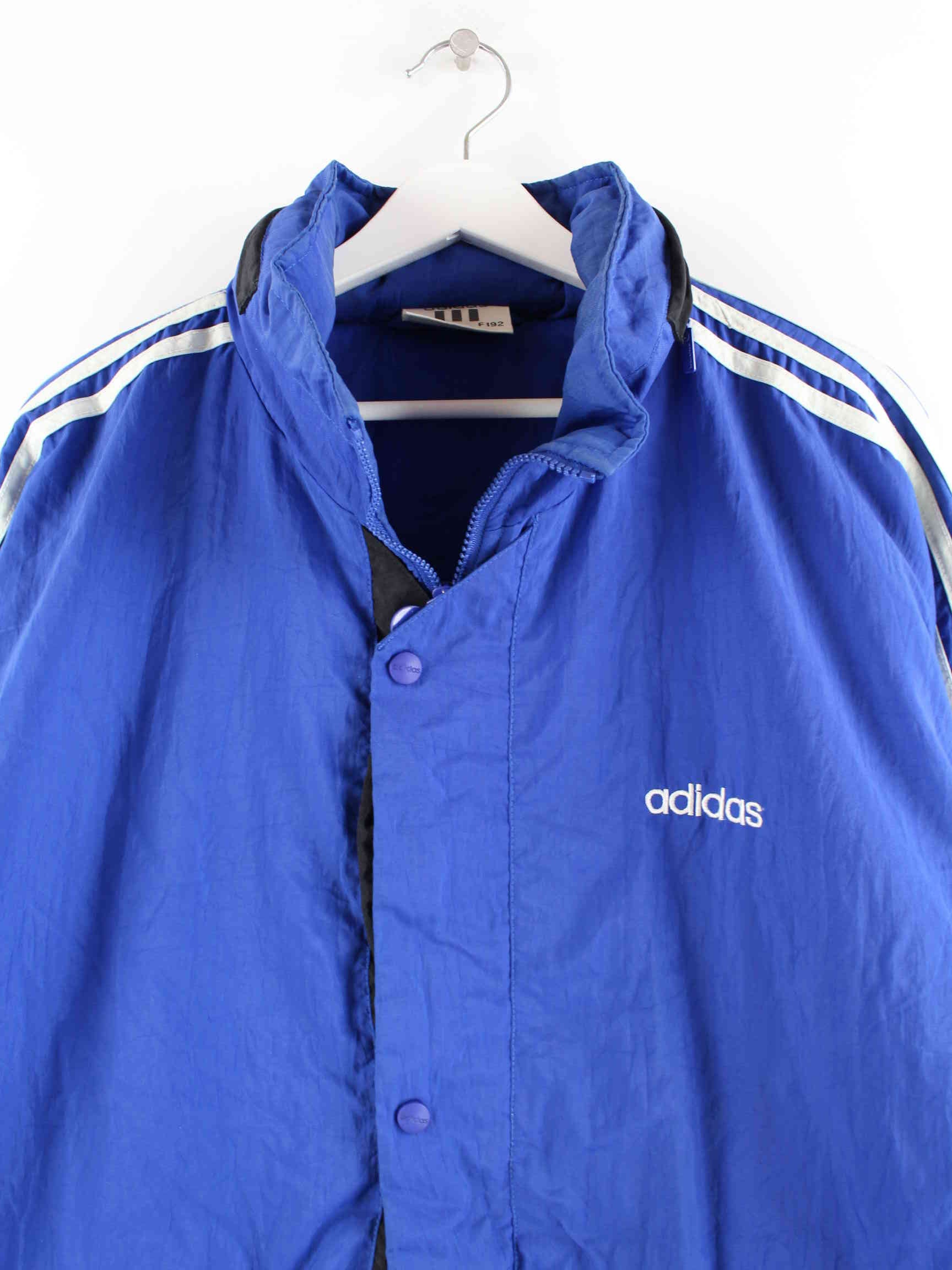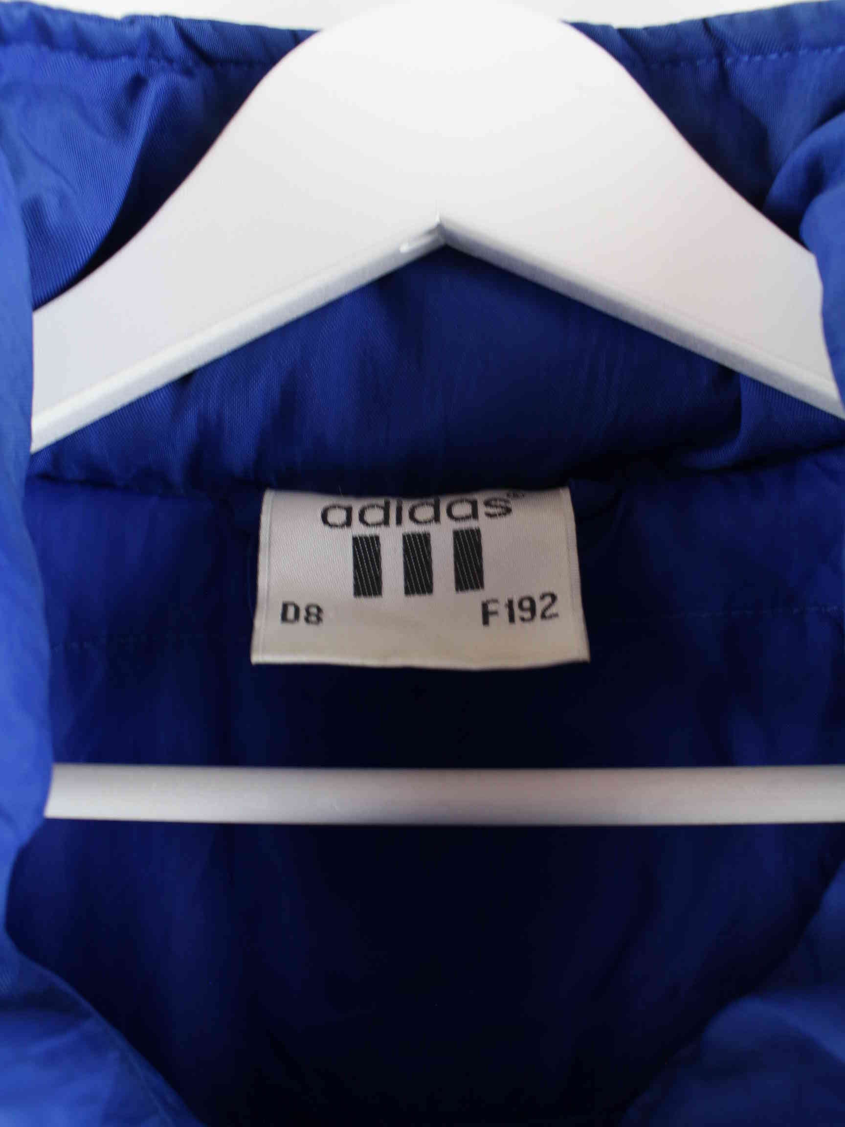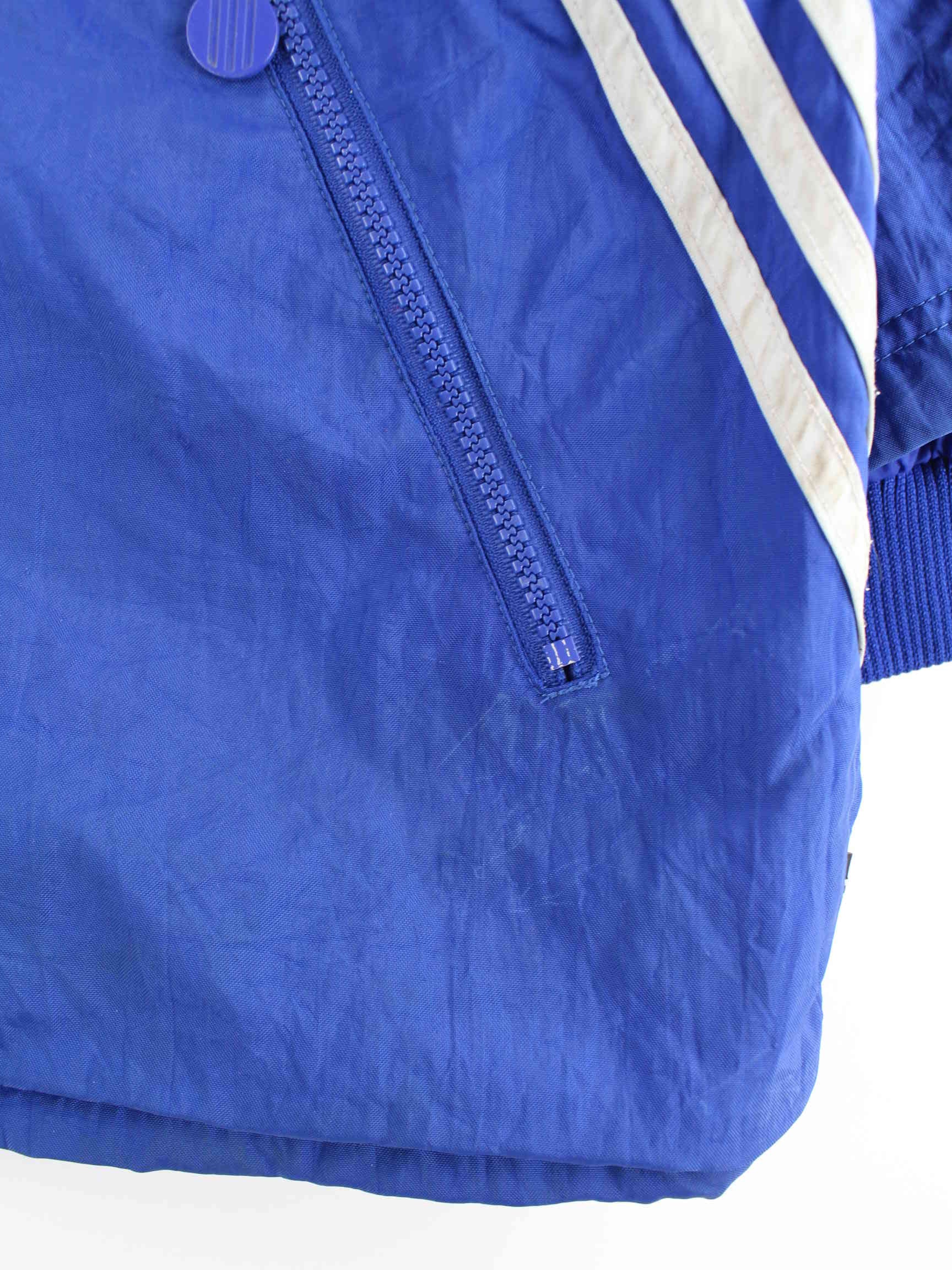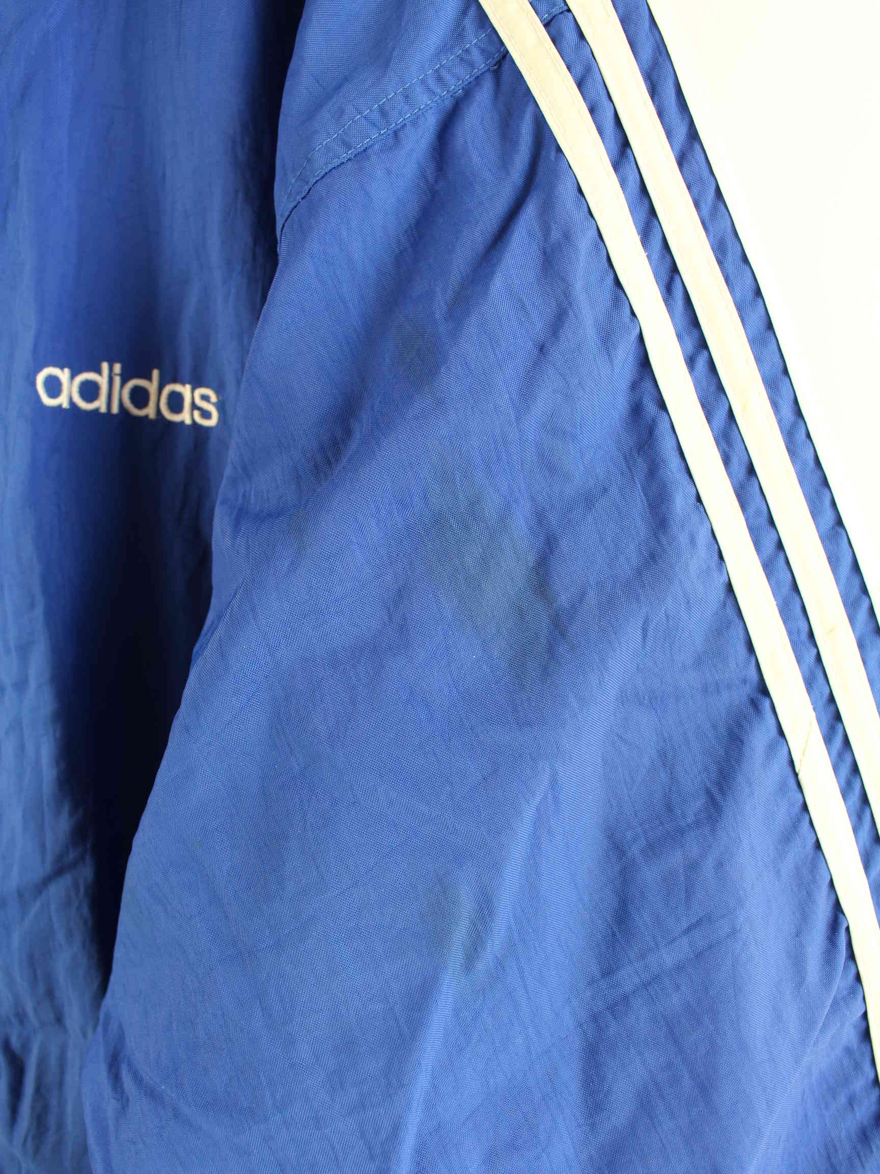 Blue lightweight jacket from Adidas from the 80's in size XXL. It is made of synthetic material and is available from us in good condition.