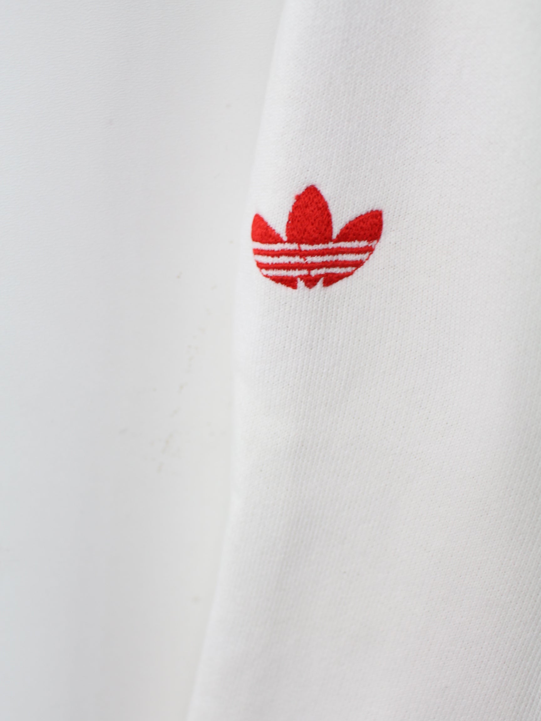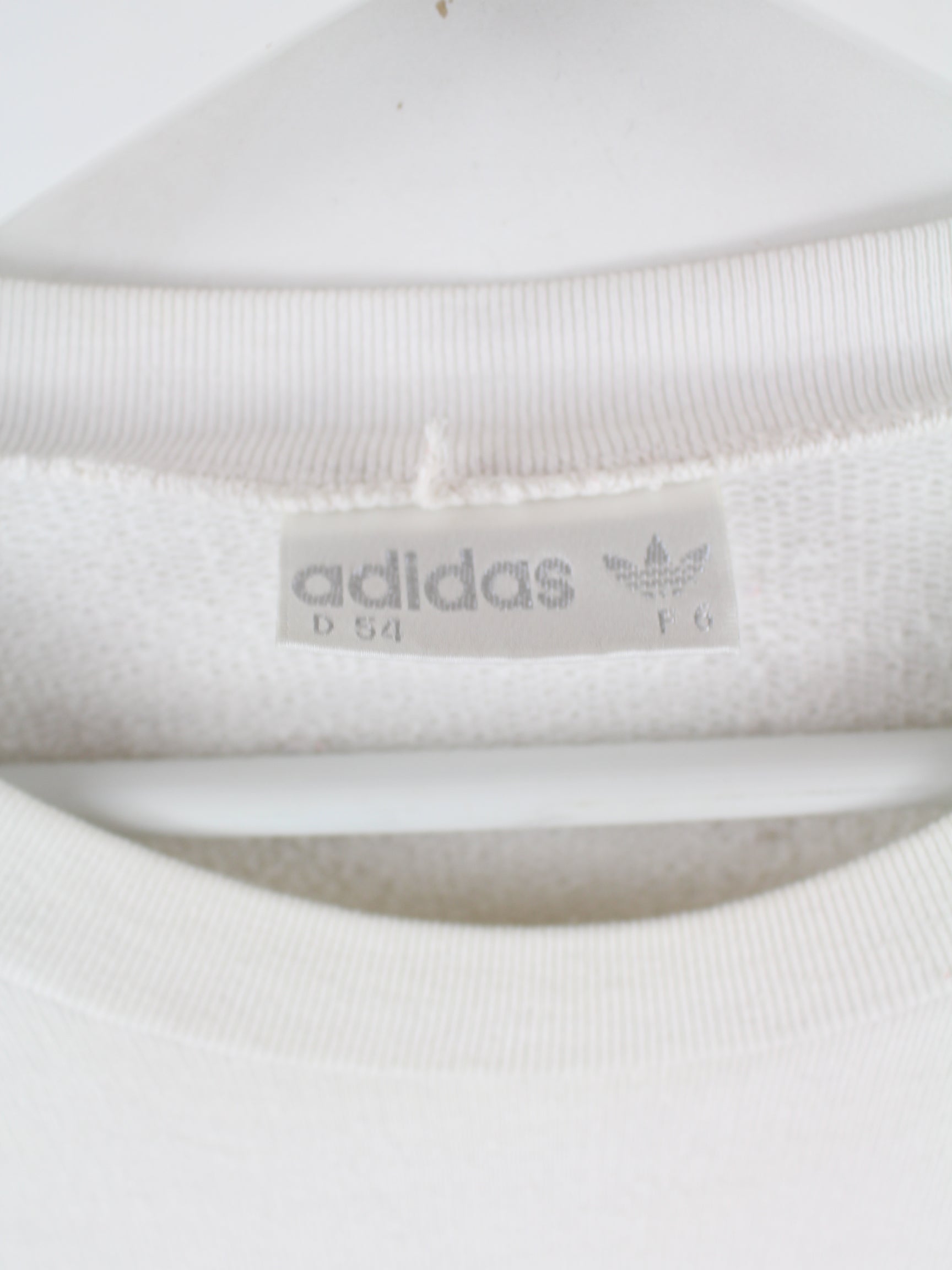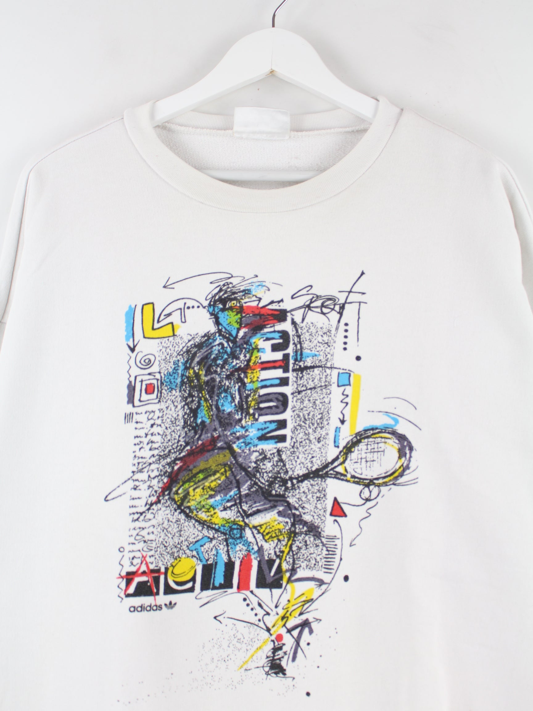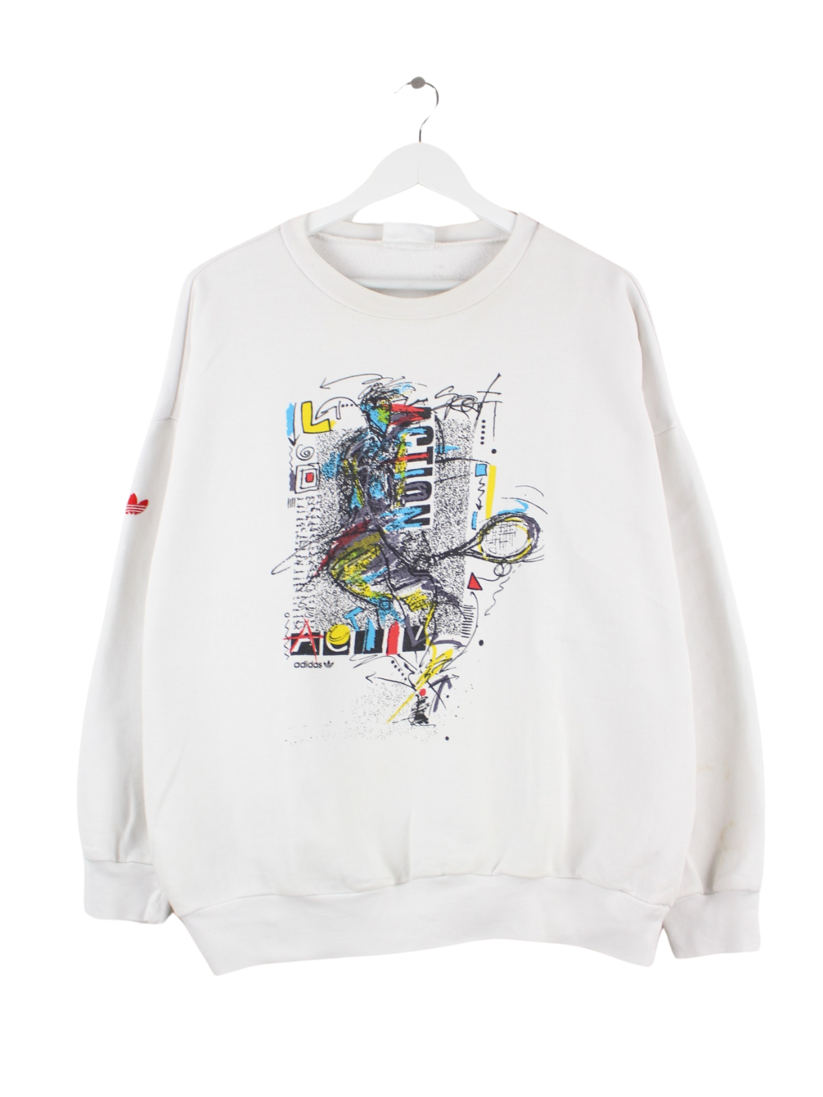 Sweater from the Adidas label in size L from the 80's. It is made from a cotton blend and is available from us in white. With a rare crazy print.