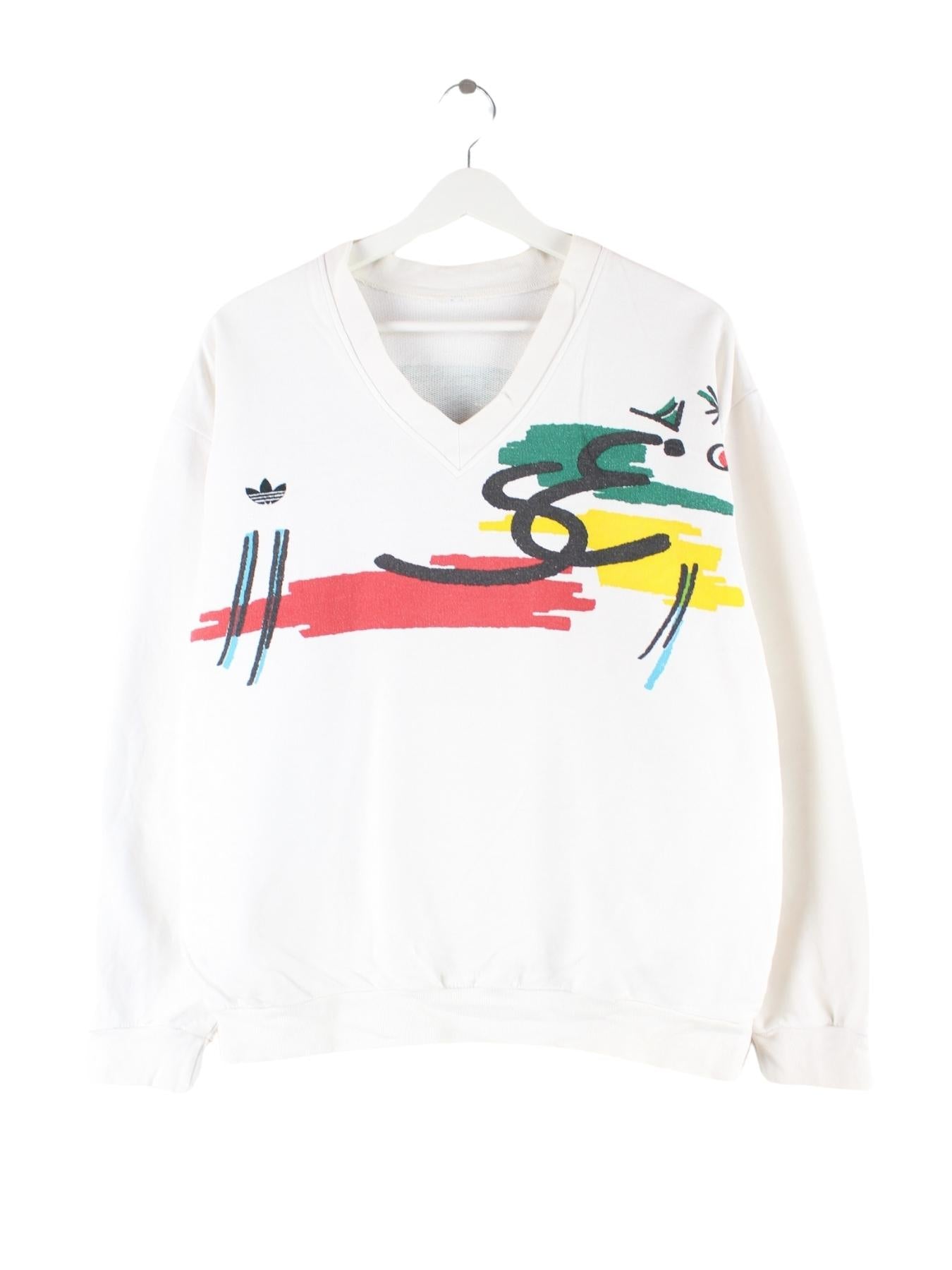 Weißer Sweater der Brand Adidas aus den 80'ern in Größe S. Er ist aus einer Baumwollmischung angefertigt und in sehr gutem Zustand bei uns zu bekommen. Mit tollem Crazy Print.