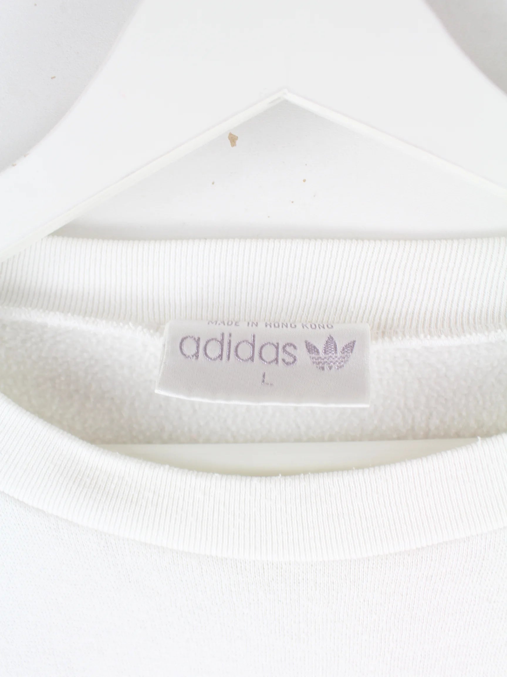 Sweater der Marke Adidas in Größe M aus den 80'ern. Er ist aus einer Baumwollmischung angefertigt und in Weiß bei uns zu bekommen. Mit schickem Garde Print.