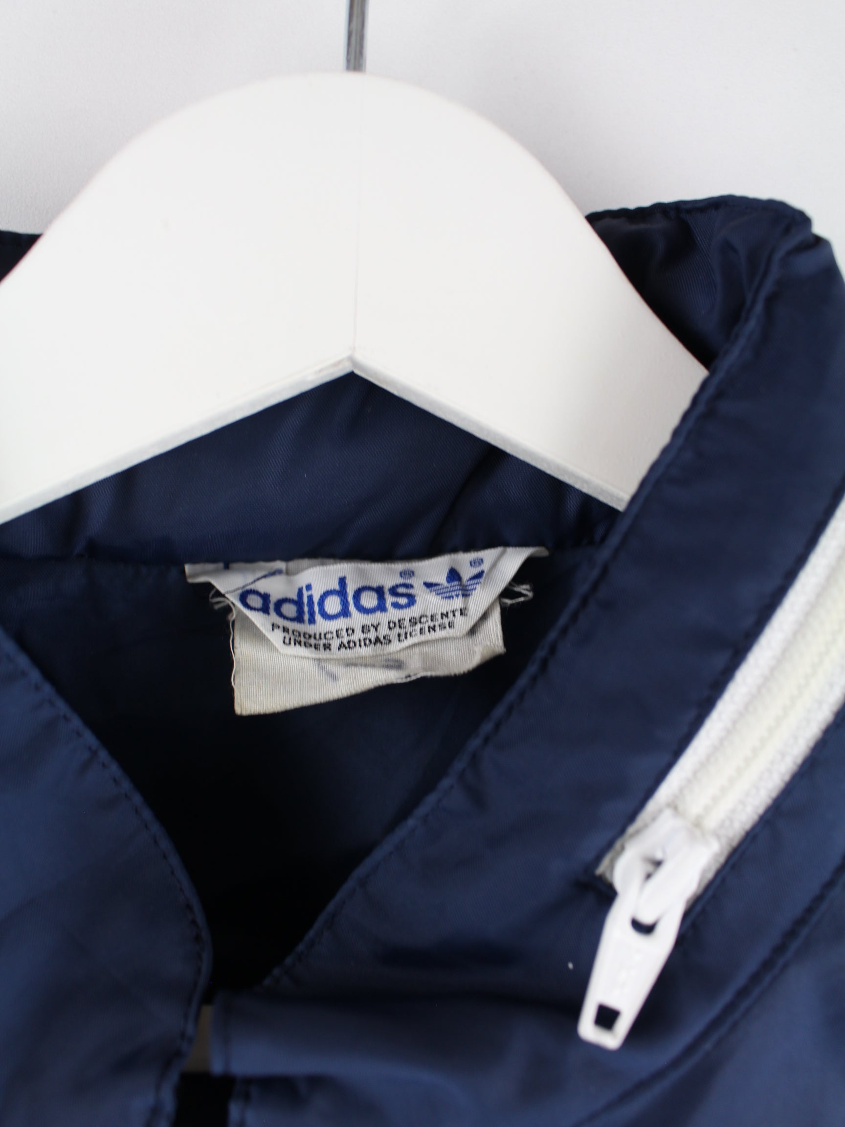 Leichte Jacke des Labels Adidas in Größe L aus den 80'ern. Sie ist aus Synthetik produziert und in Blau zu bekommen.