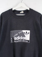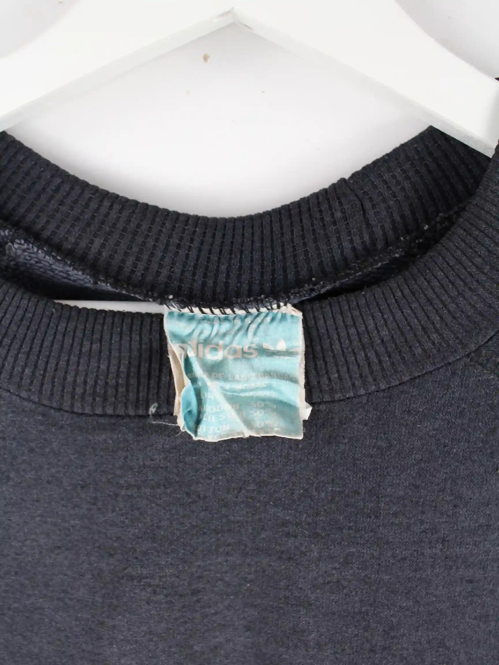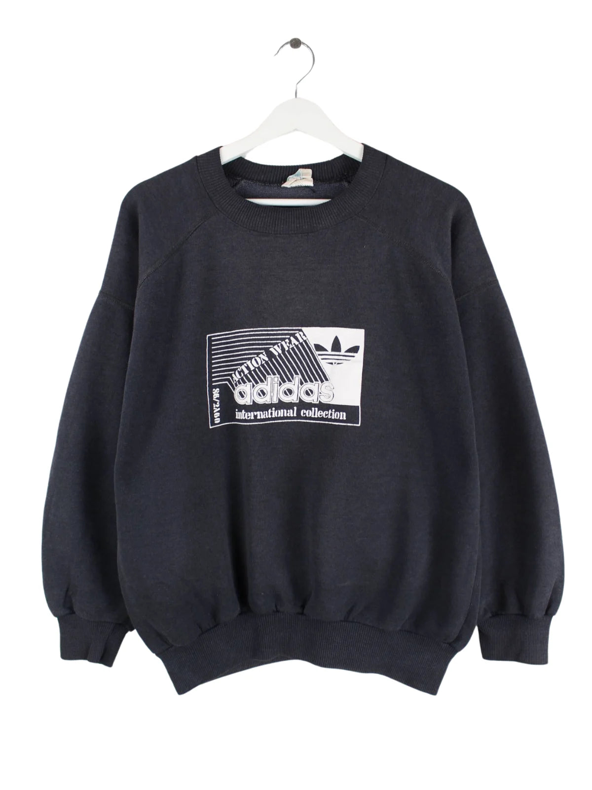 Grauer Sweater des Labels Adidas aus den 80'ern in Größe S. Er ist aus einer Baumwollmischung gefertigt und in gutem Zustand vorrätig. Mit schickem Vintage Print.