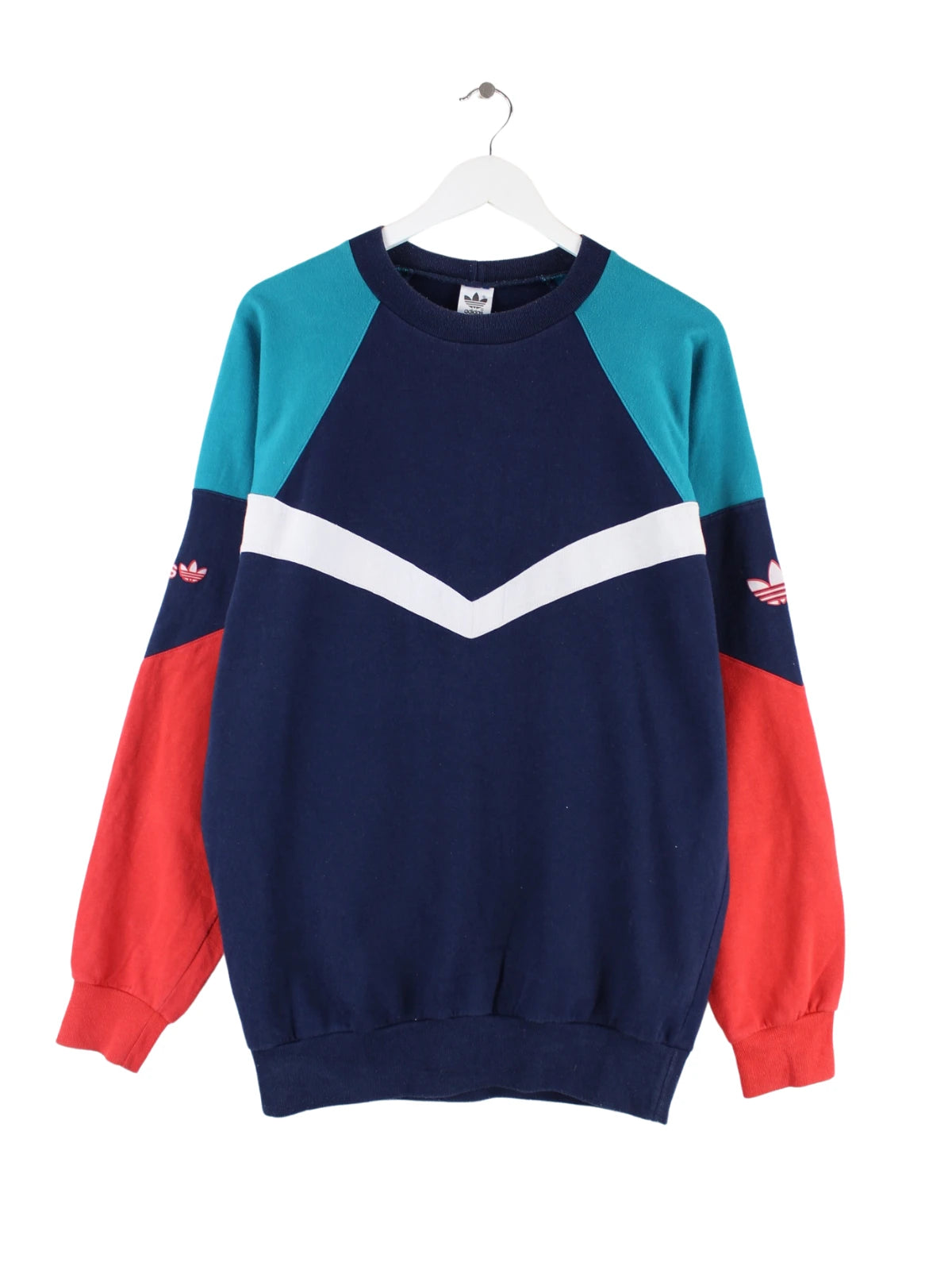 Sweater des Labels Adidas in Größe XL aus den 80'ern. Er ist aus einer Baumwollmischung gemacht und in Blau zu haben.