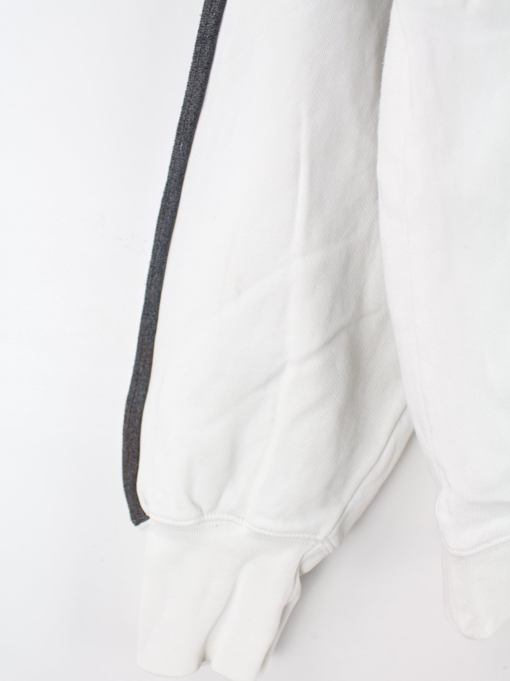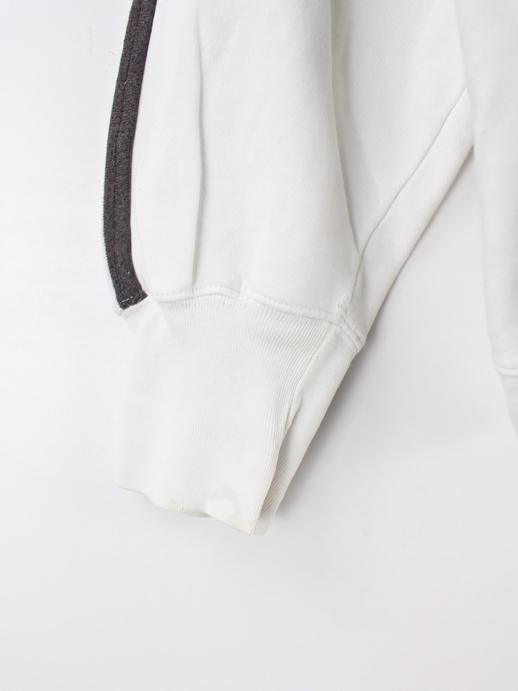 Weißer Sweater vom Brand Adidas aus den 90'ern in Größe L. Er ist aus einer Baumwollmischung gemacht. Den Zustand würden wir als 'In Ordnung' bezeichnen (vergl. Bilder).