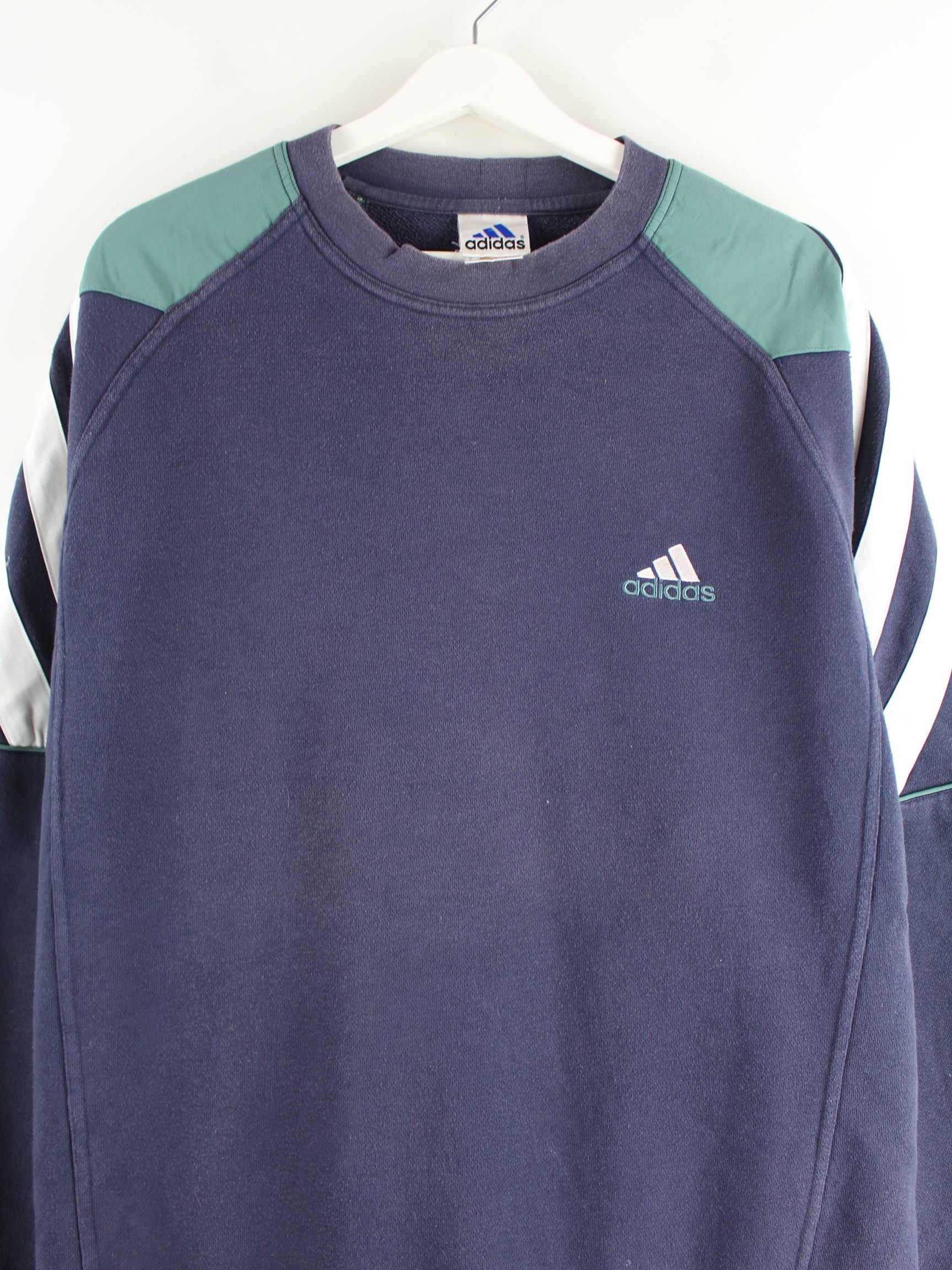 Sweater from Adidas with embroidered logo in size XXL from the 90's. It is made from a cotton blend and is available in blue.
