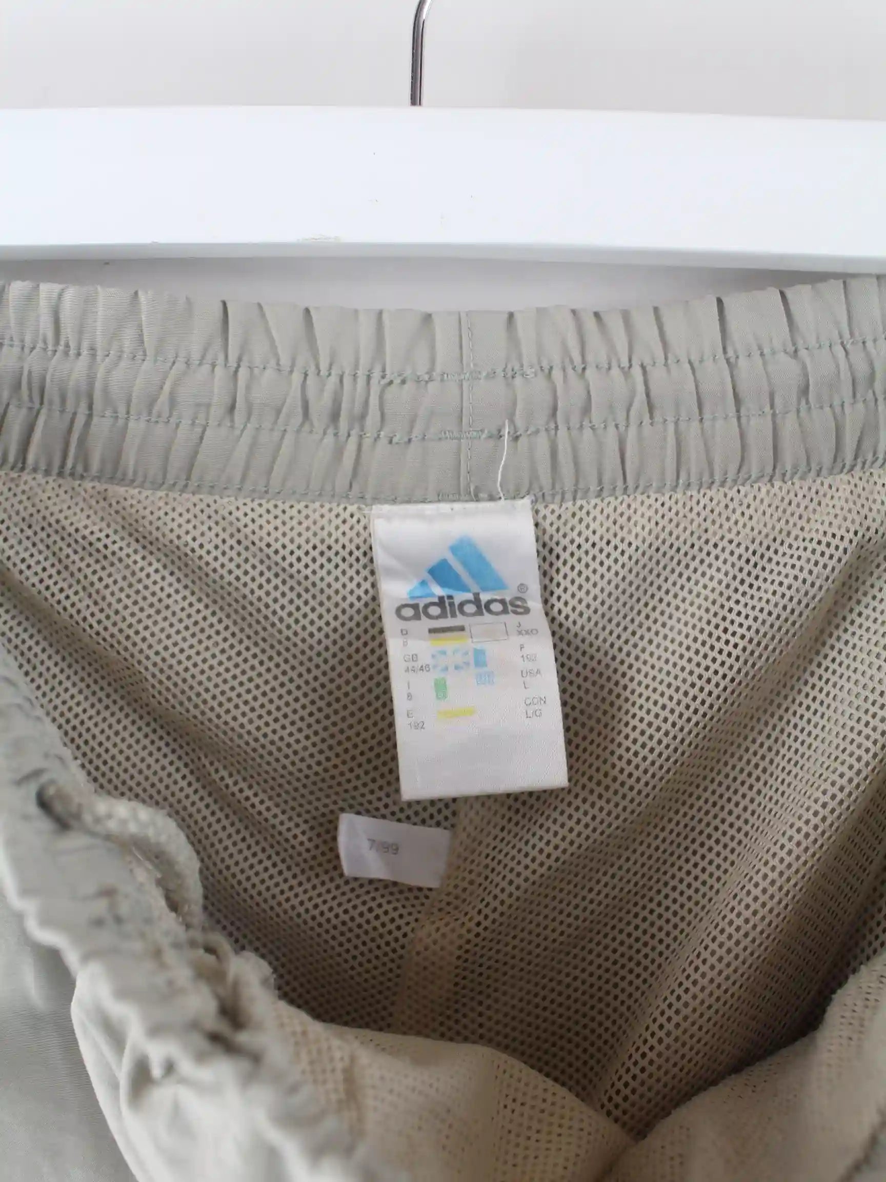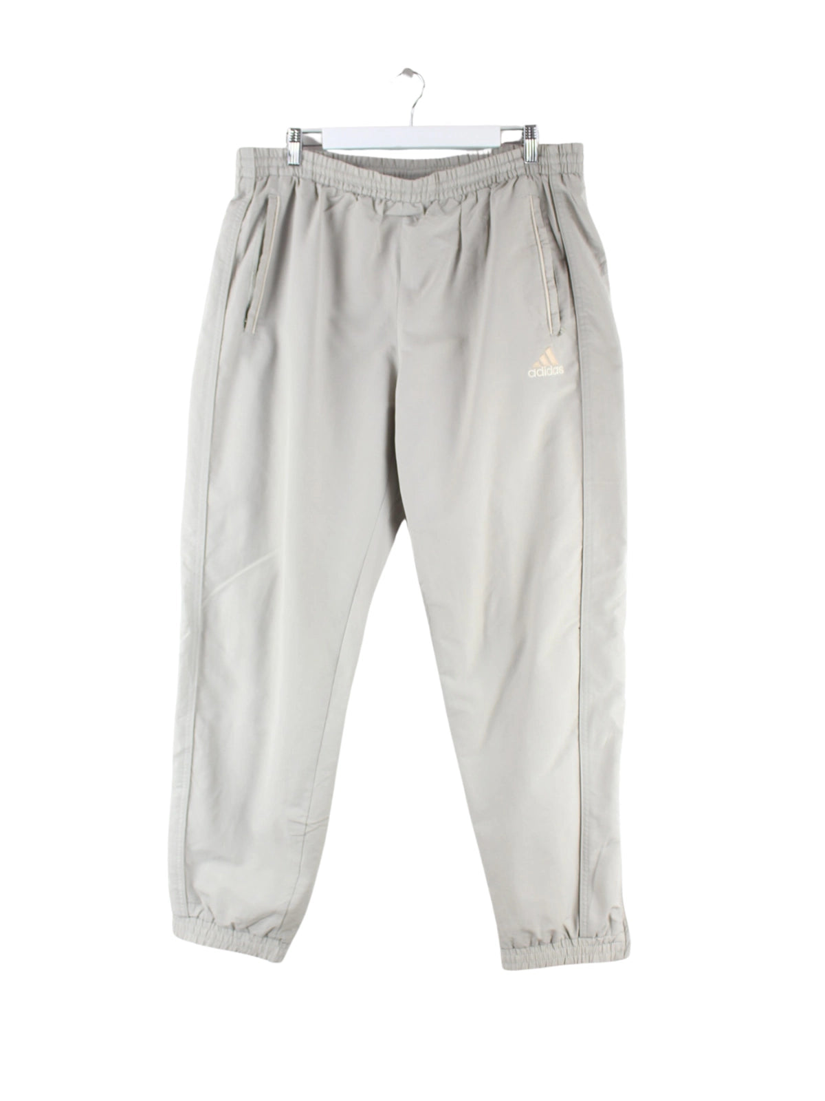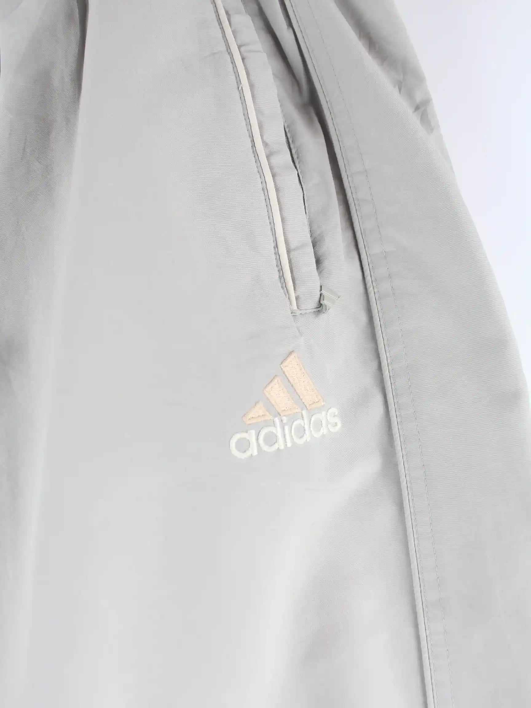 Graue Track Pants der Brand Adidas aus den 90'ern in Größe XXL. Sie sind aus Synthetik angefertigt und in sehr gutem Zustand bei uns vorrätig.