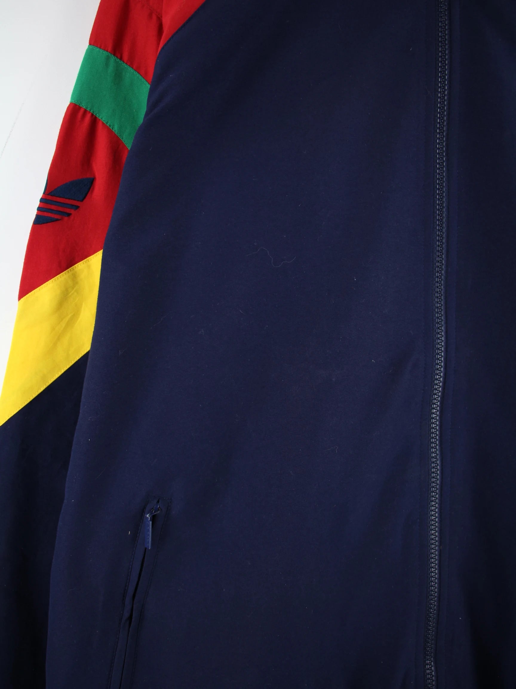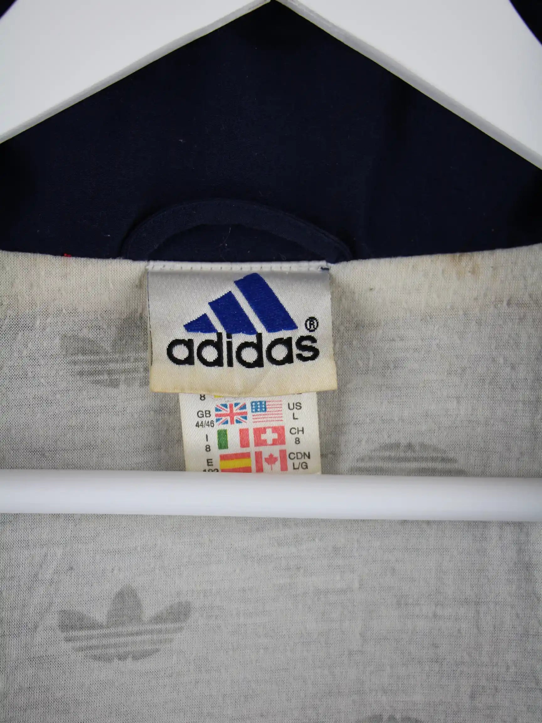 Trainingsjacke aus dem Hause Adidas in Größe XXL aus den 90'ern. Sie ist aus Synthetik hergestellt und in Blau bei uns vorrätig. Mit schönem Vintage Print.