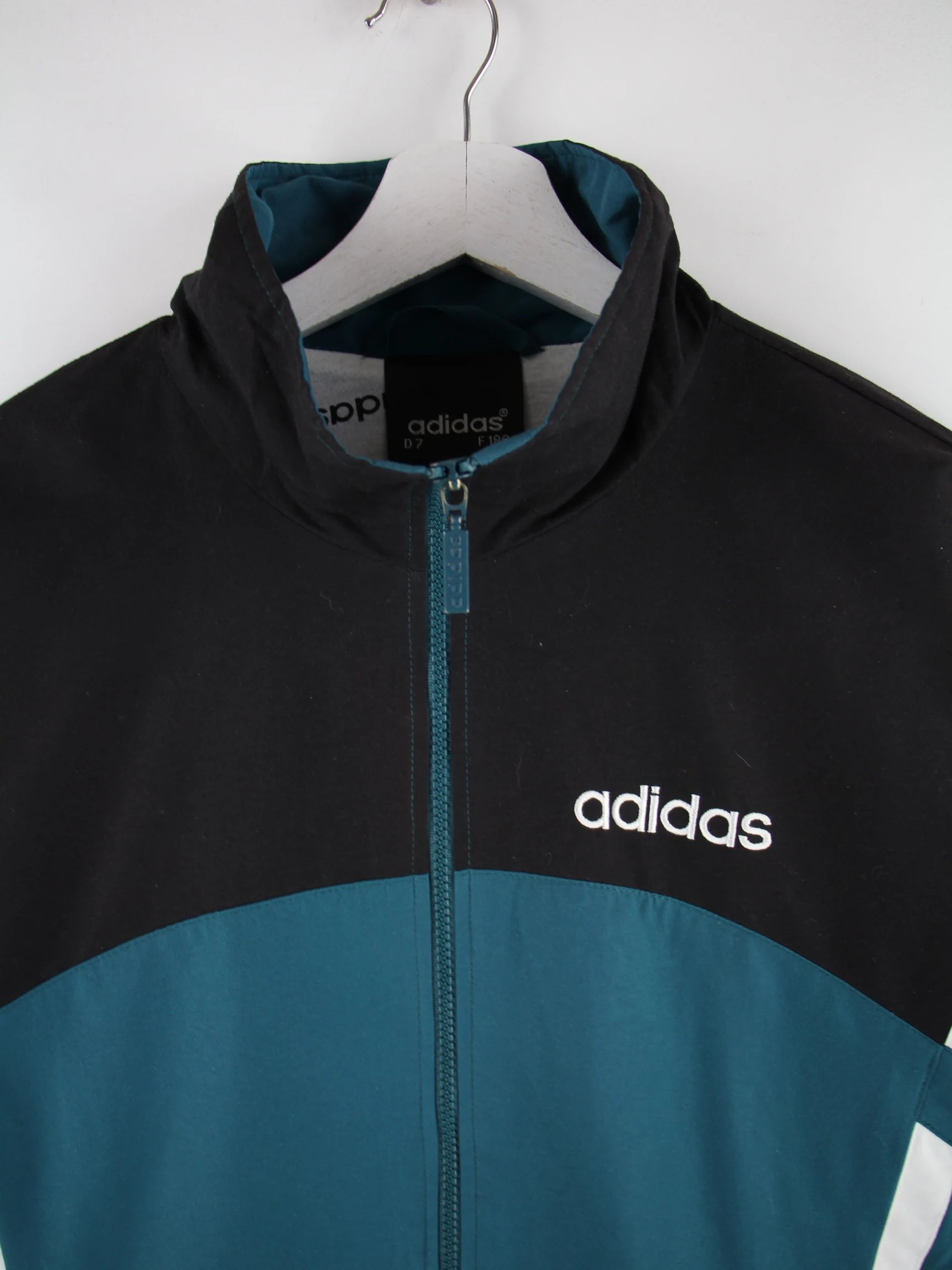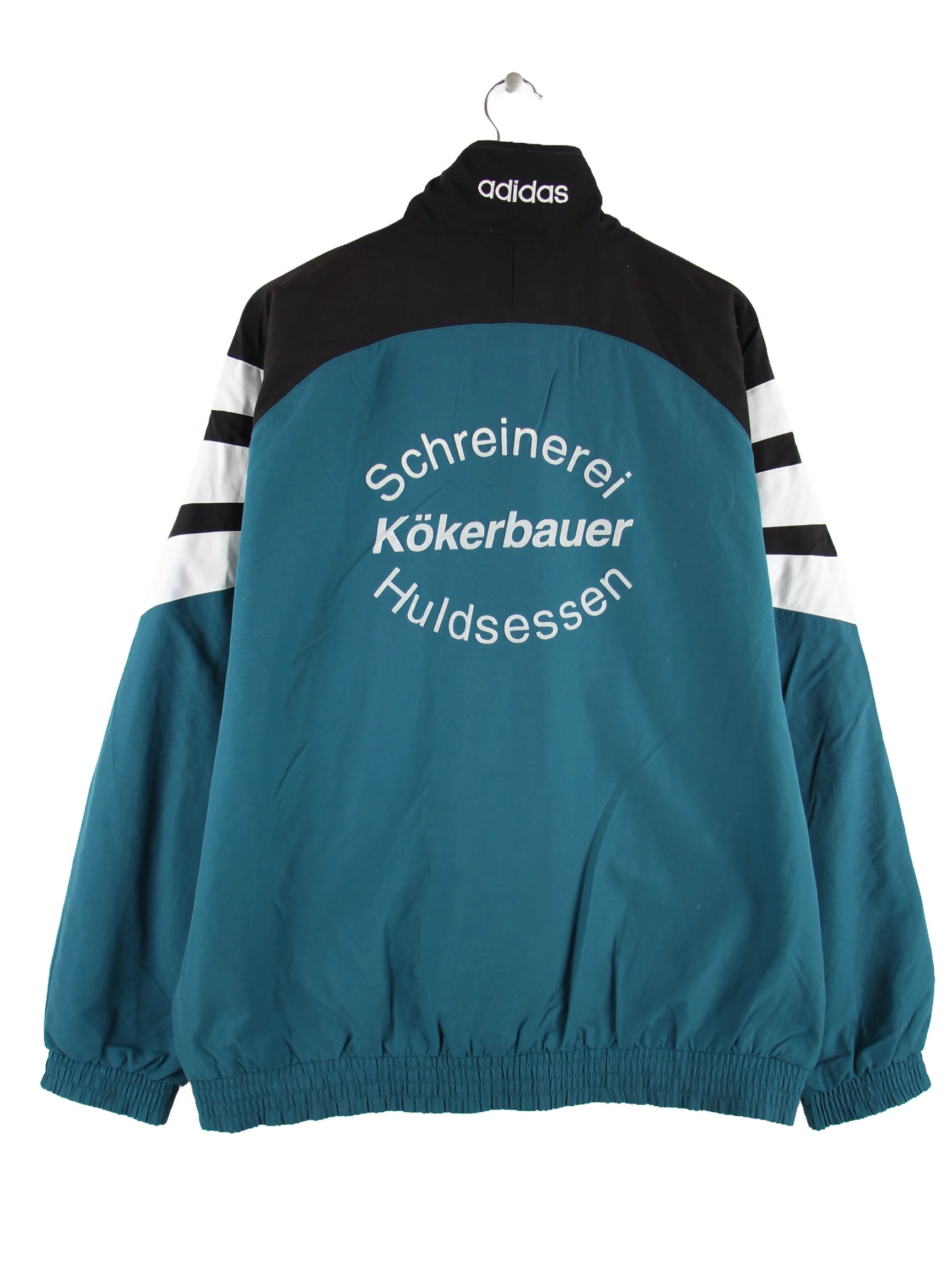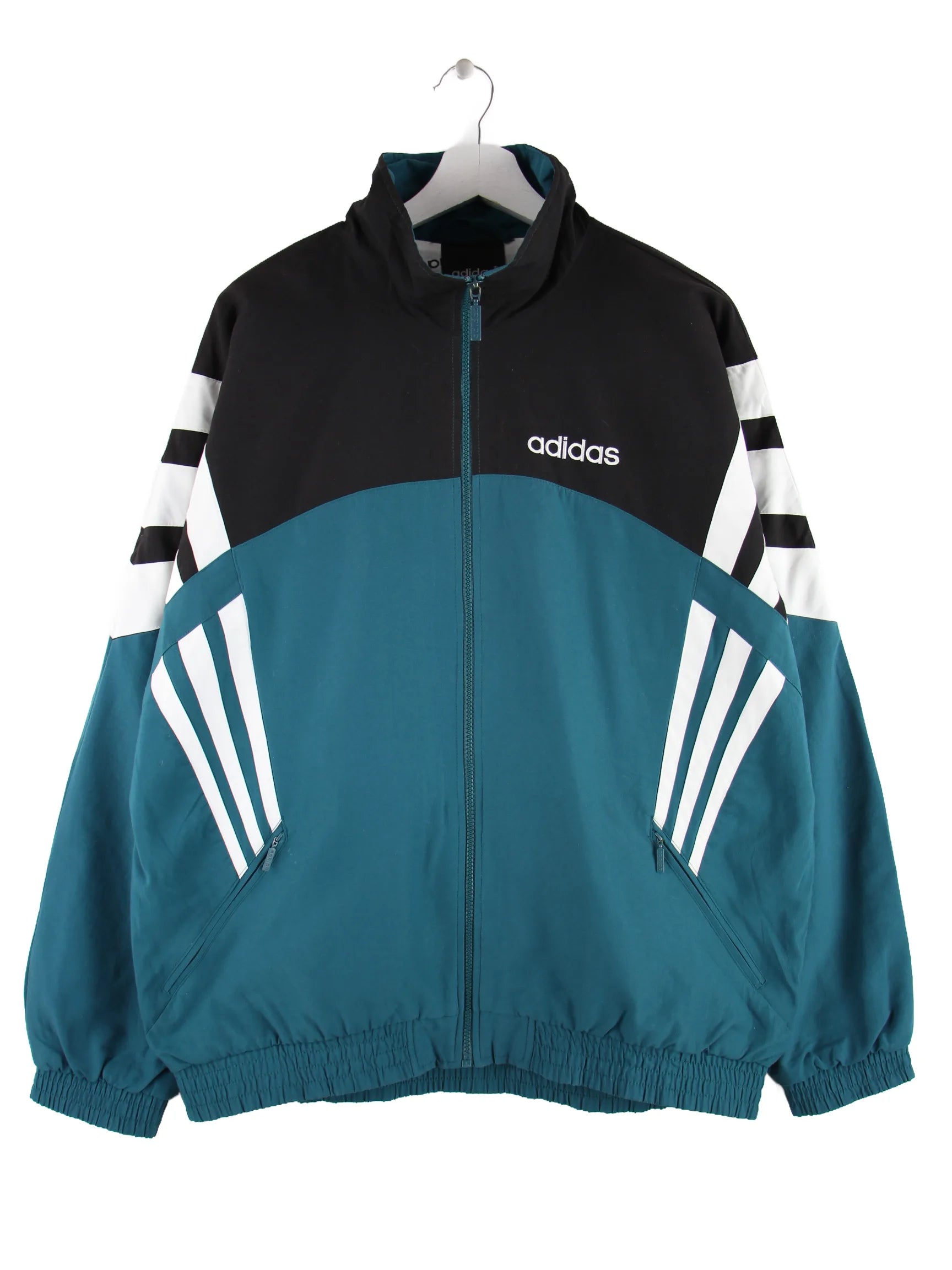 Trainingsjacke vom Brand Adidas in Größe XL aus den 90'ern. Sie ist aus Synthetik und in Grün bei uns zu bekommen. Mit schönem Vintage Print.