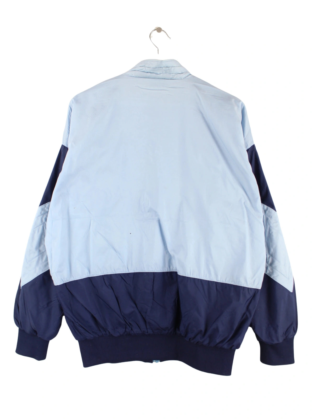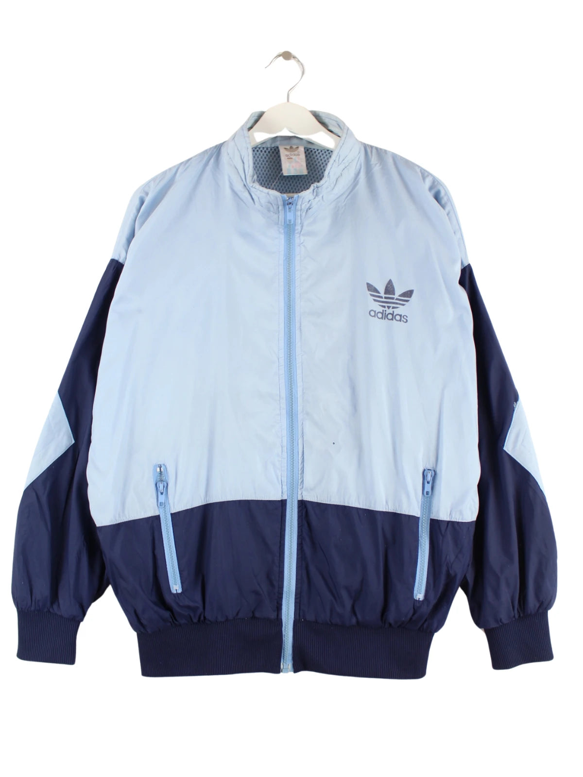 Blaue Trainingsjacke vom Brand Adidas aus den 90'ern in Größe L. Sie ist aus Synthetik angefertigt. Den Zustand würden wir als 'In Ordnung' bezeichnen (vergl. Bilder).Mit schönem Trefoil Print.