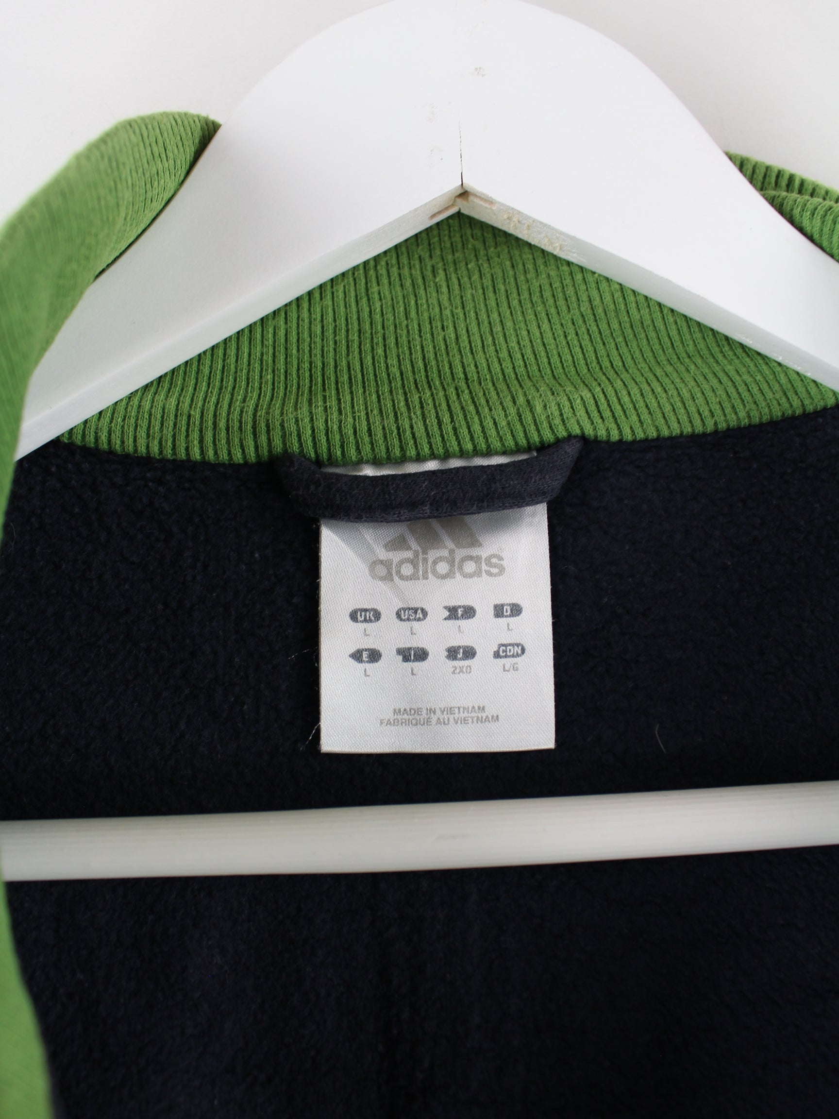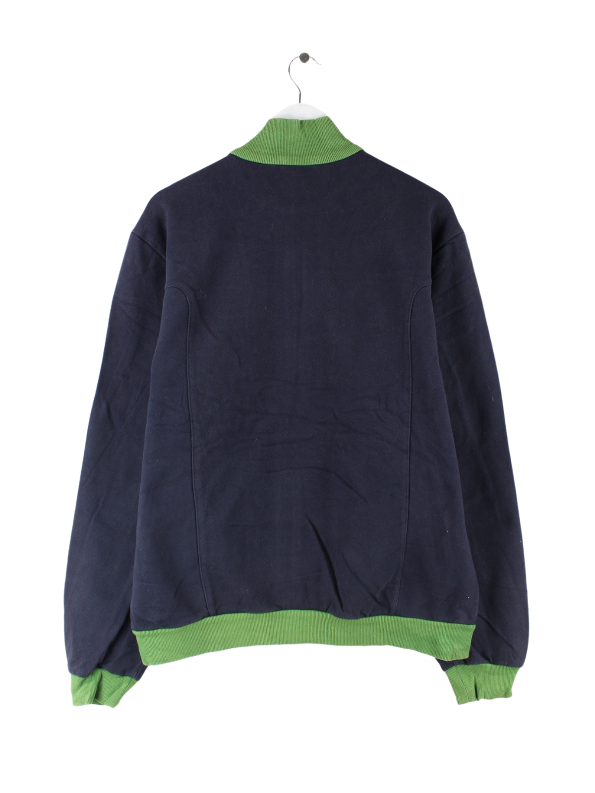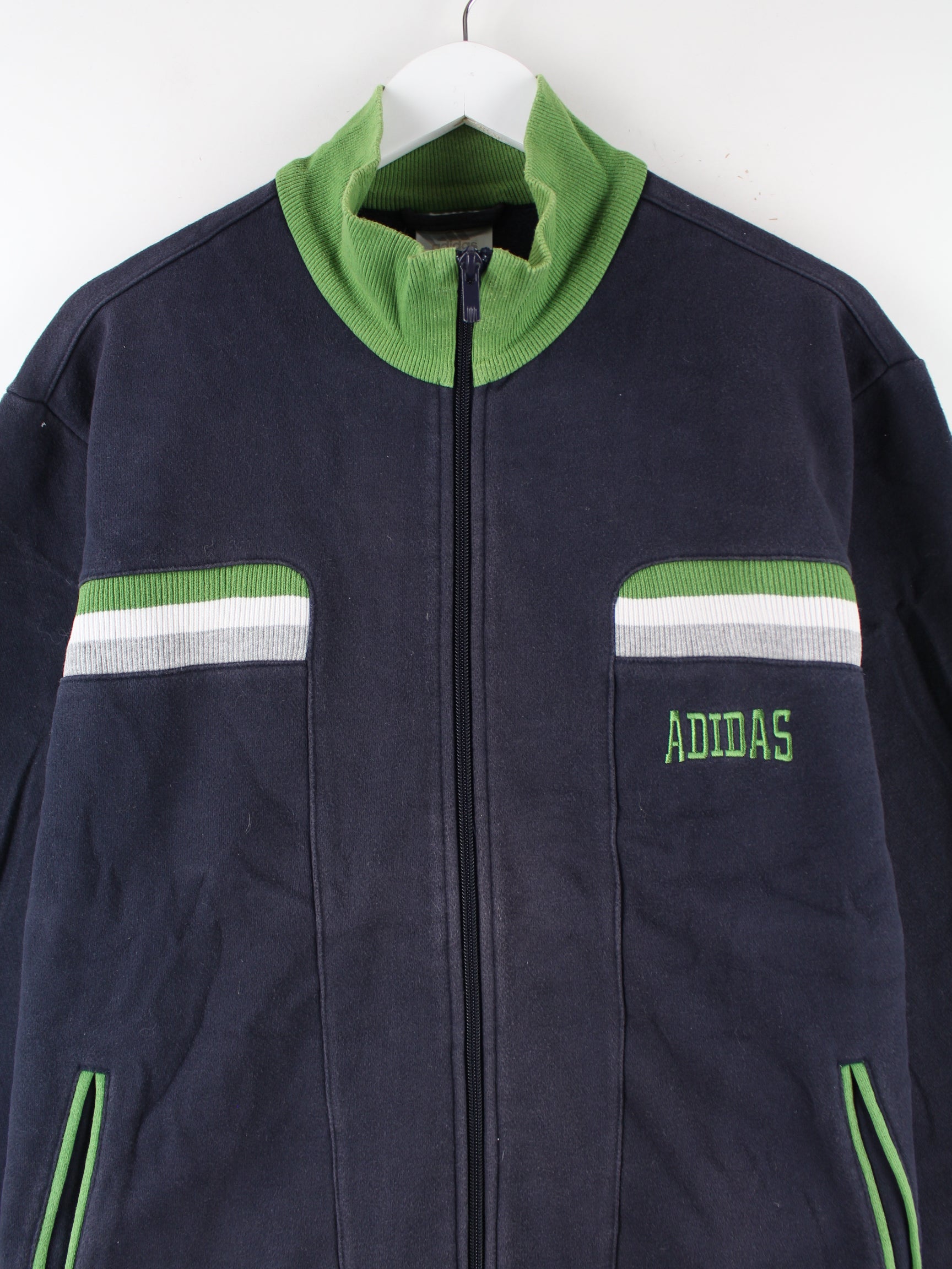 Sweatjacke vom Brand Adidas mit gesticktem Logo in Größe L. Sie ist aus einer Baumwollmischung hergestellt und in Blau im Bestand.