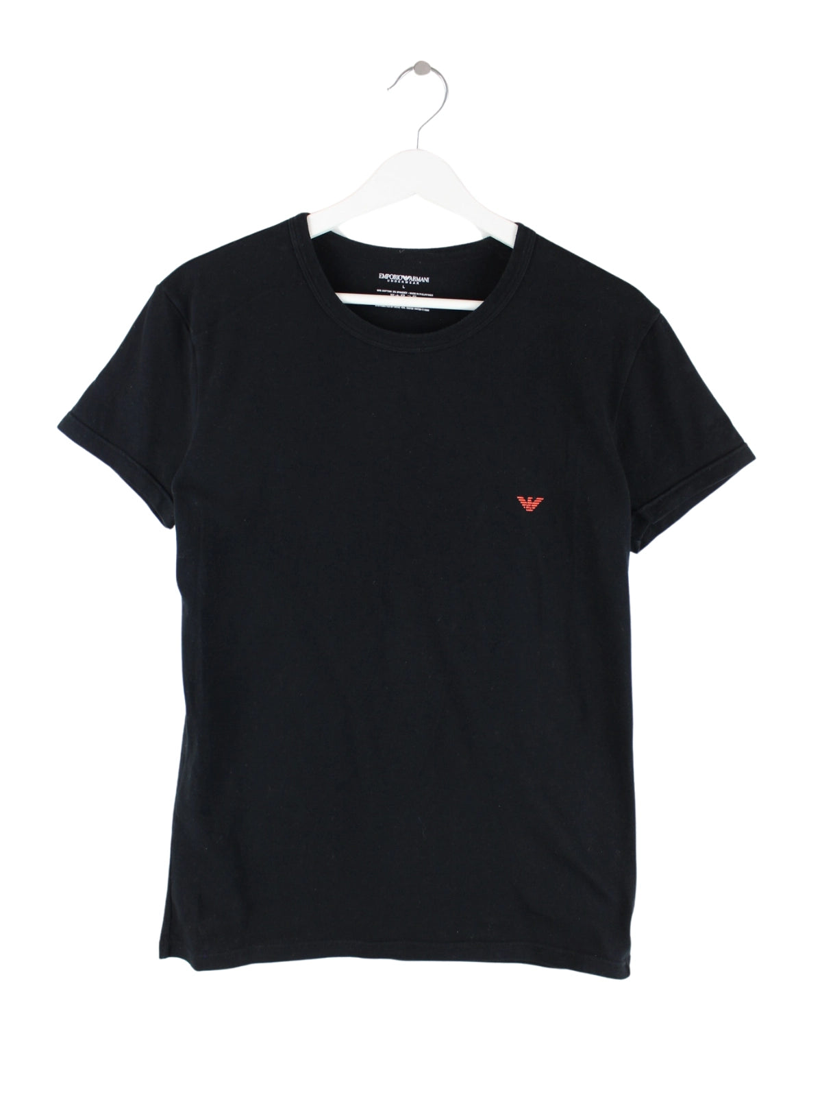 T-Shirt vom Label Armani in Größe L. Es ist aus einer Baumwollmischung angefertigt und in Schwarz zu haben.