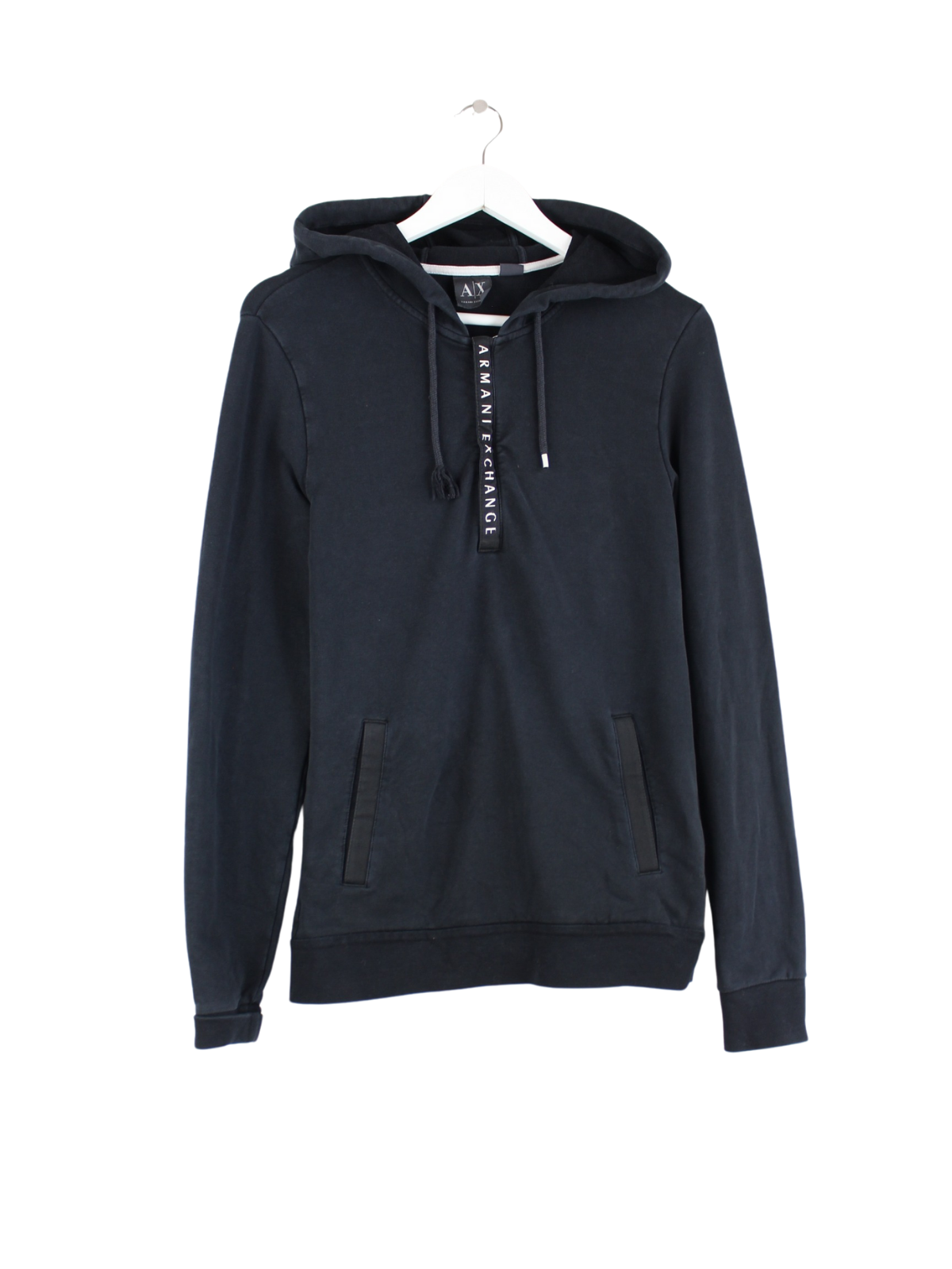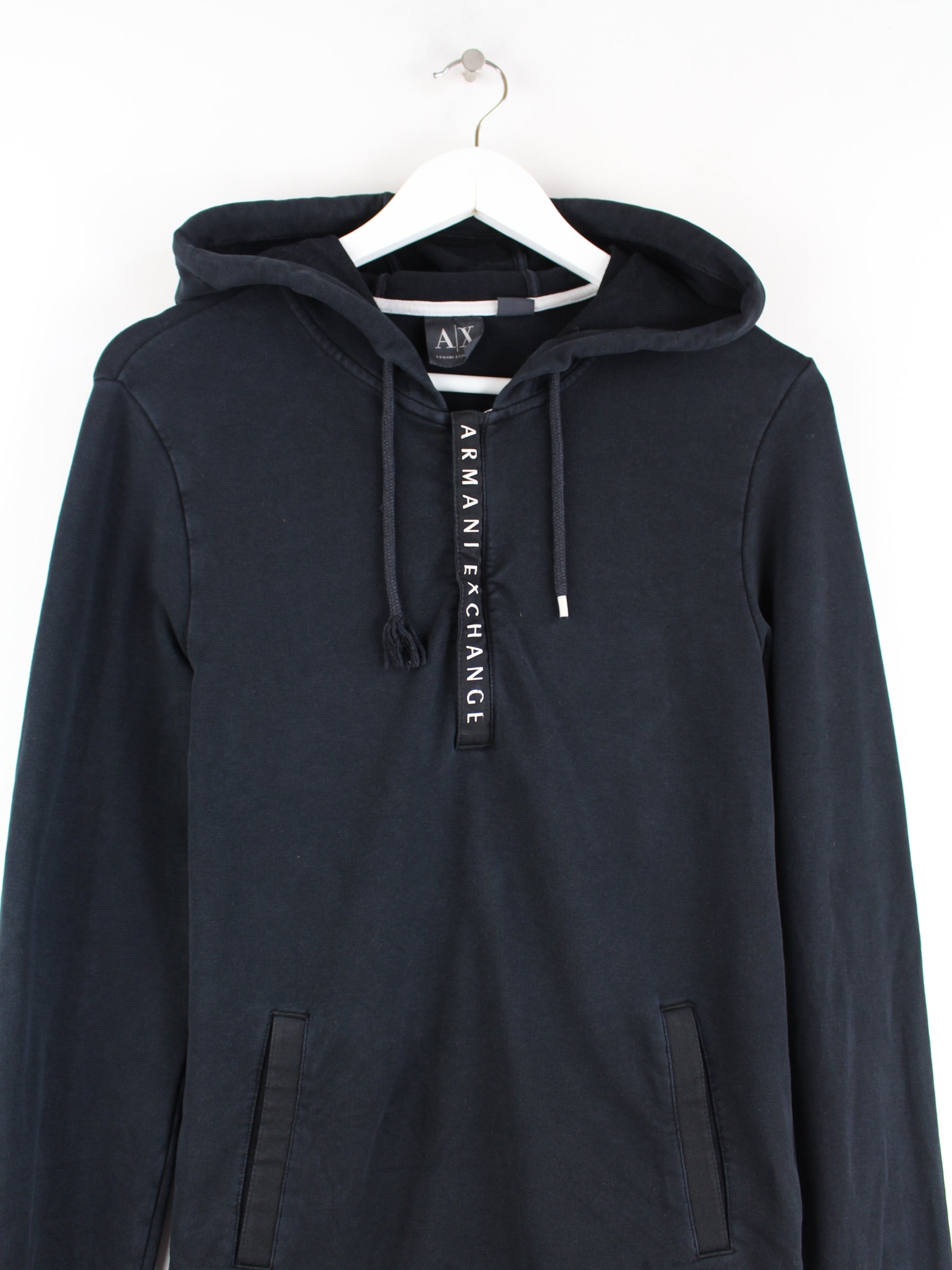 Hoodie by Armani with zip in size S. It is made from a cotton blend and is available in black.