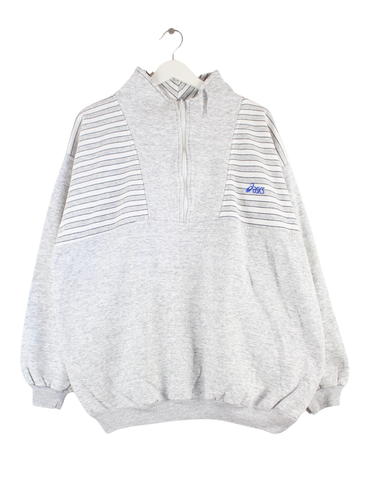 Grey sweater with embroidery and half zip from the brand Asics from the 90's in size L. It is made from a cotton blend. We would describe the condition as 'fine' (see pictures).