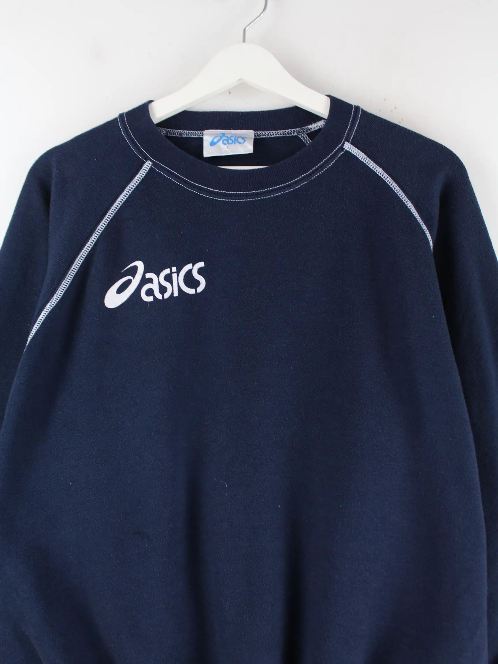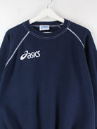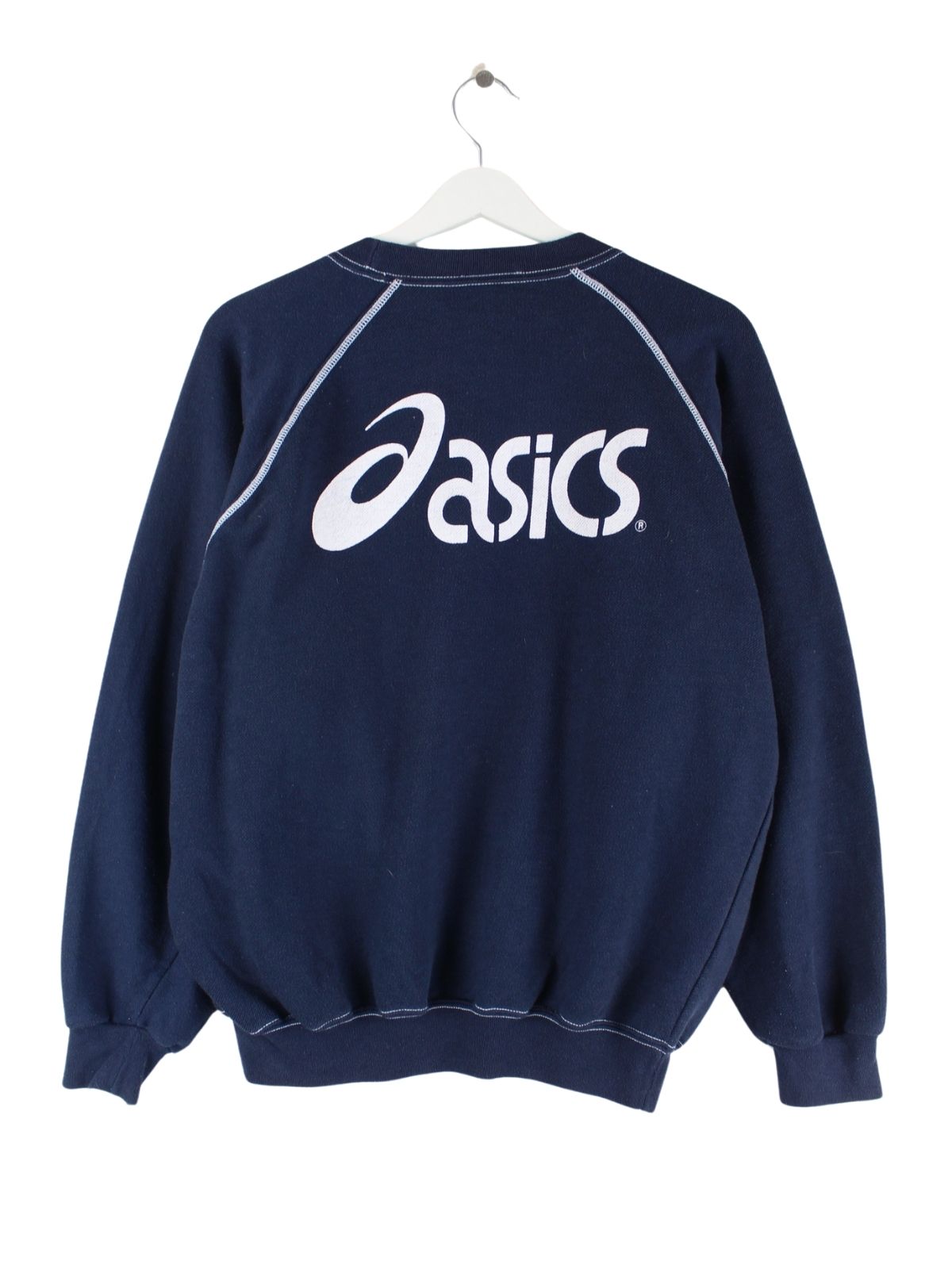 Sweater aus dem Hause Asics in Größe L aus den 90'ern. Er ist aus einer Baumwollmischung produziert und in Blau bei uns zu bekommen. Mit tollem Vintage Print.