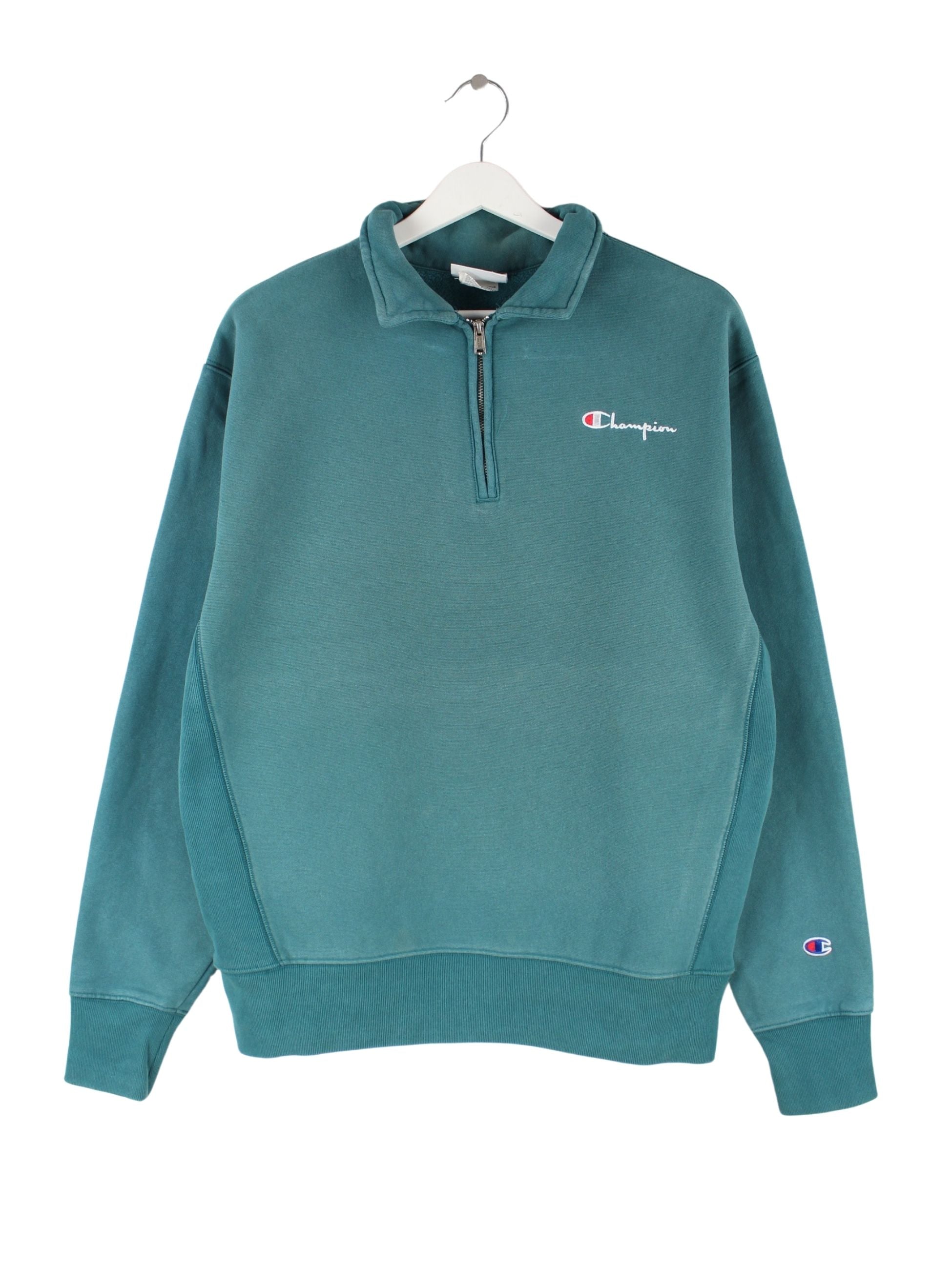 Grüner Sweater mit halbem Reißverschluß vom Label Champion in Größe M. Er ist aus einer Baumwollmischung gemacht und in sehr gutem Zustand im Angebot.