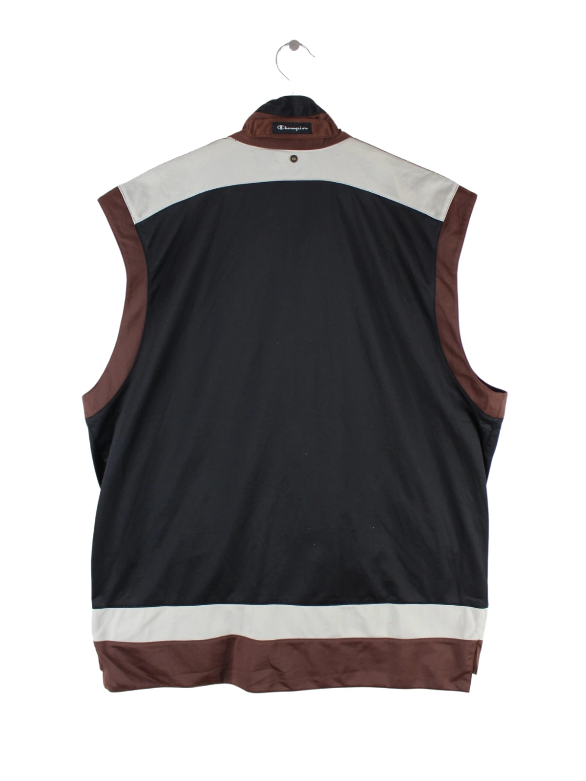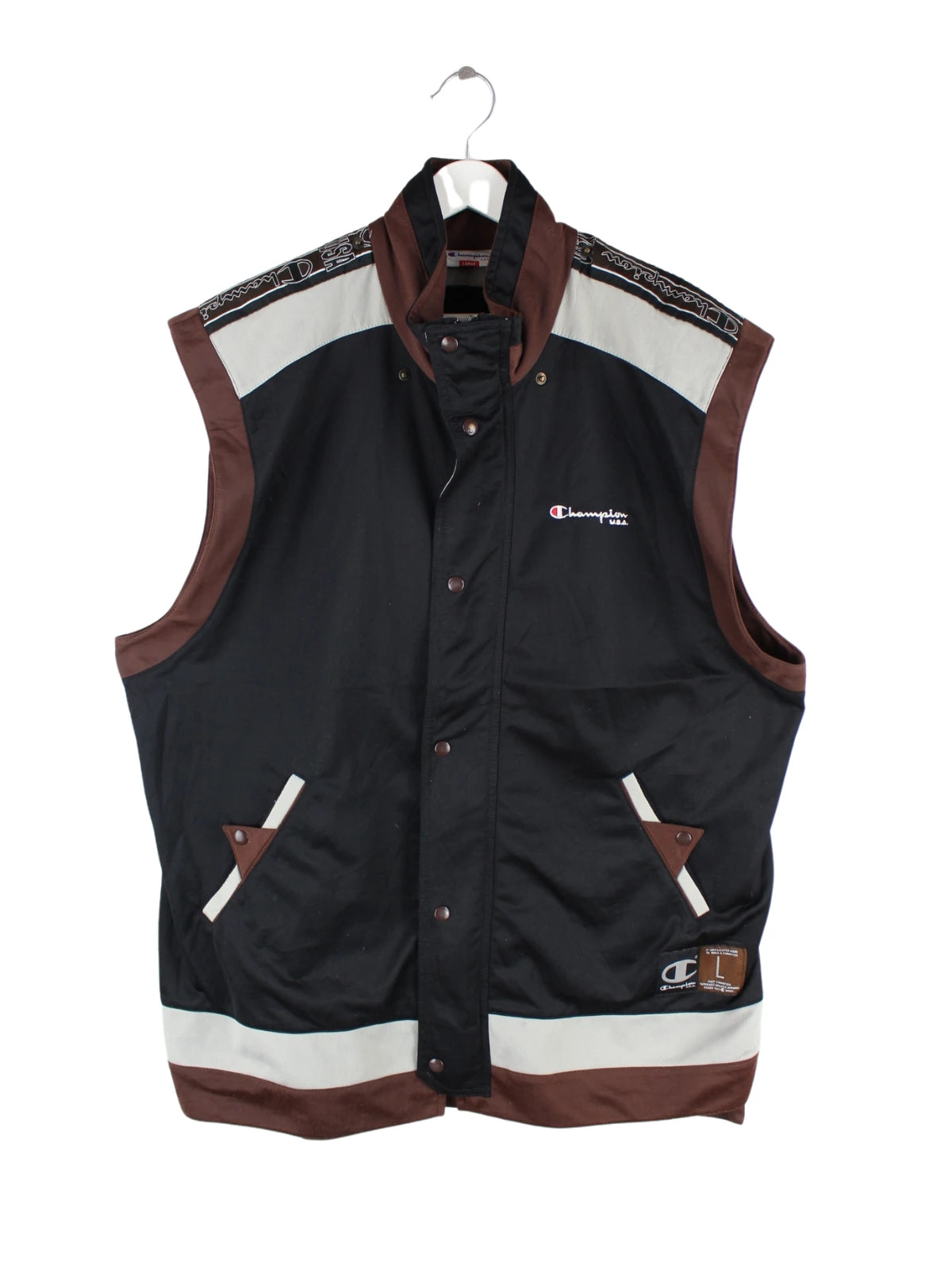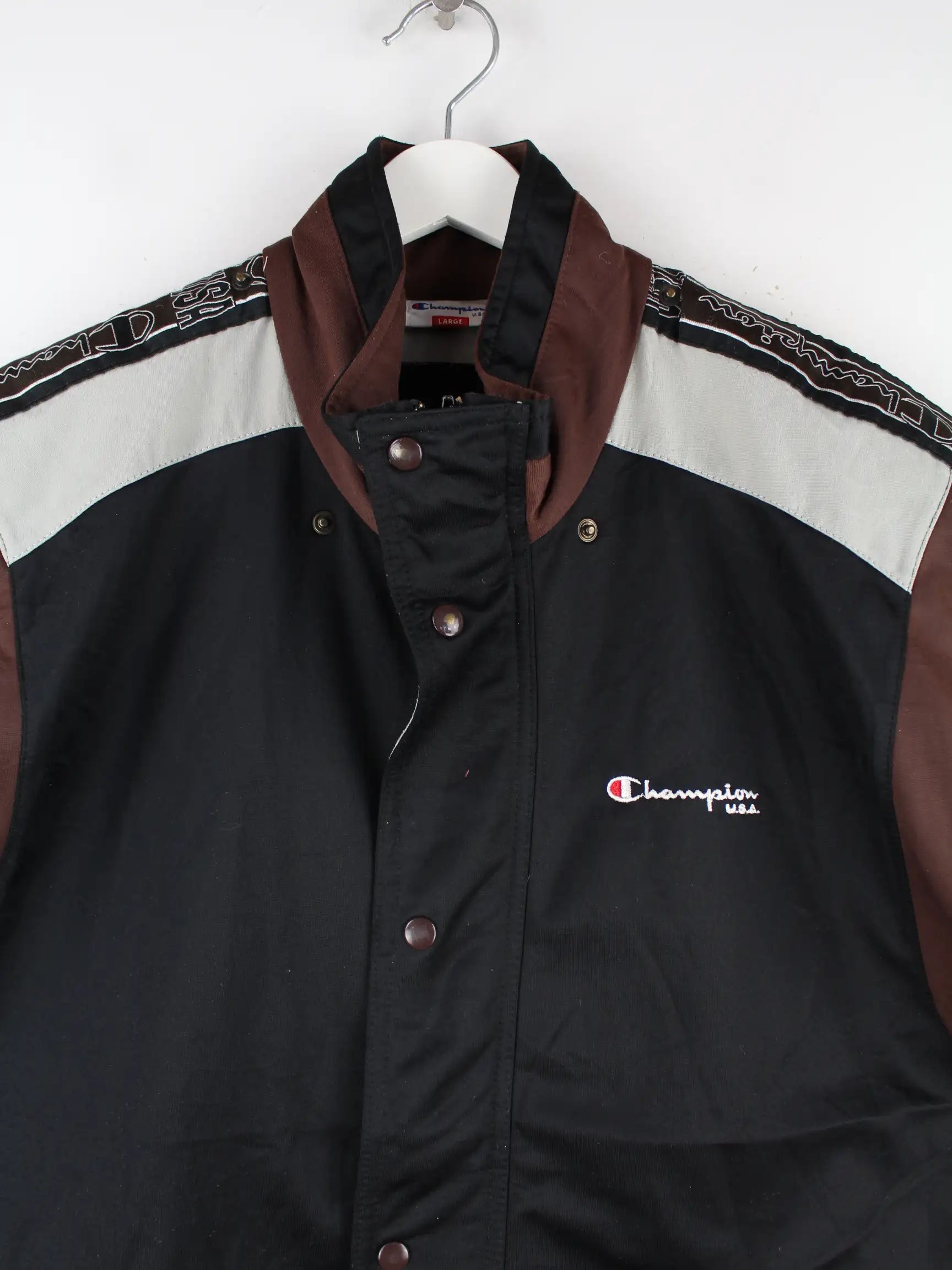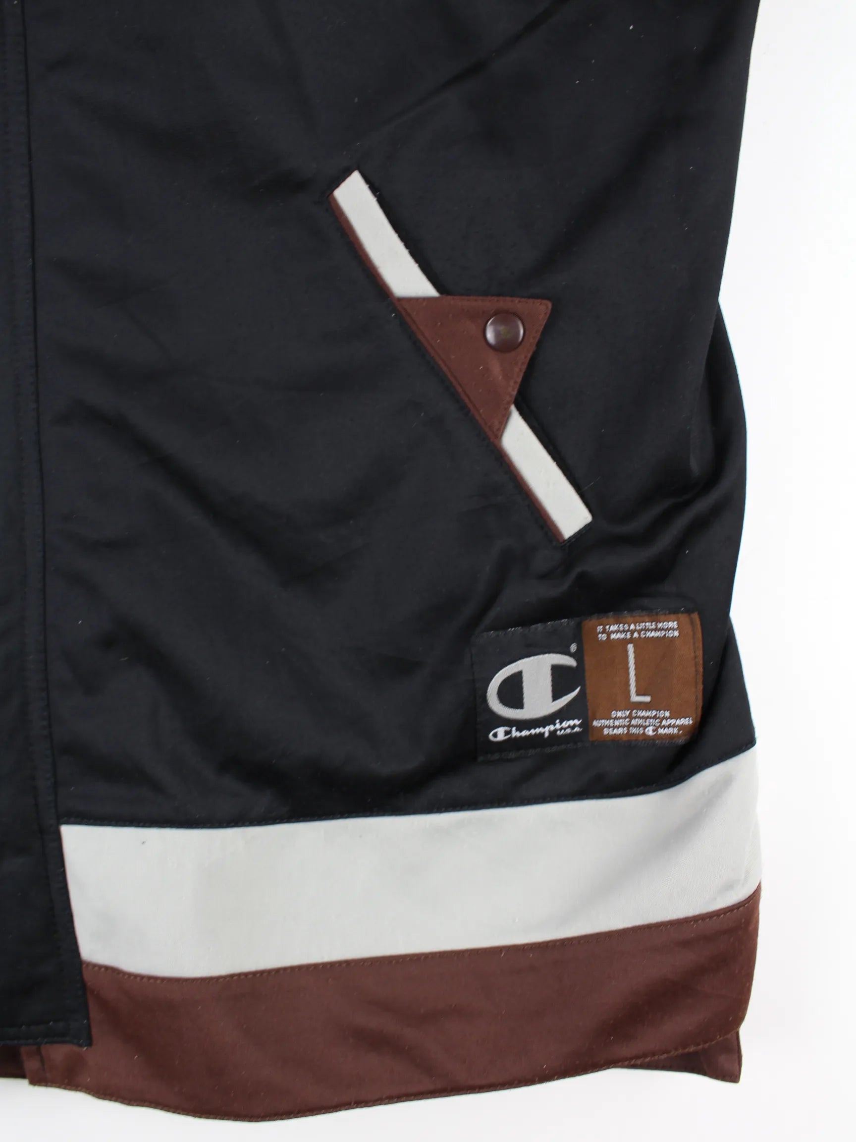 Schwarze Trainingsjacke der Marke Champion in Größe L. Sie ist aus Synthetik gefertigt und in sehr gutem Zustand auf Lager.