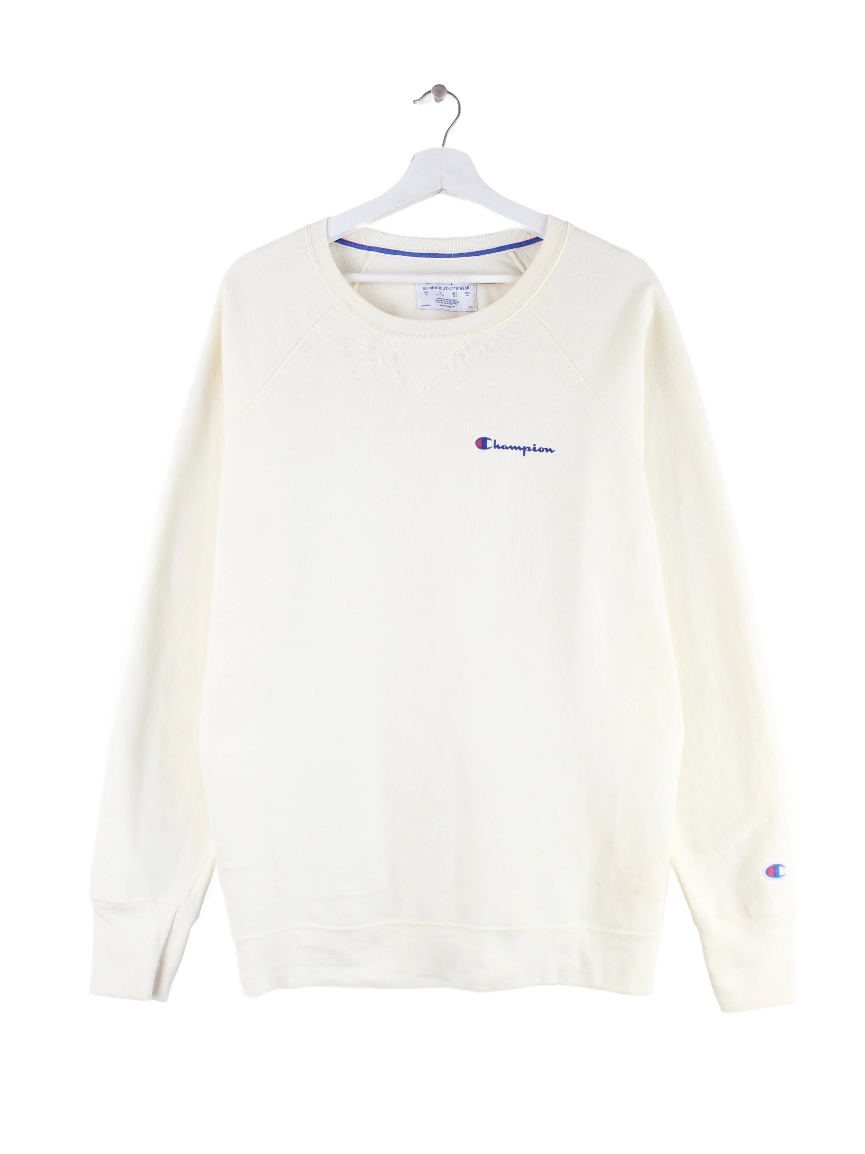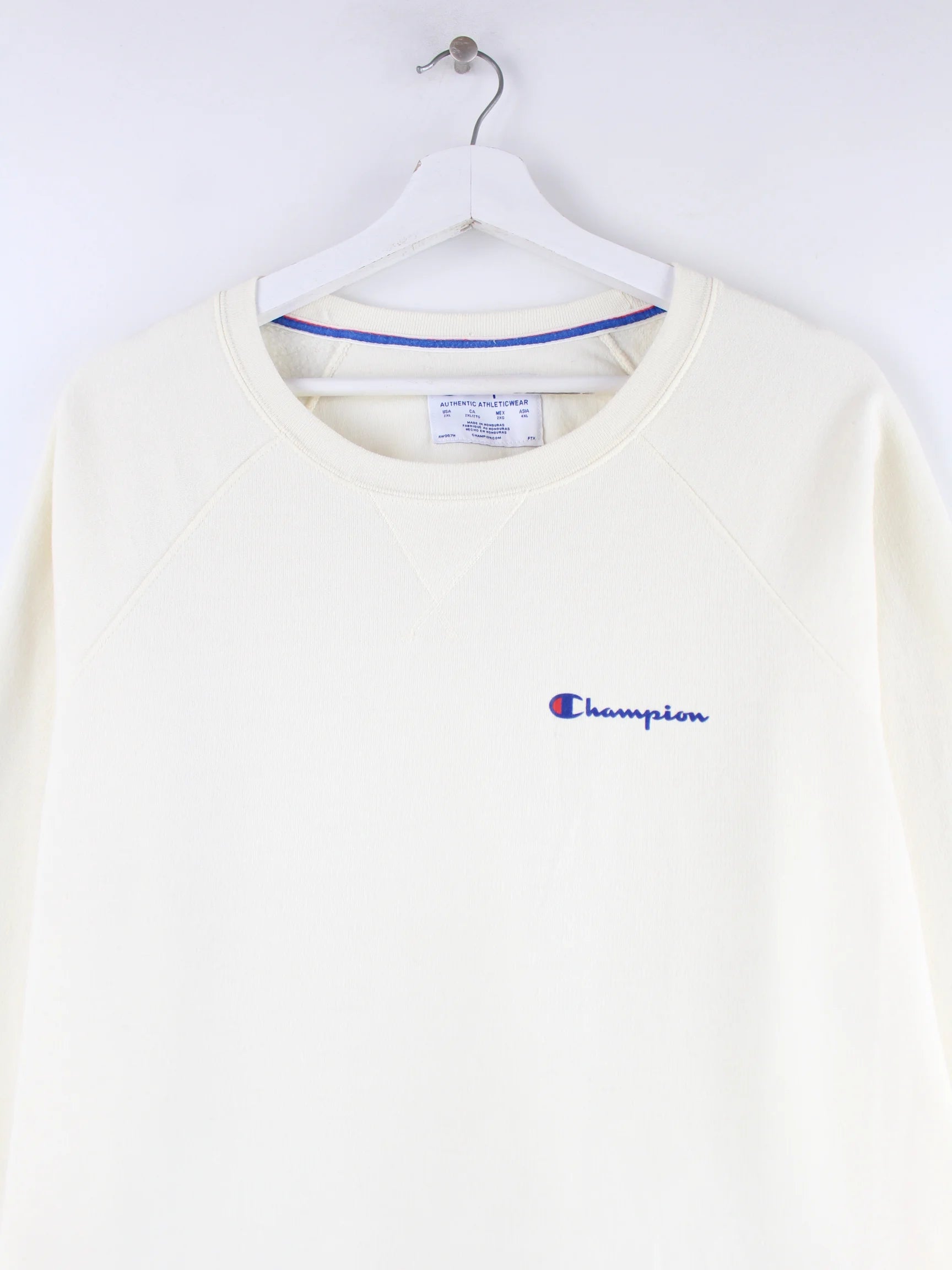 Weißer Sweater von Champion in Größe XXL. Er ist aus einer Baumwollmischung gefertigt. Den Zustand würden wir als 'In Ordnung' bezeichnen (vergl. Bilder).