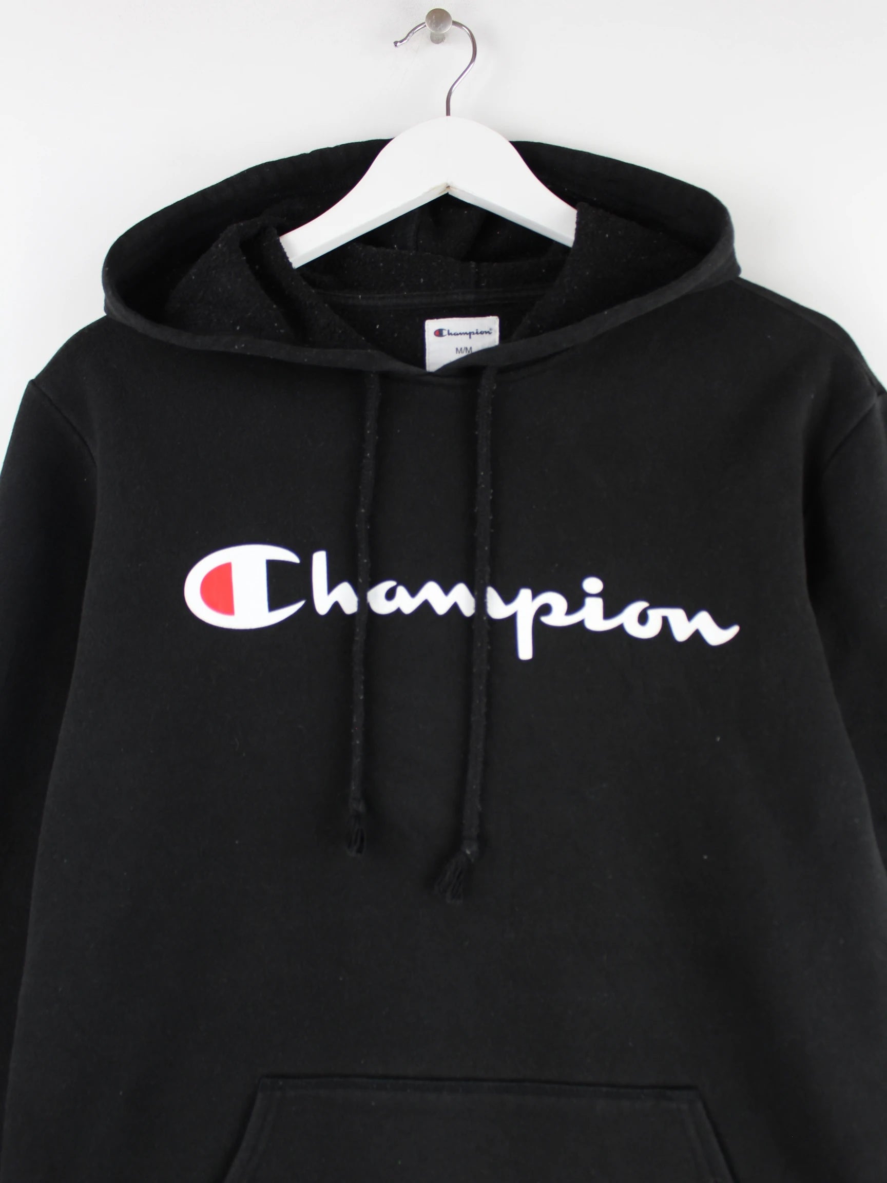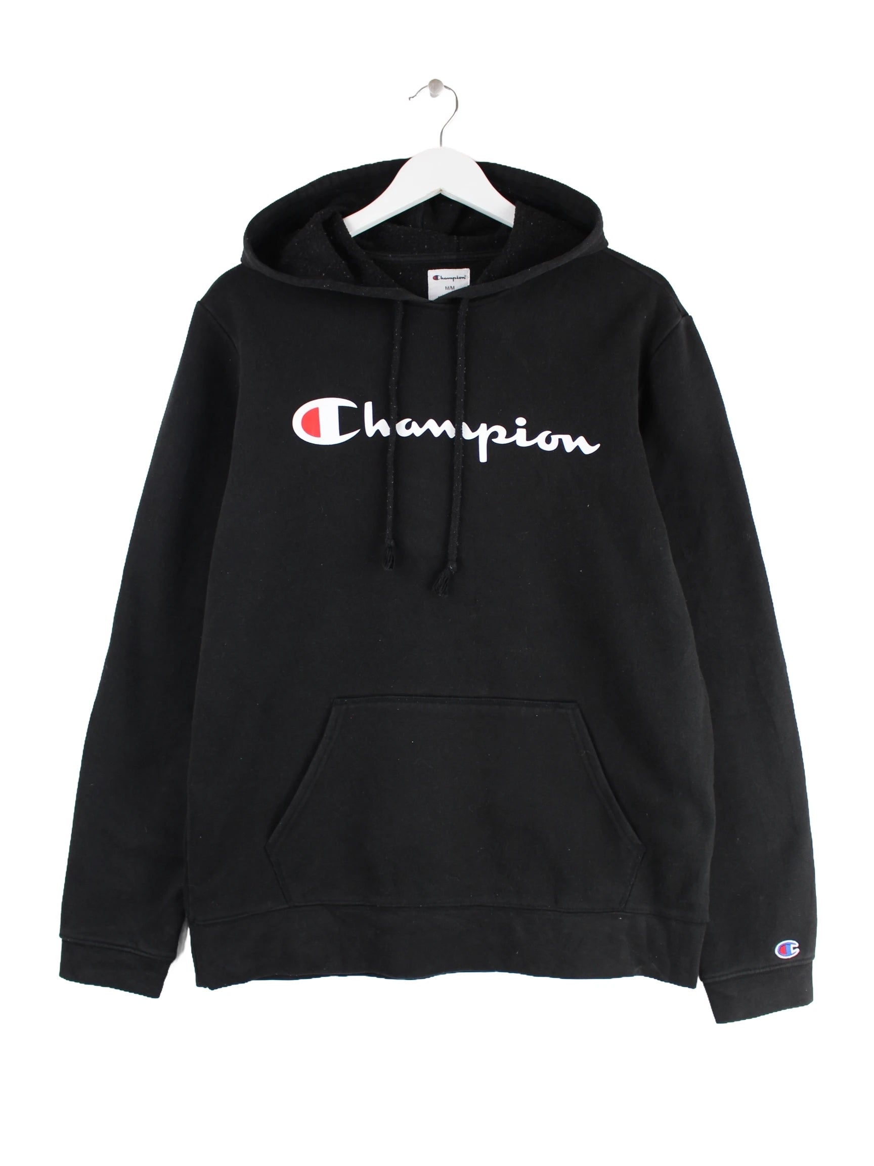 Hoodie von Champion in Größe M. Er ist aus einer Baumwollmischung gemacht und in Schwarz zu haben. Mit schönem Logo Print.