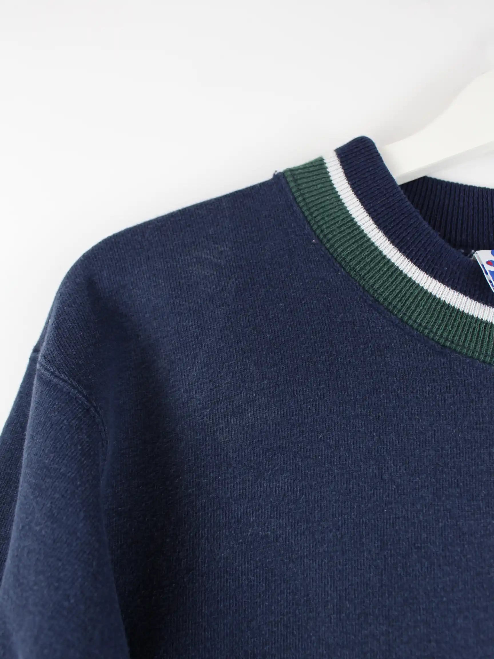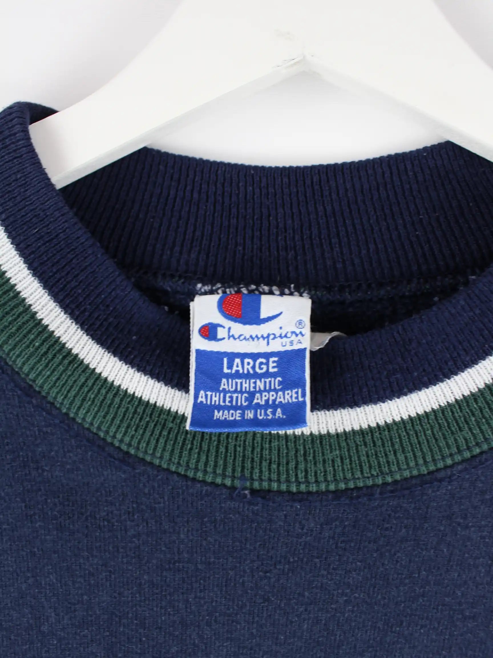 Sweater des Labels Champion in Größe L aus den 90'ern. Er ist aus einer Baumwollmischung hergestellt und in Blau zu haben.