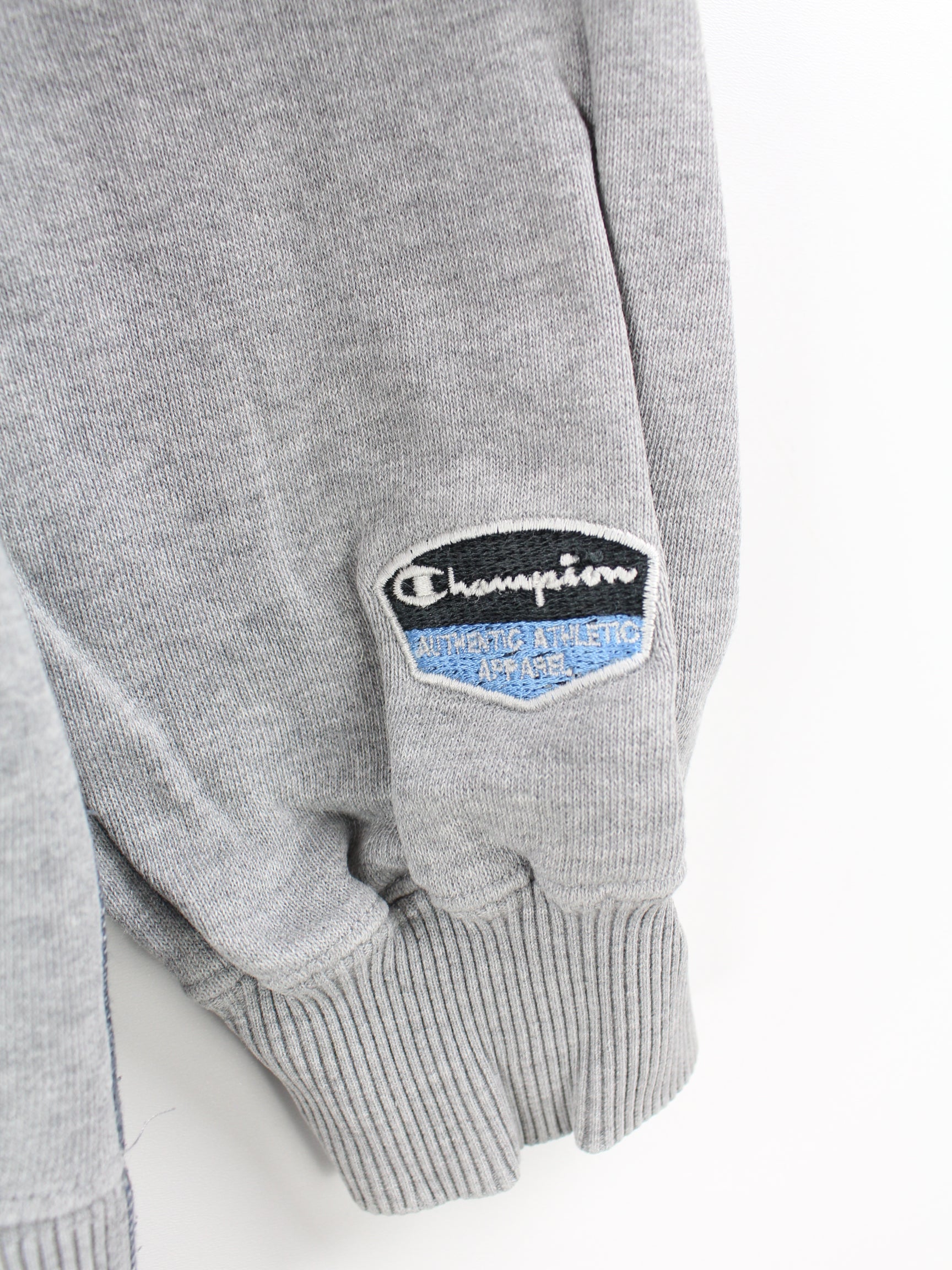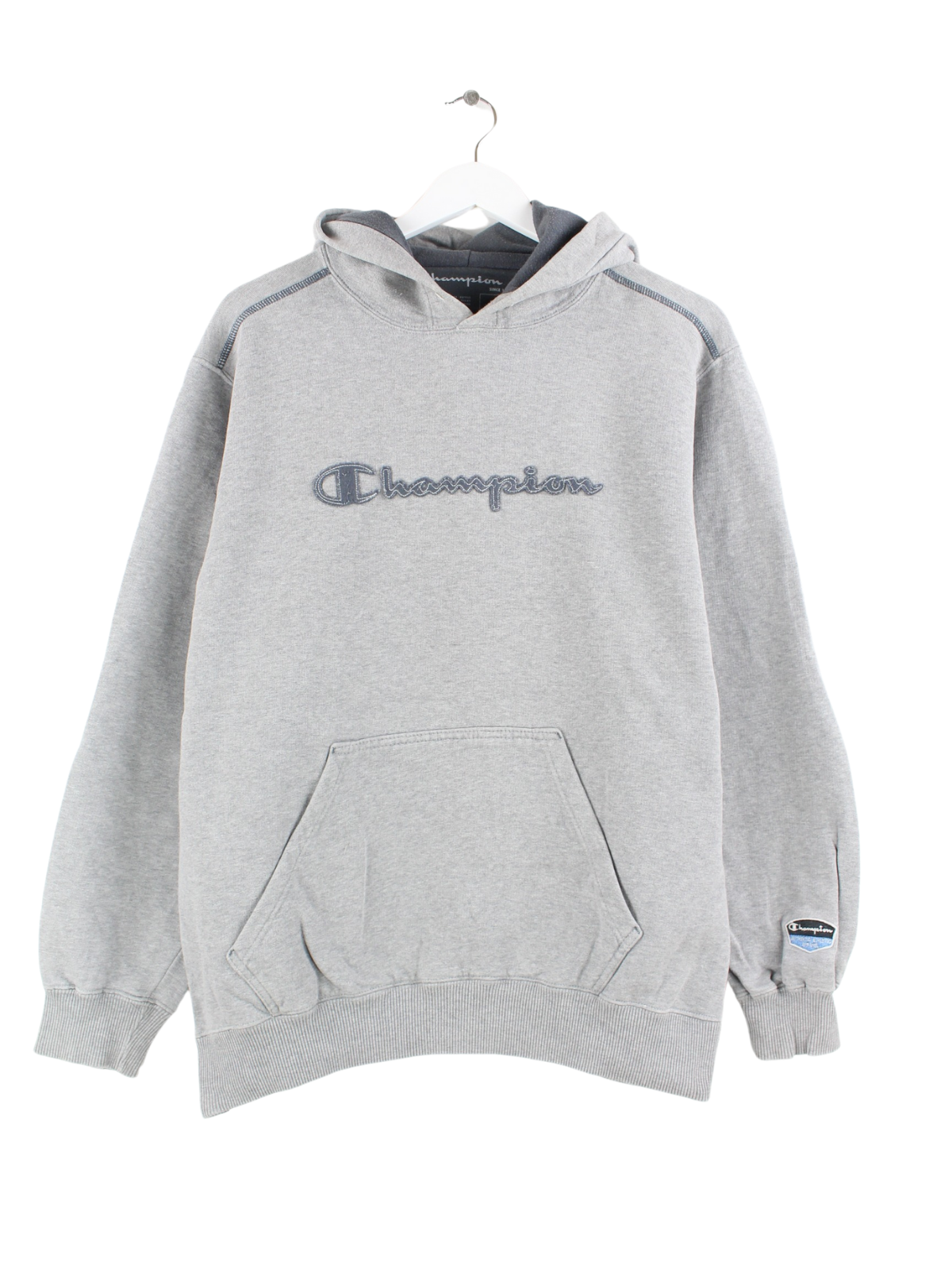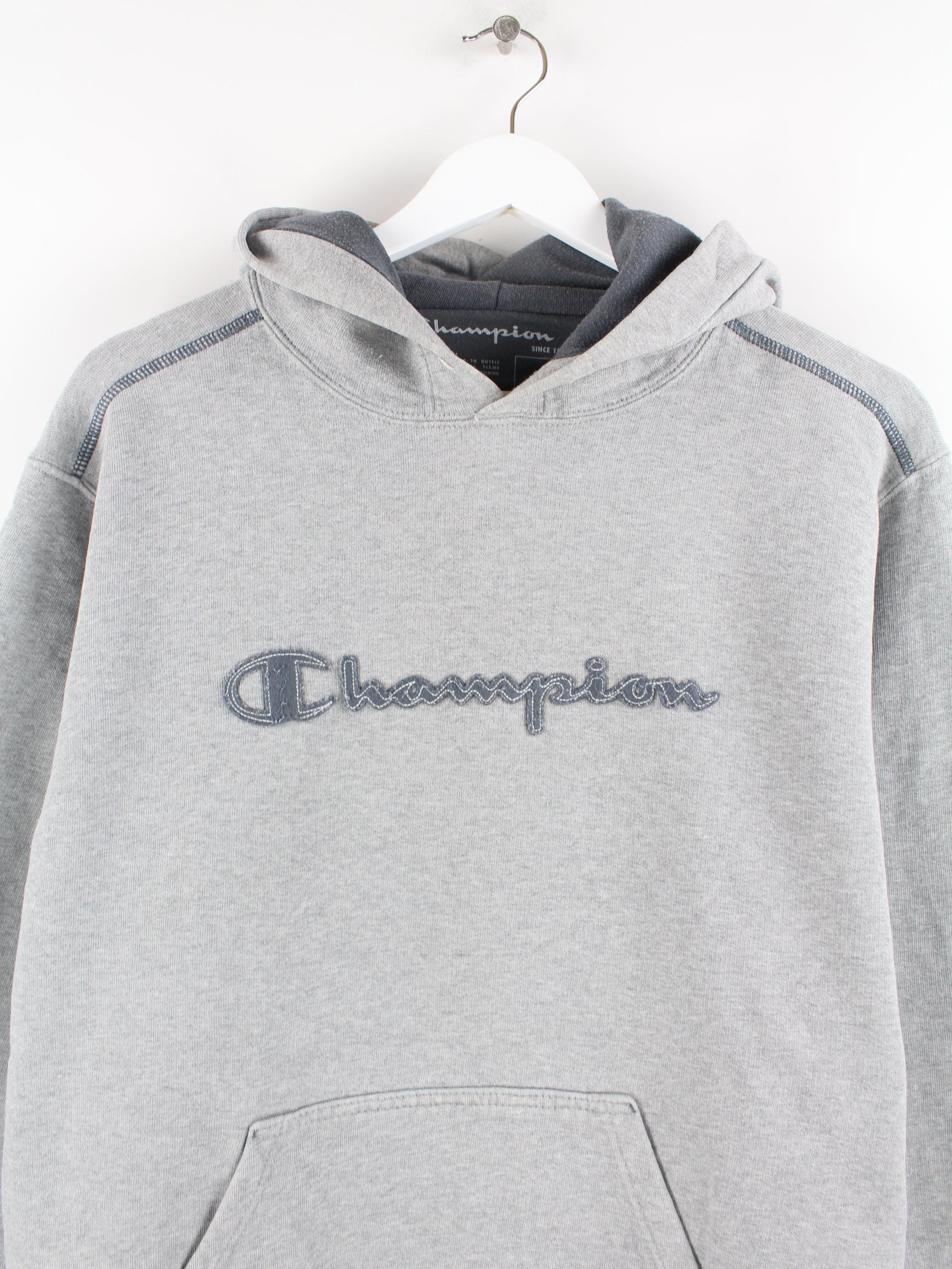 Hoodie from Champion with embroidered motifs in size L. It is made from a cotton blend and is available in gray.