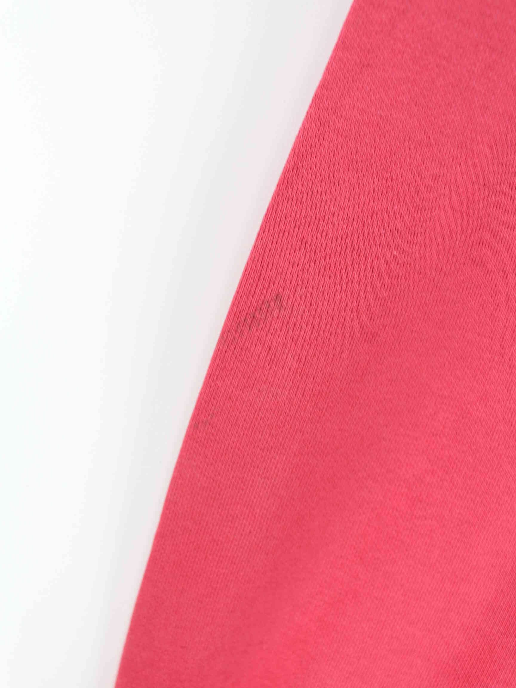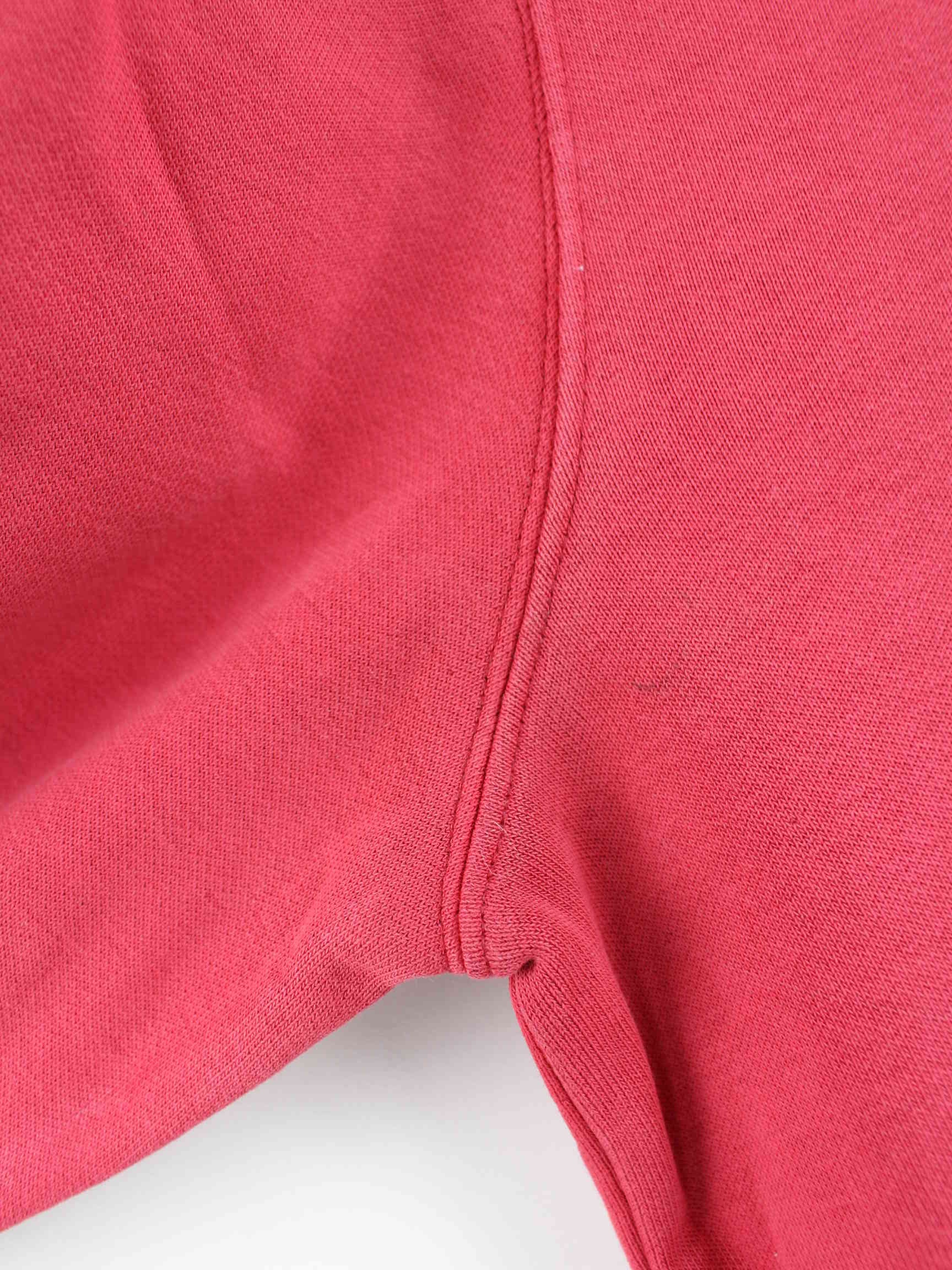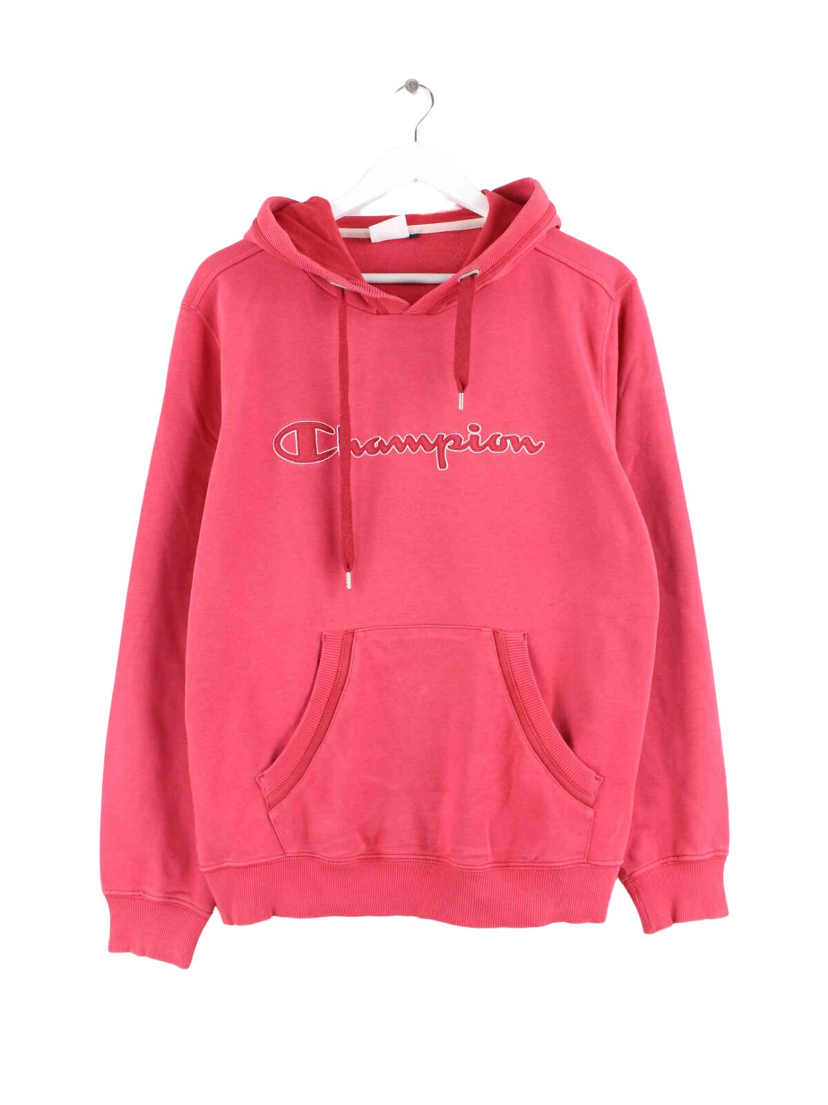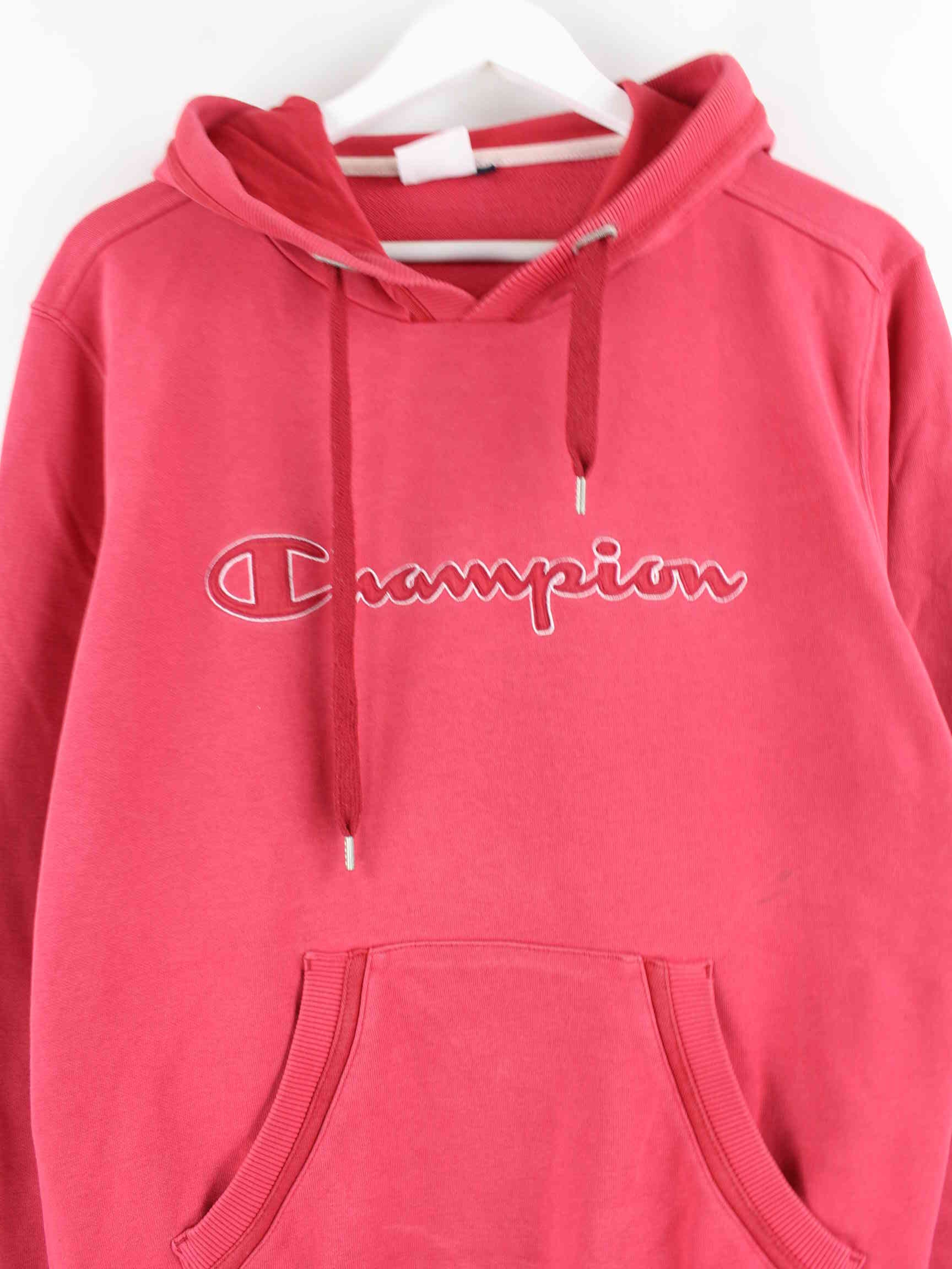 Red hoodie with embroidery from the Champion label in size M. It is made from a cotton blend and is in stock in good condition.