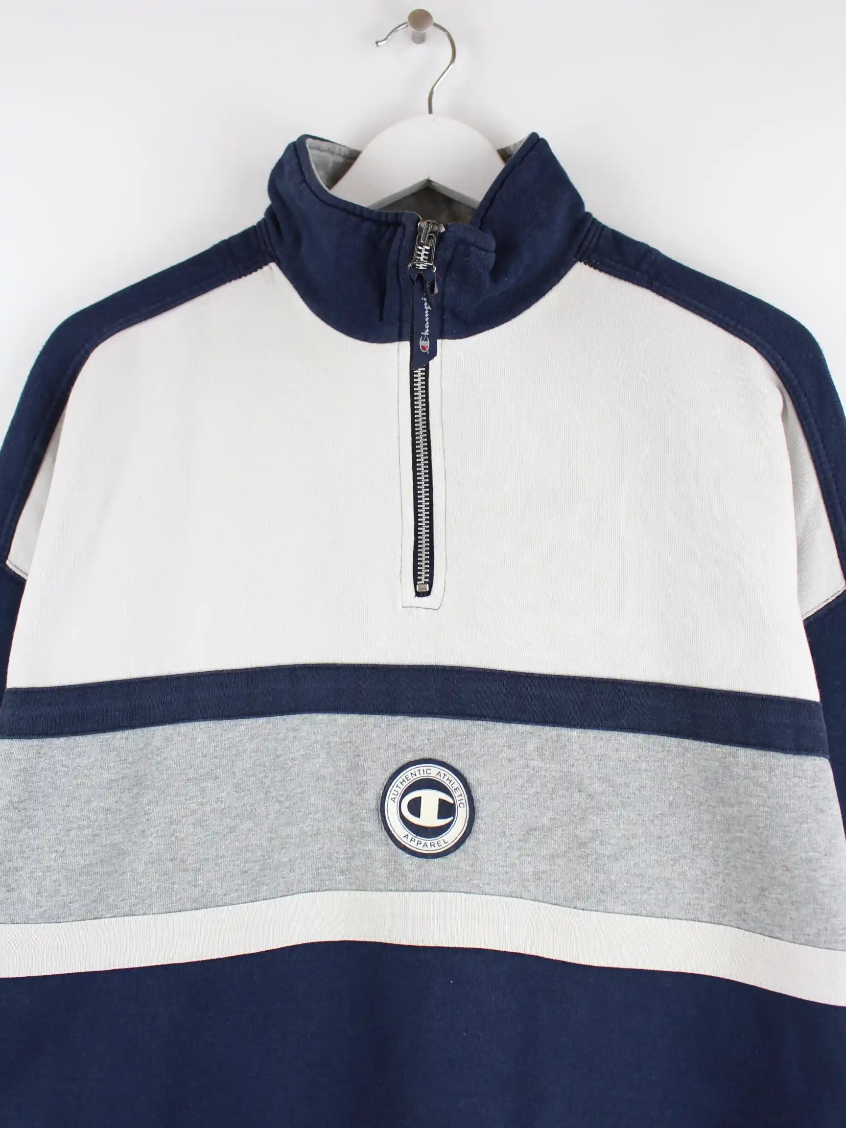 Blauer Sweater mit kurzem Reißverschluß der Brand Champion in Größe L. Er ist aus einer Baumwollmischung gefertigt und in gutem Zustand im Bestand.