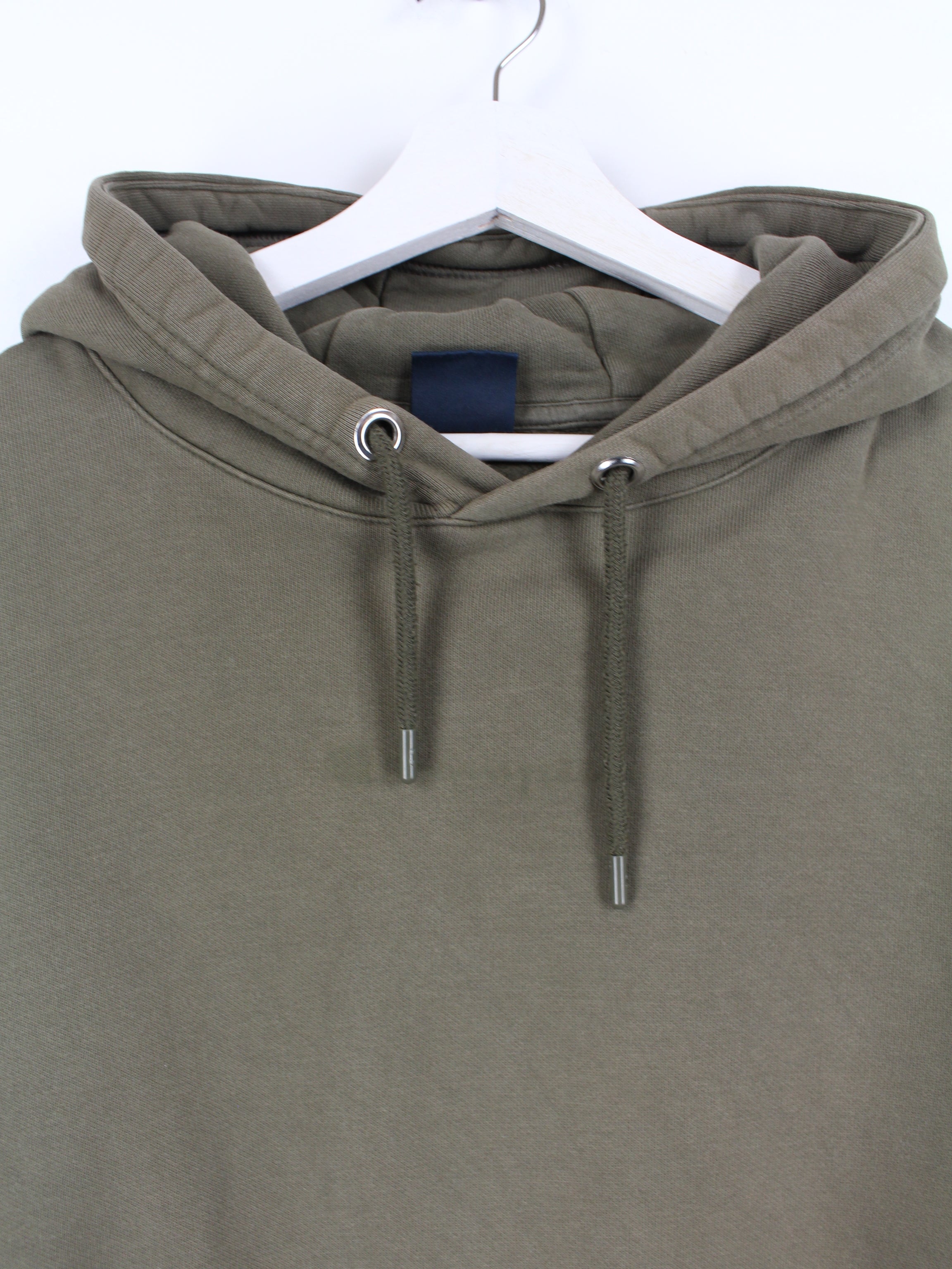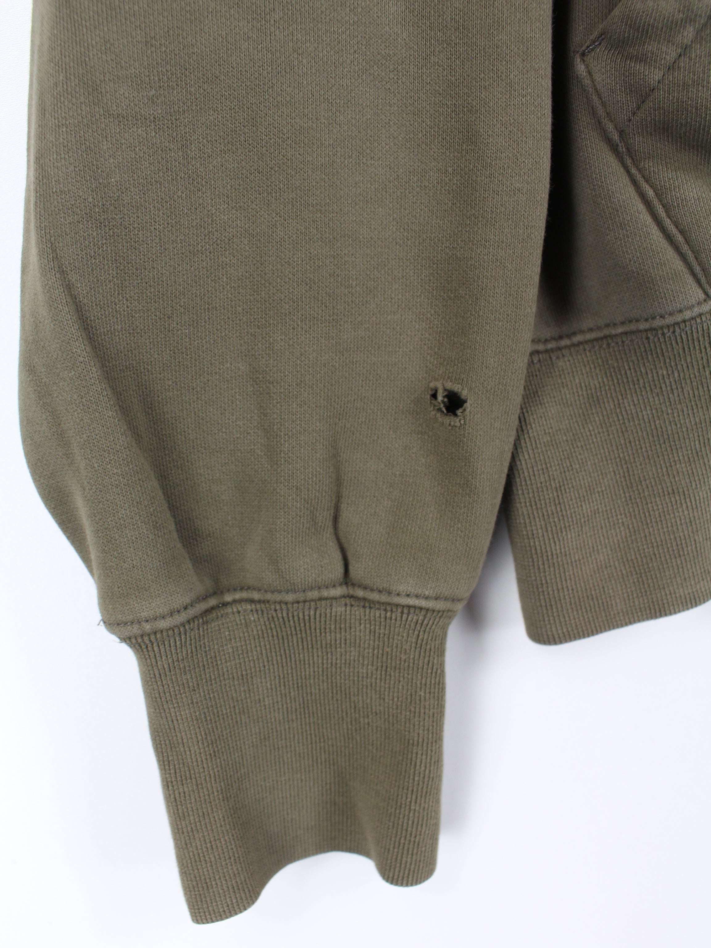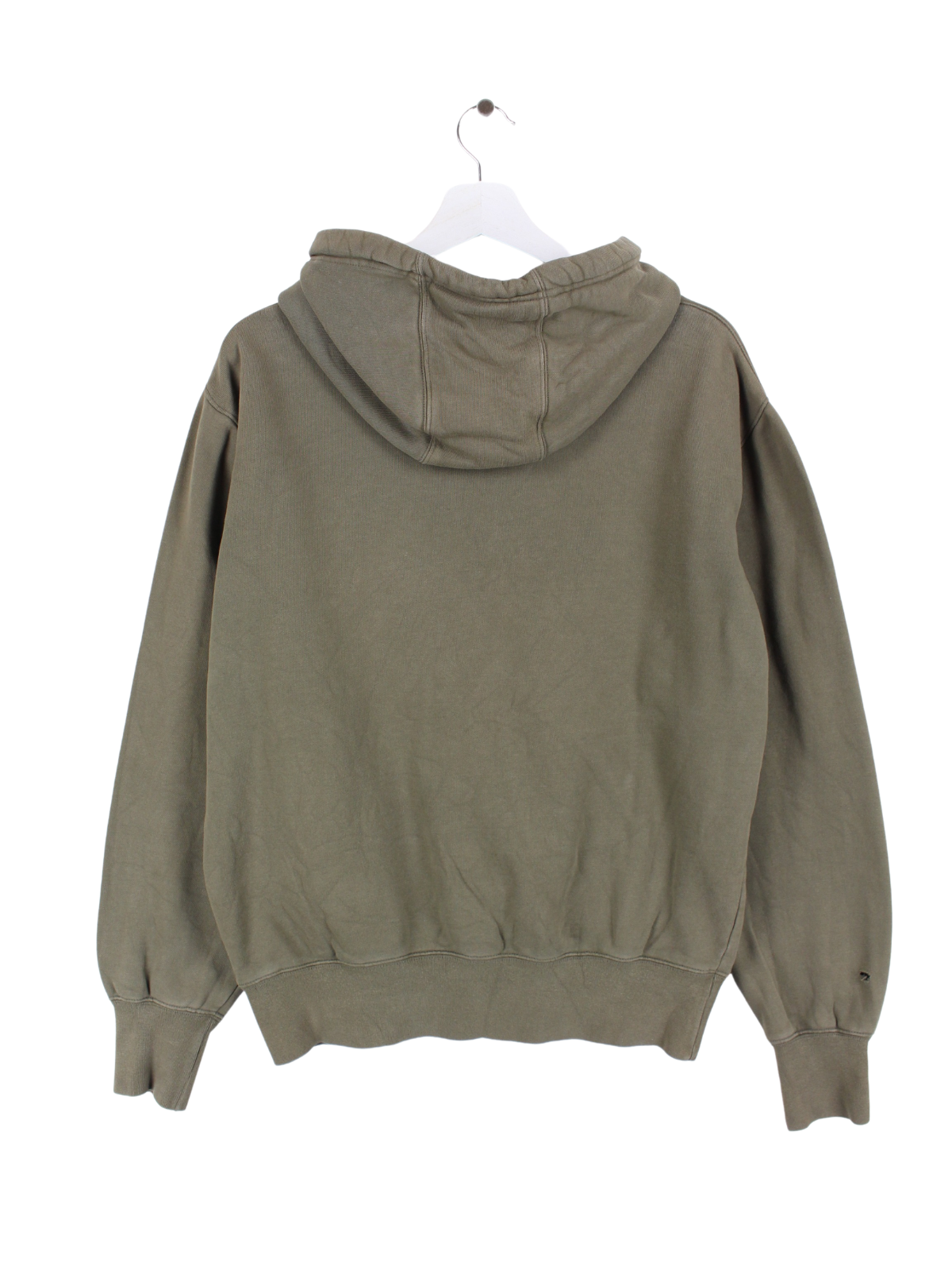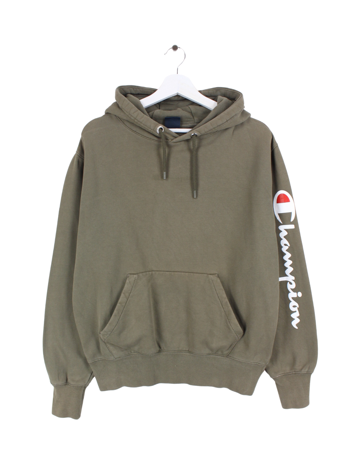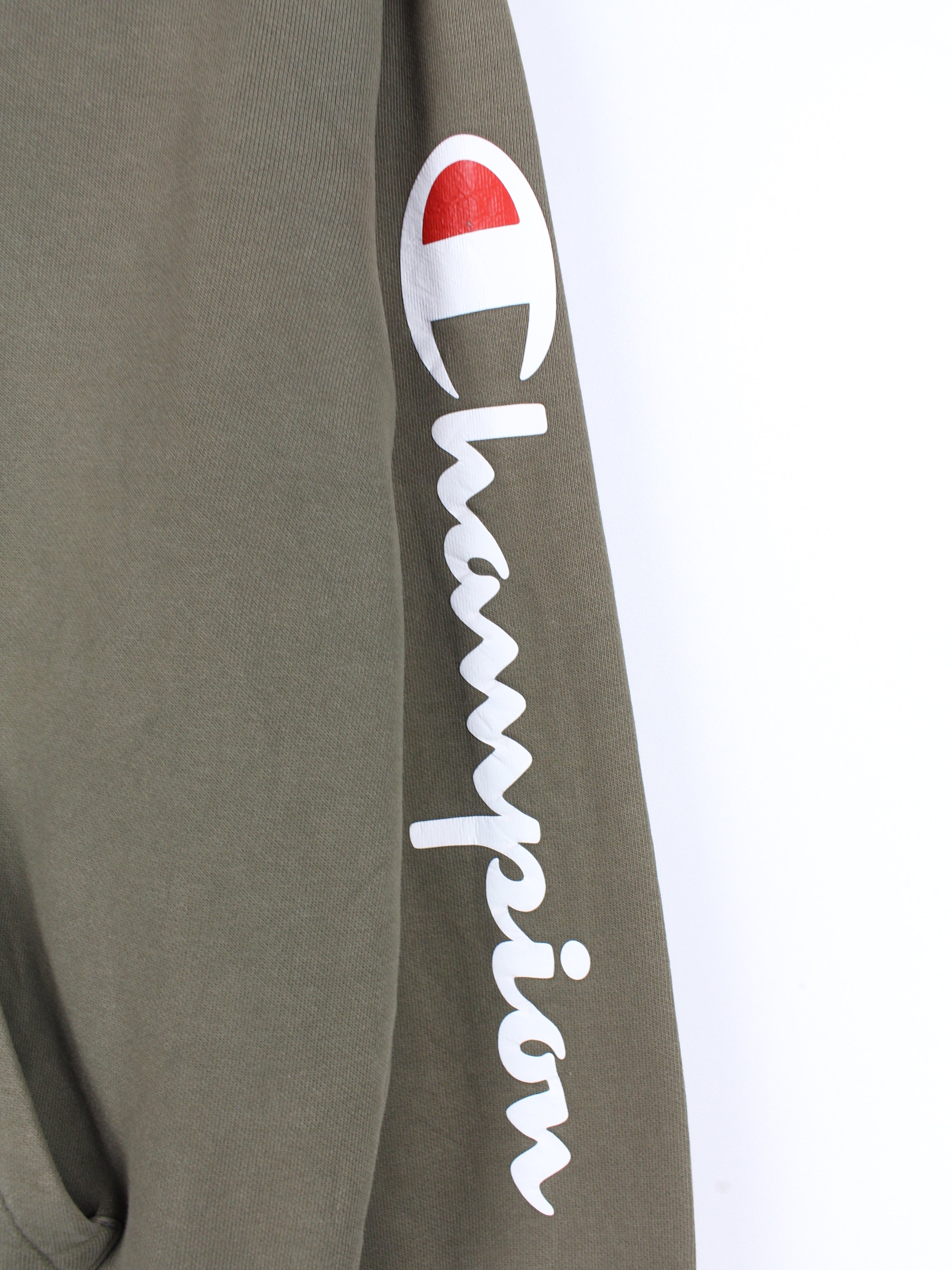 Olive-colored hoodie from the Champion brand, with a print on the sleeve.