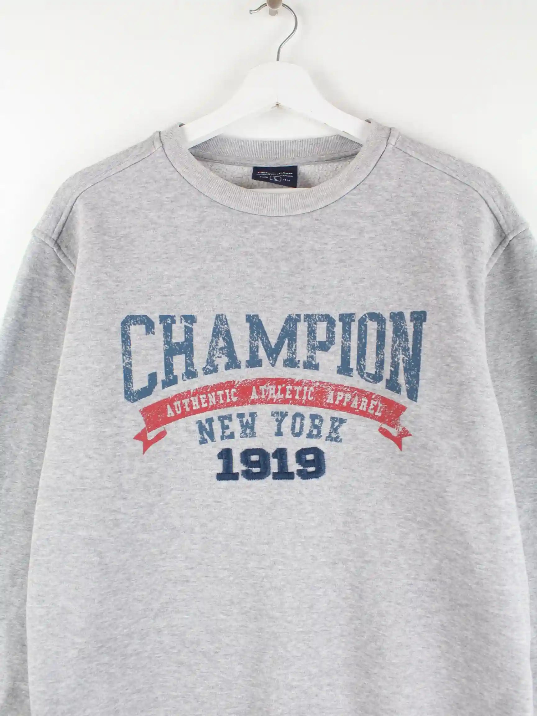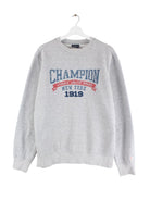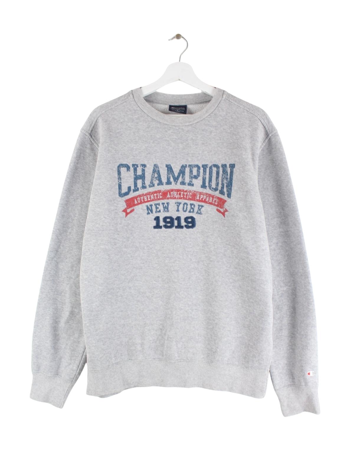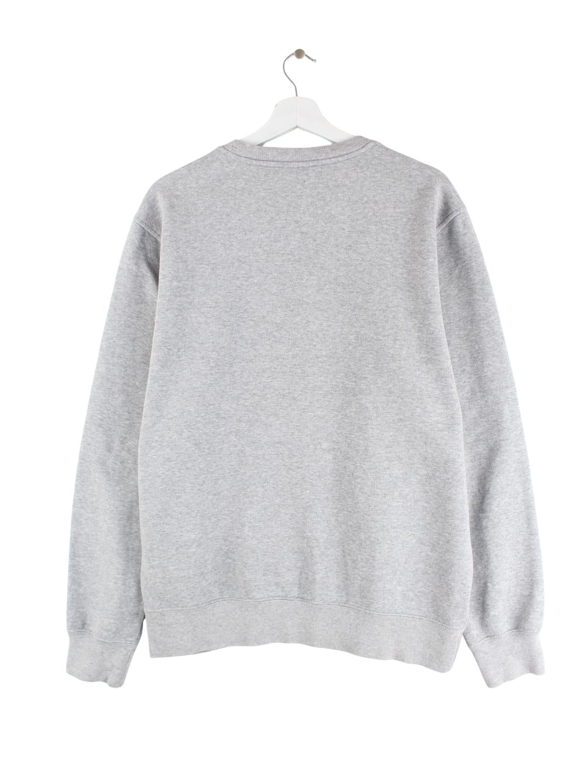 Grauer Sweater der Marke Champion in Größe L. Er ist aus einer Baumwollmischung angefertigt und in sehr gutem Zustand lieferbar. Mit großem Print auf der Brust.