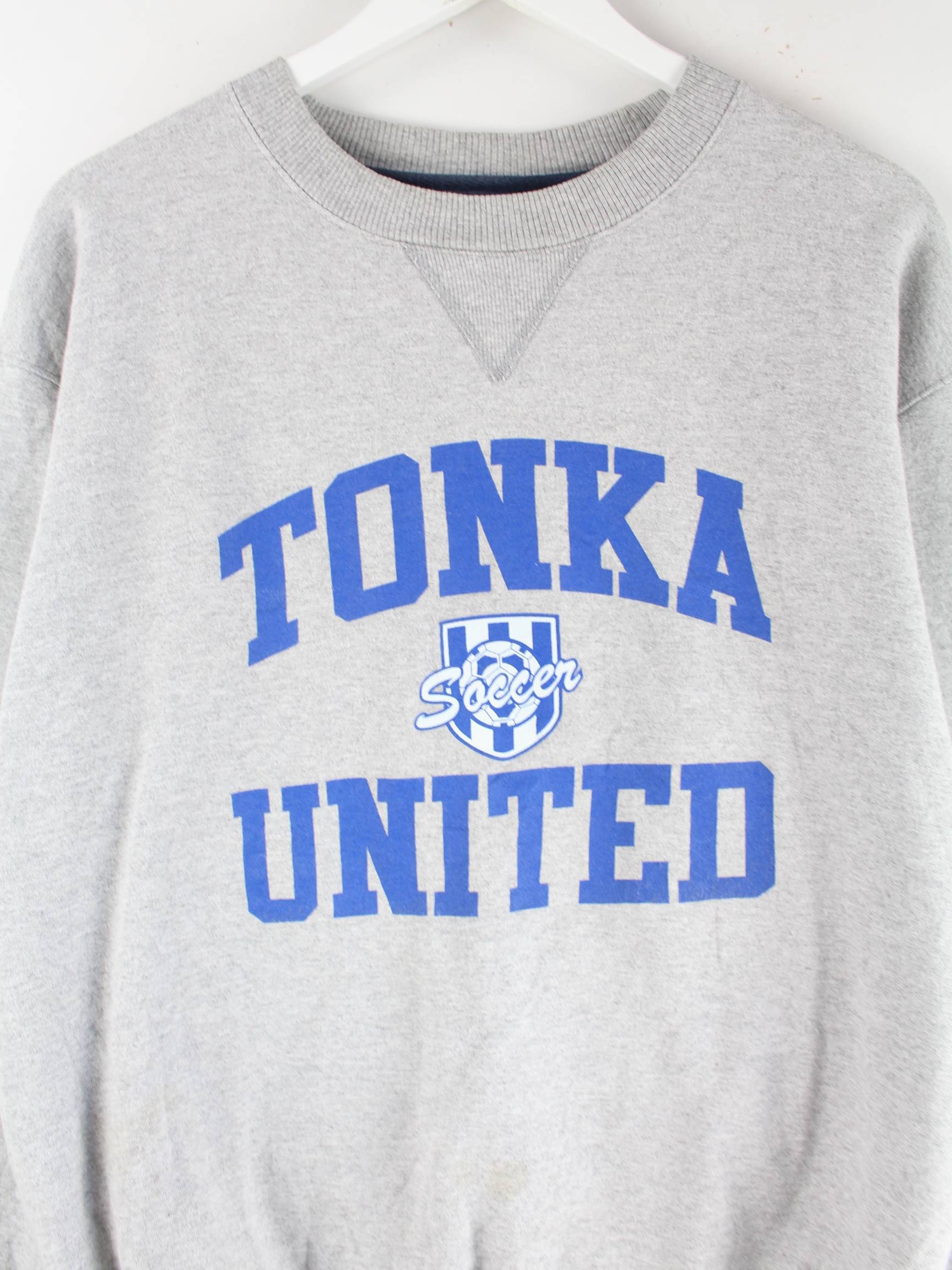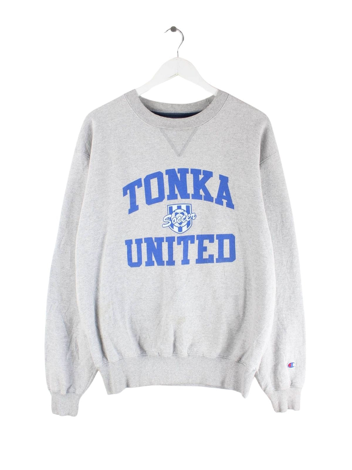 Sweater der Marke Champion in Größe M. Er ist aus einer Baumwollmischung angefertigt und in Grau in Stock. Mit schickem United Print.