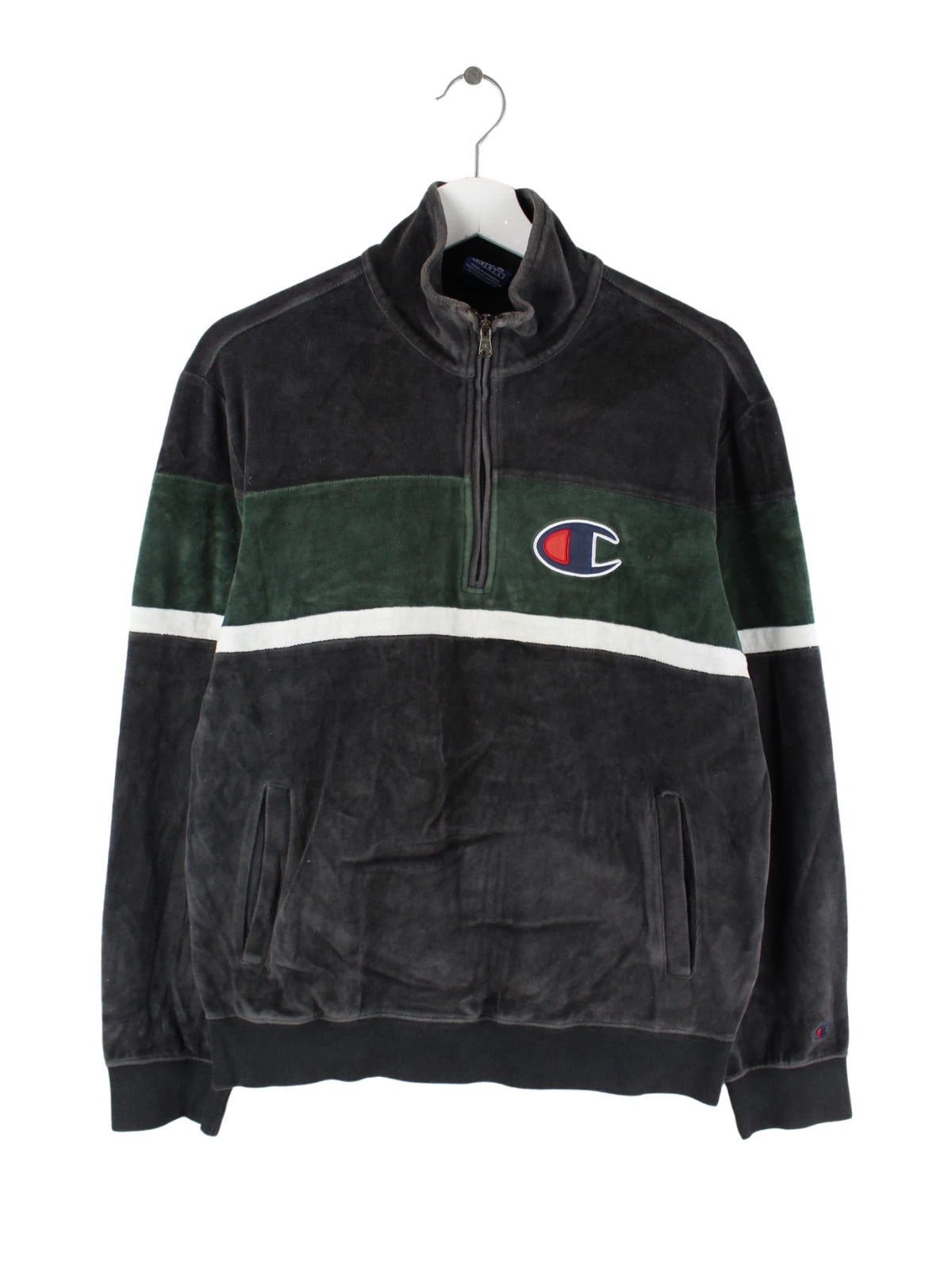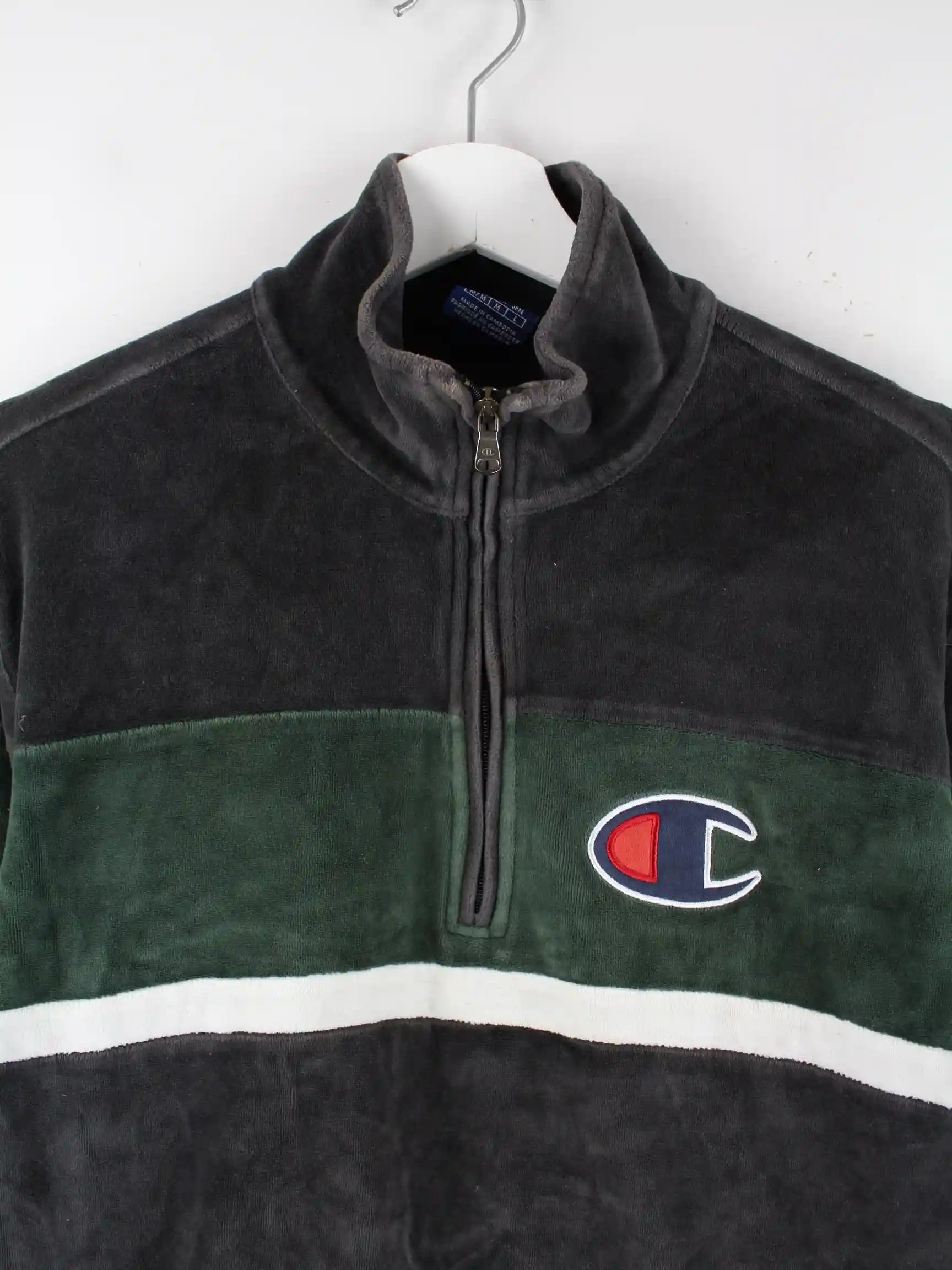 Grauer Sweater mit kurzem Reißverschluß von Champion in Größe M. Er ist aus Synthetik gemacht und in sehr gutem Zustand bei uns zu bekommen.