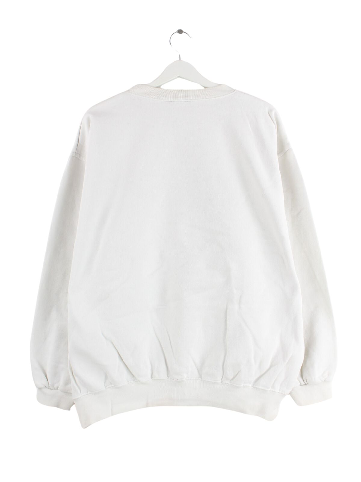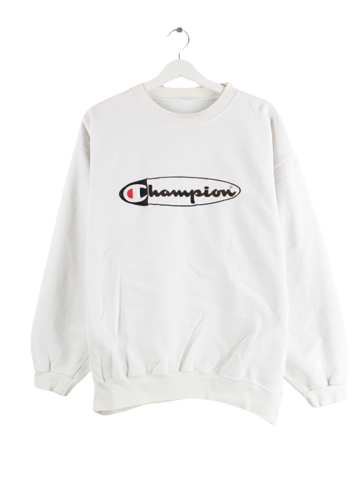White sweater with embroidered logo from Champion from the early 2000's in size L. It is made of a cotton blend and is in good condition in stock.