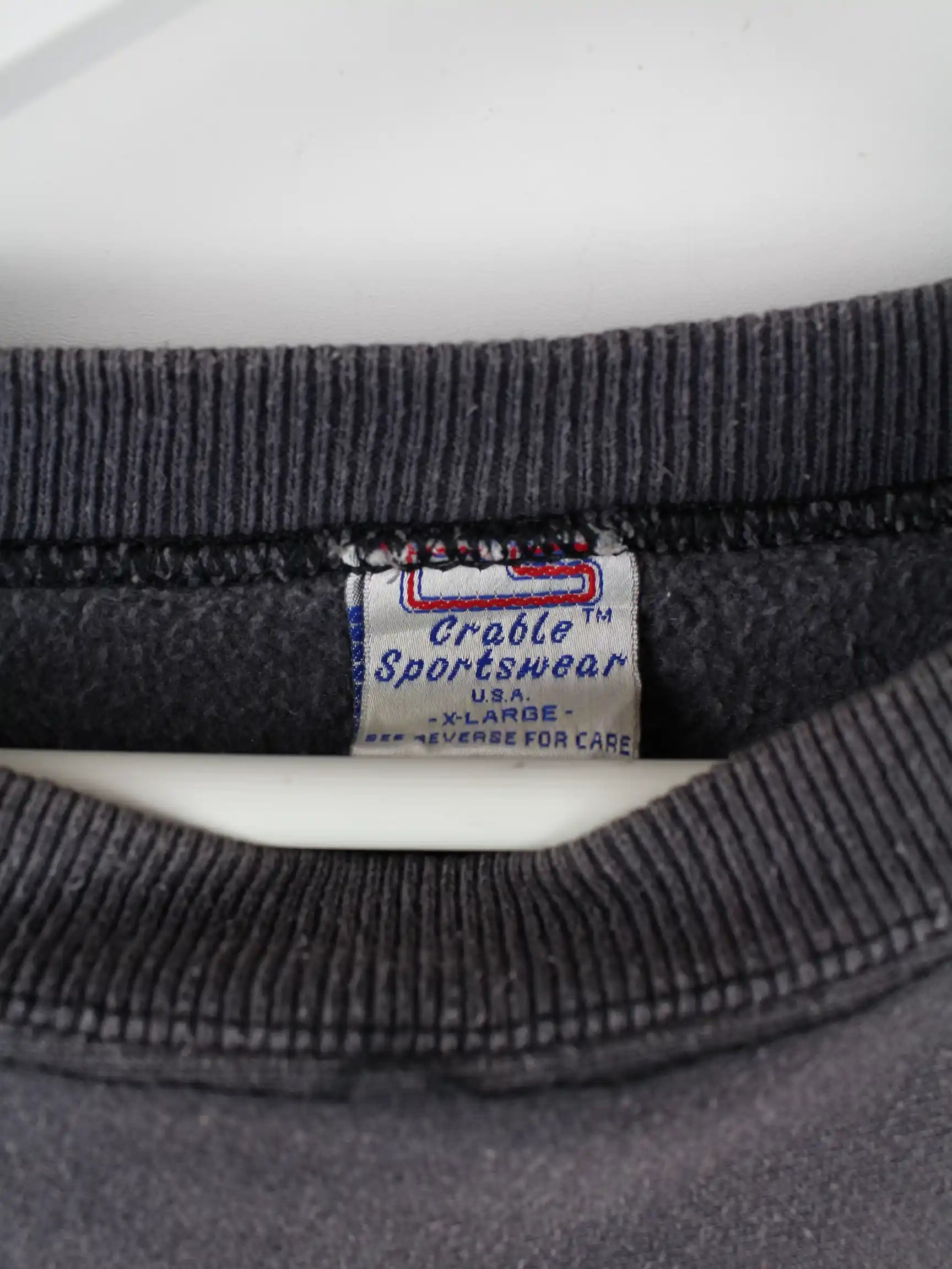 Grauer Sweater mit Stick der Brand Crable Sportswear aus den 90'ern in Größe XL. Er ist aus einer Baumwollmischung gefertigt und in gutem Zustand bei uns zu bekommen.