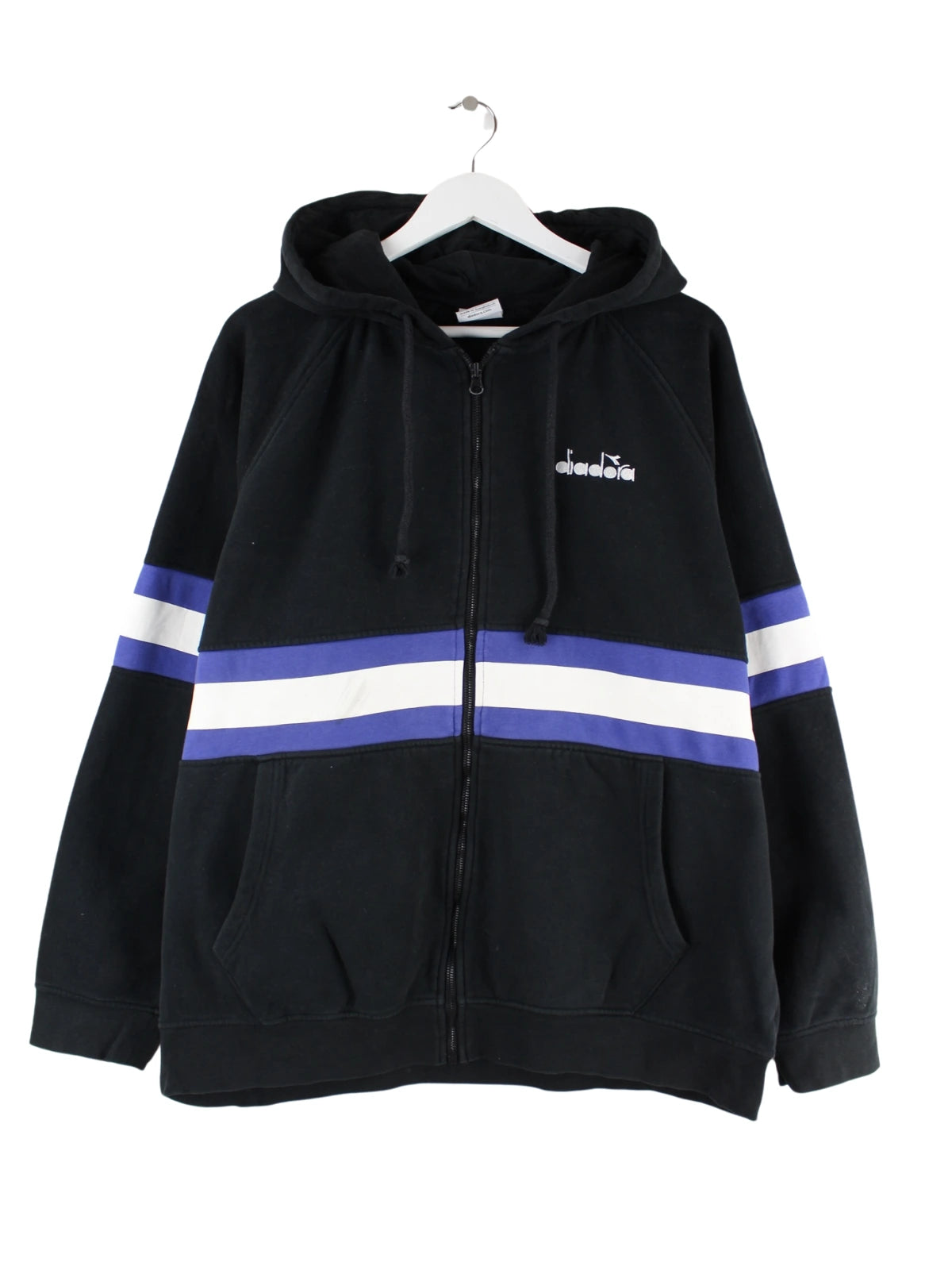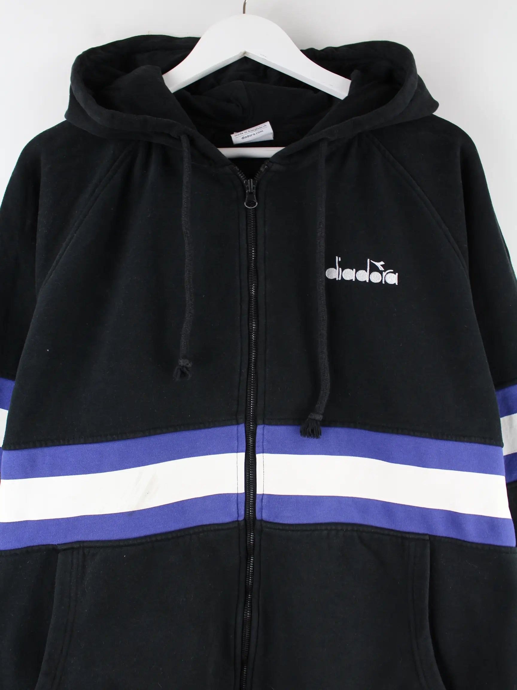 Hoodie der Brand Diadora mit gestickten Motiven und Zip in Größe XL. Er ist aus einer Baumwollmischung gemacht und in Schwarz vorrätig.