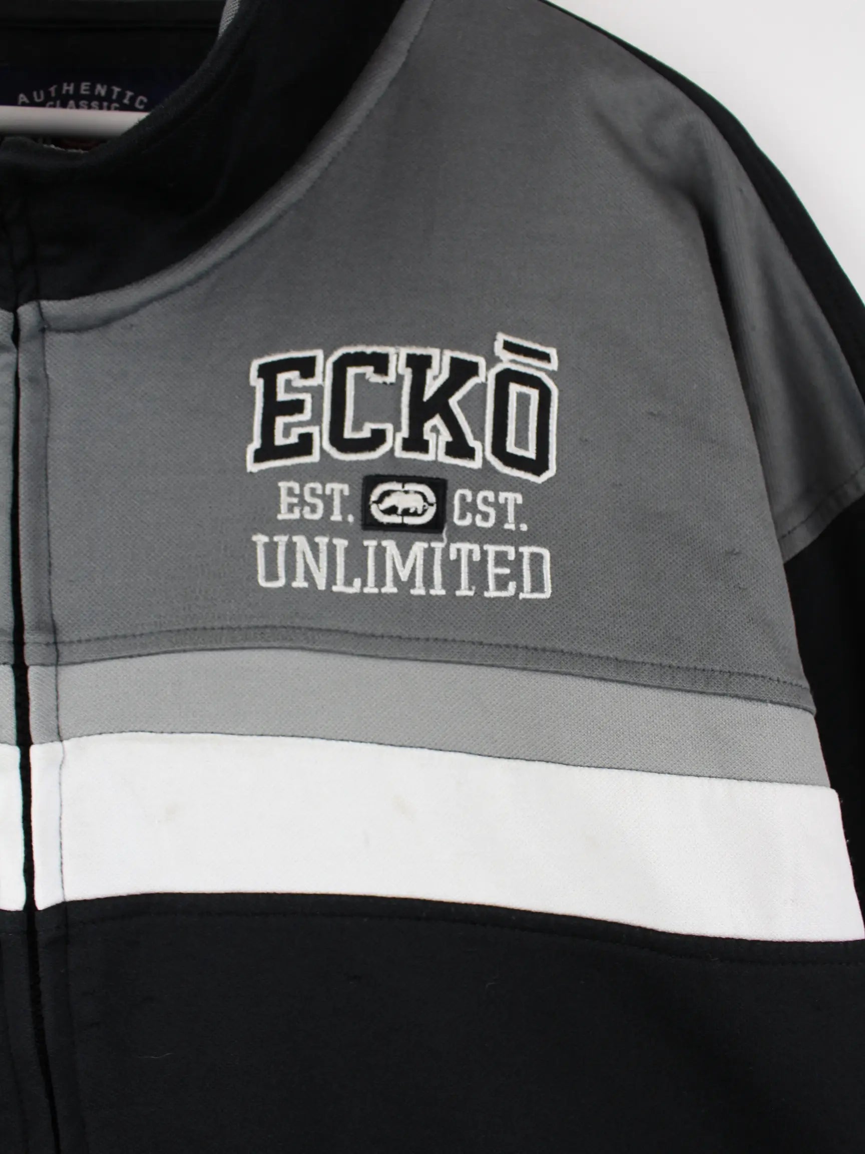 Schwarze Trainingsjacke der Brand Ecko aus Anfang der 2000'er in Größe XXL. Sie ist aus Synthetik hergestellt und in gutem Zustand auf Lager.